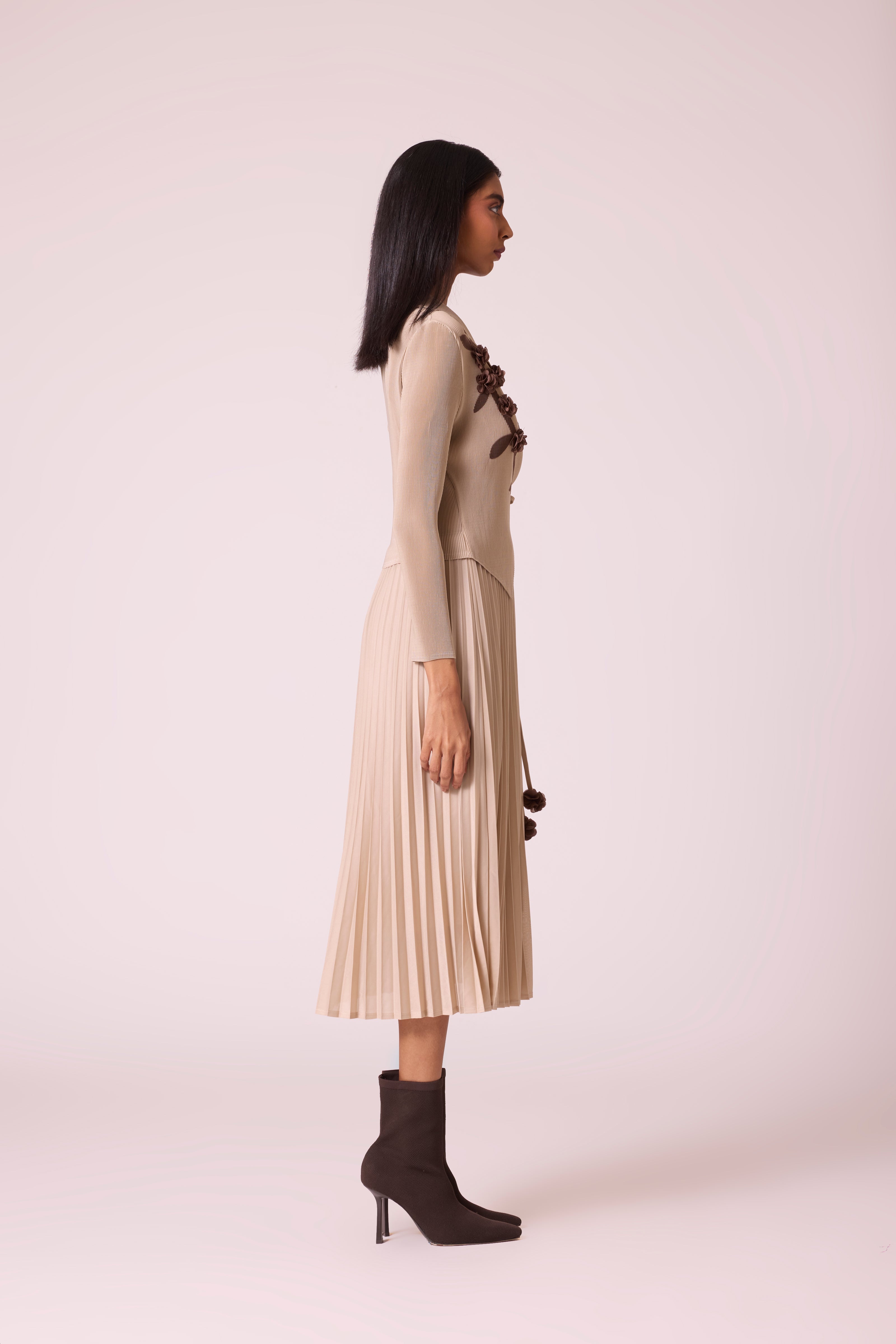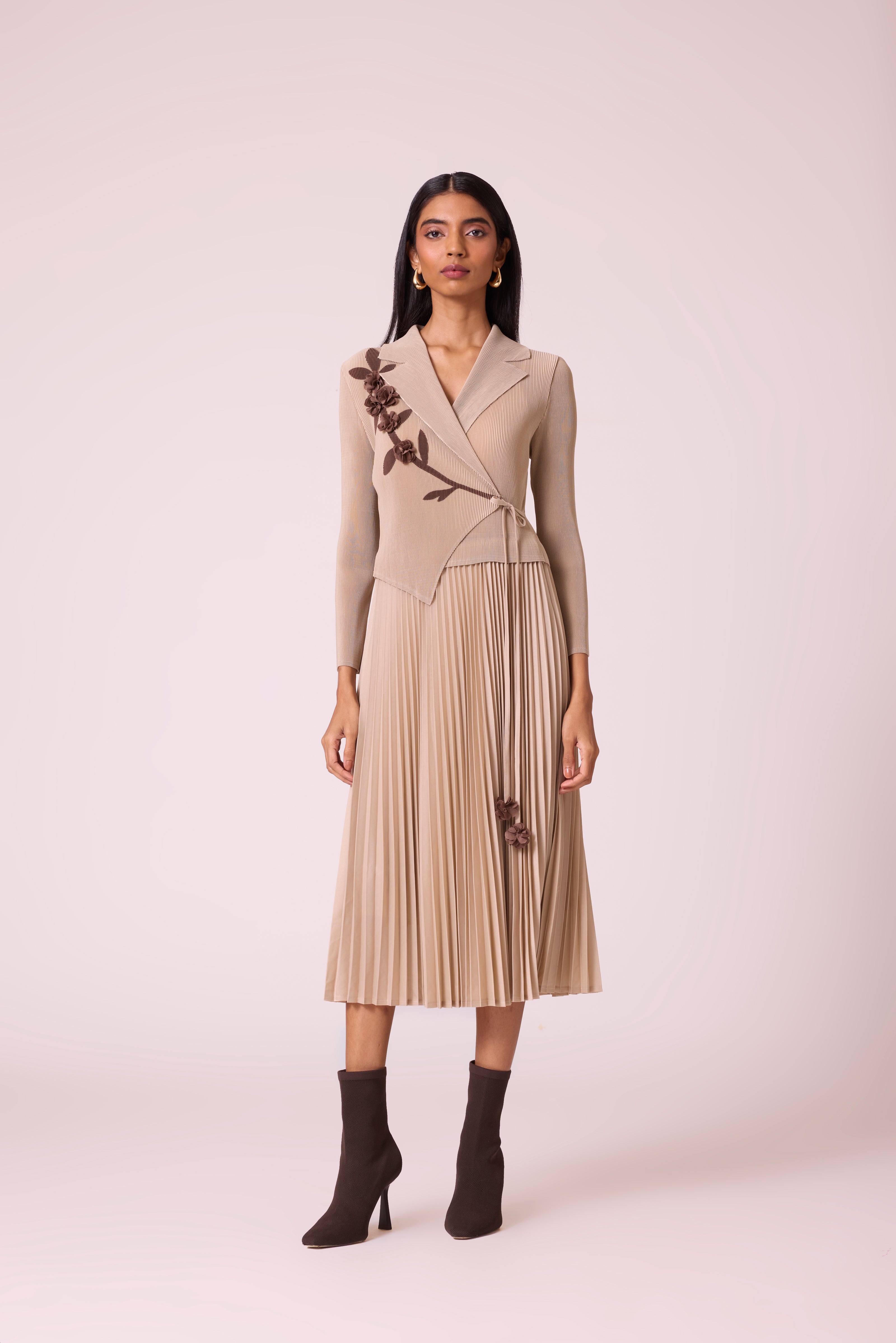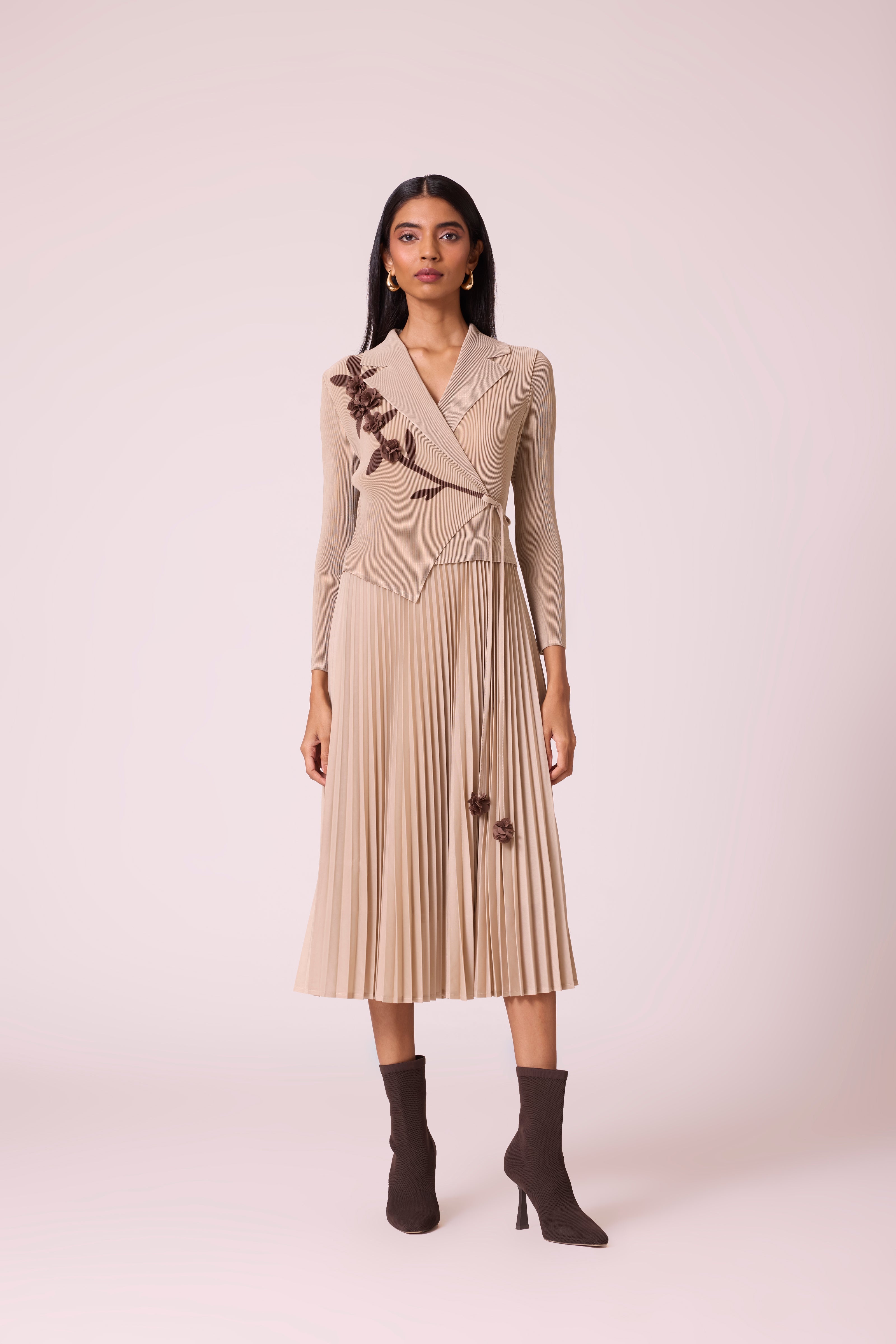 A tailored wrap bodice detailed with soft floral appliqué attached to an accordion pleated skirt. The classic midi dress can work a formal meeting or a luncheon.