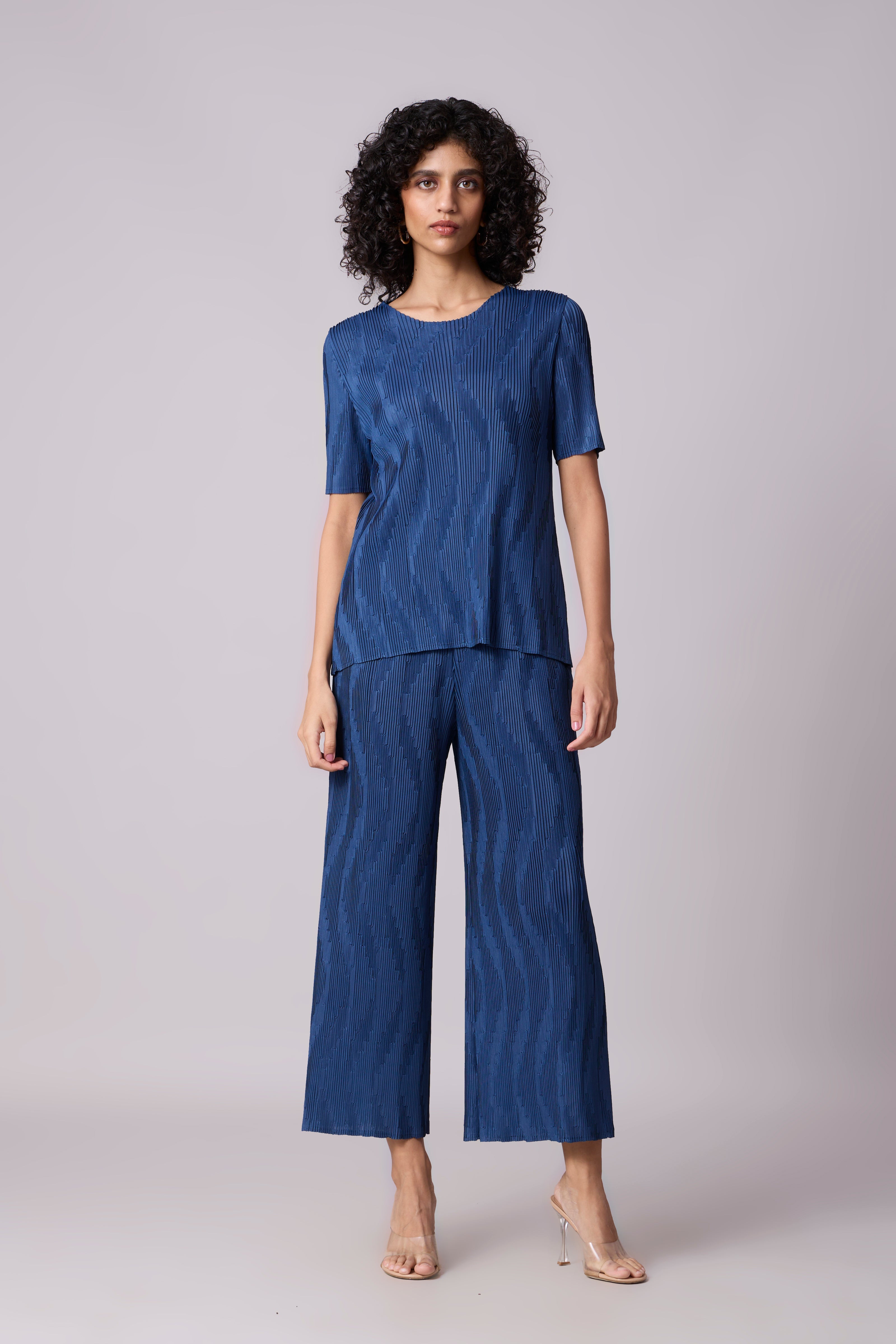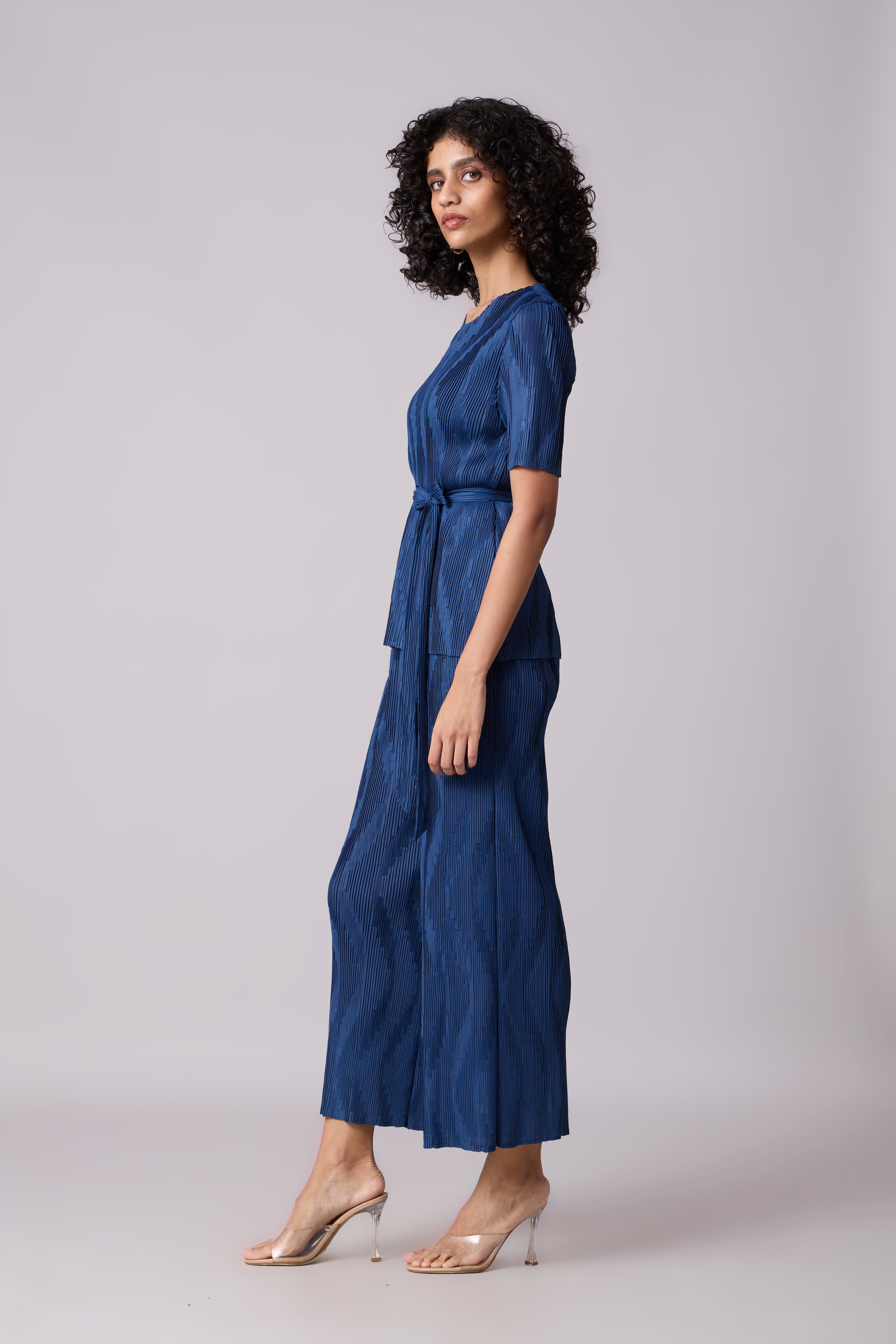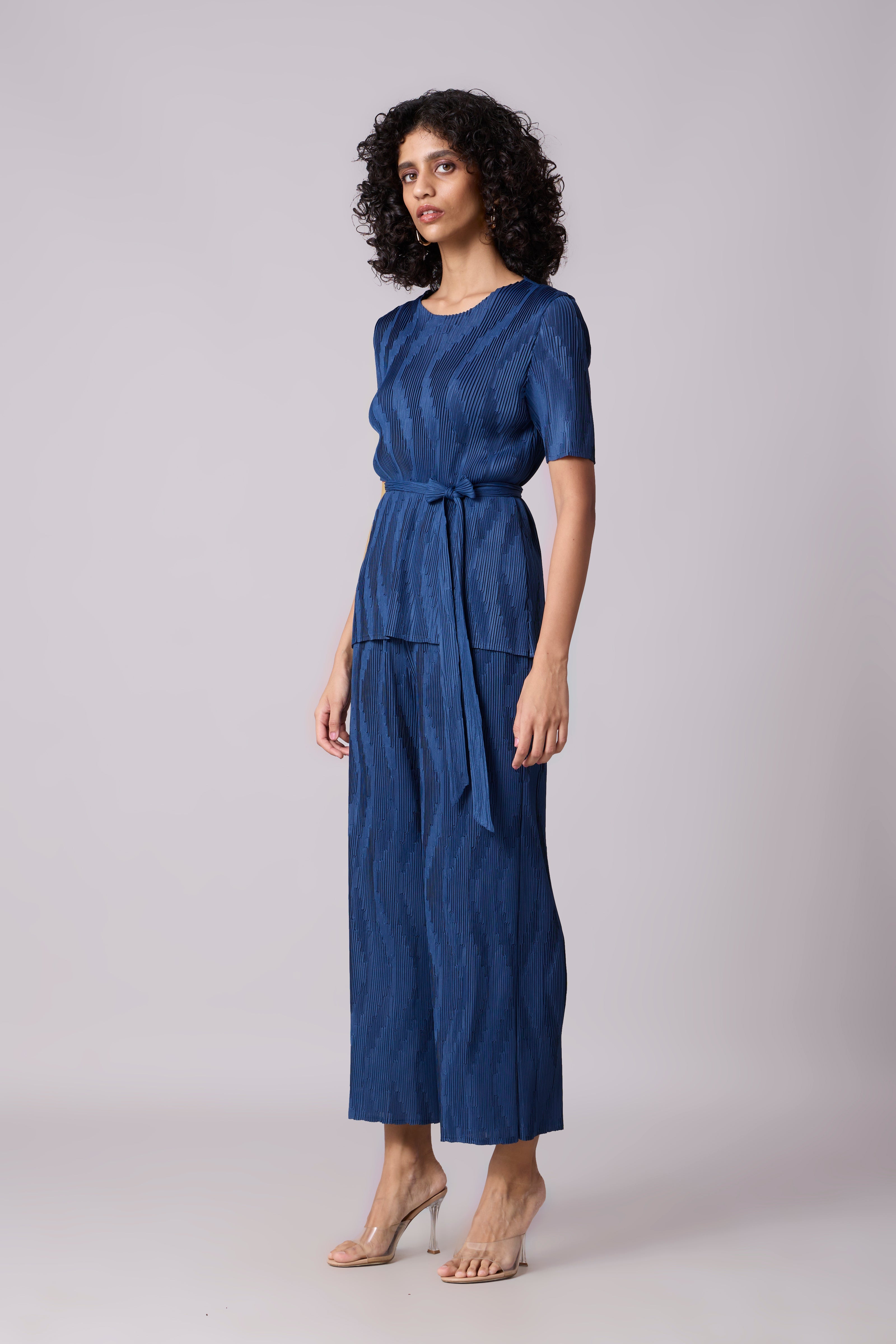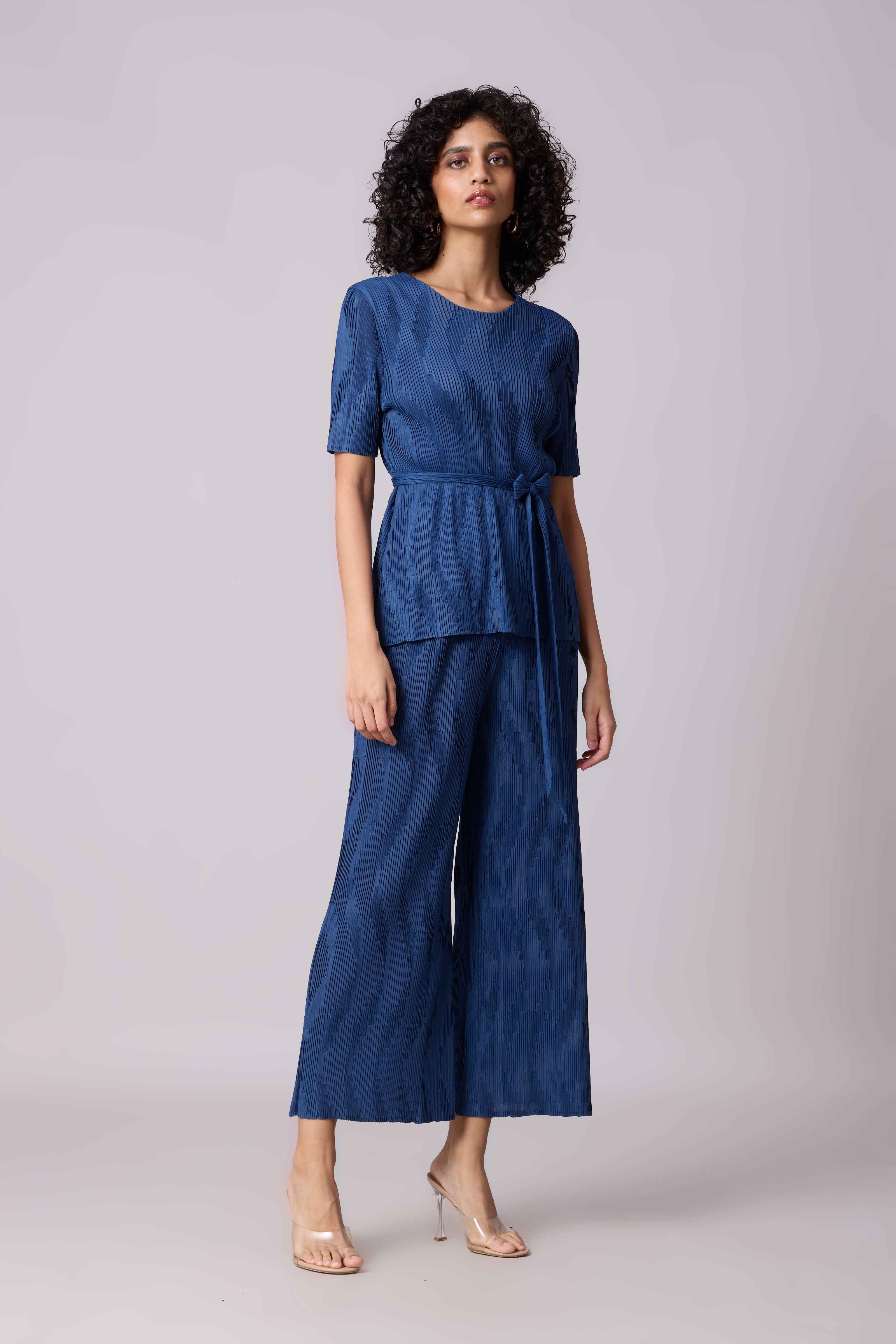 A pleated monochrome co-ord set with texture allover paired with matching straight pants. Comes with self fabric belts.