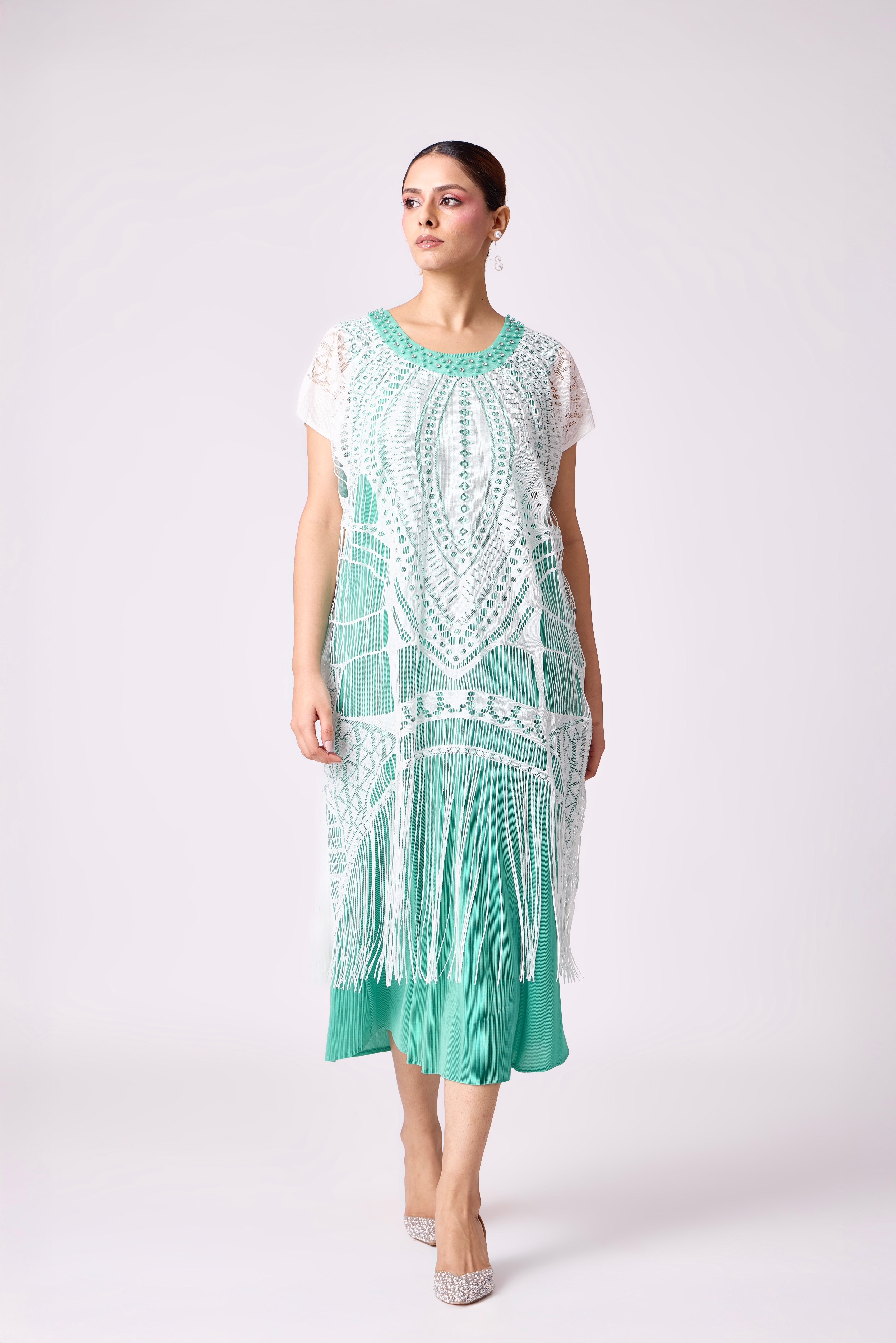 A statement midi dress featuring a lace overlay, short sleeves, and a fringed hem over a contrast inner layer.