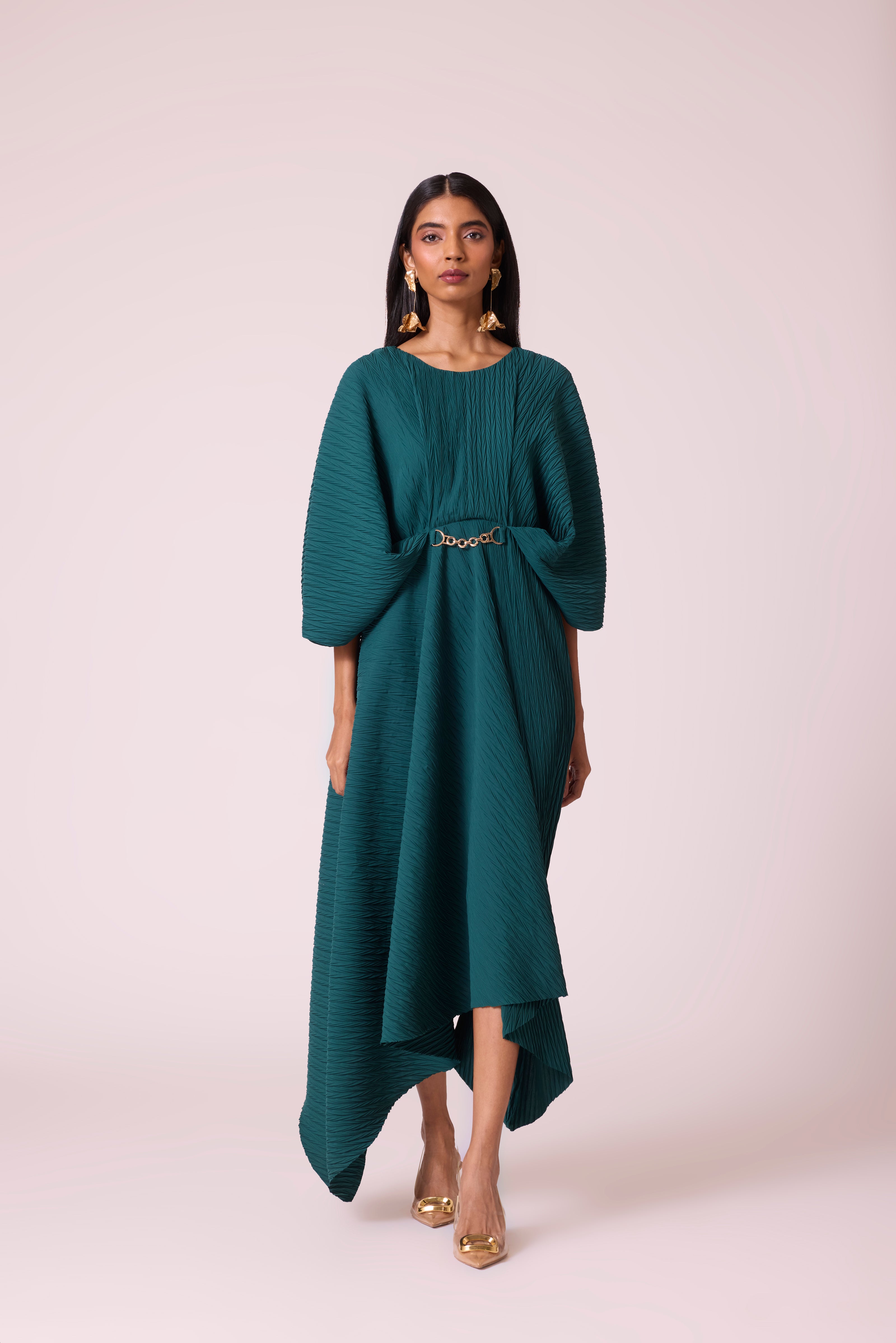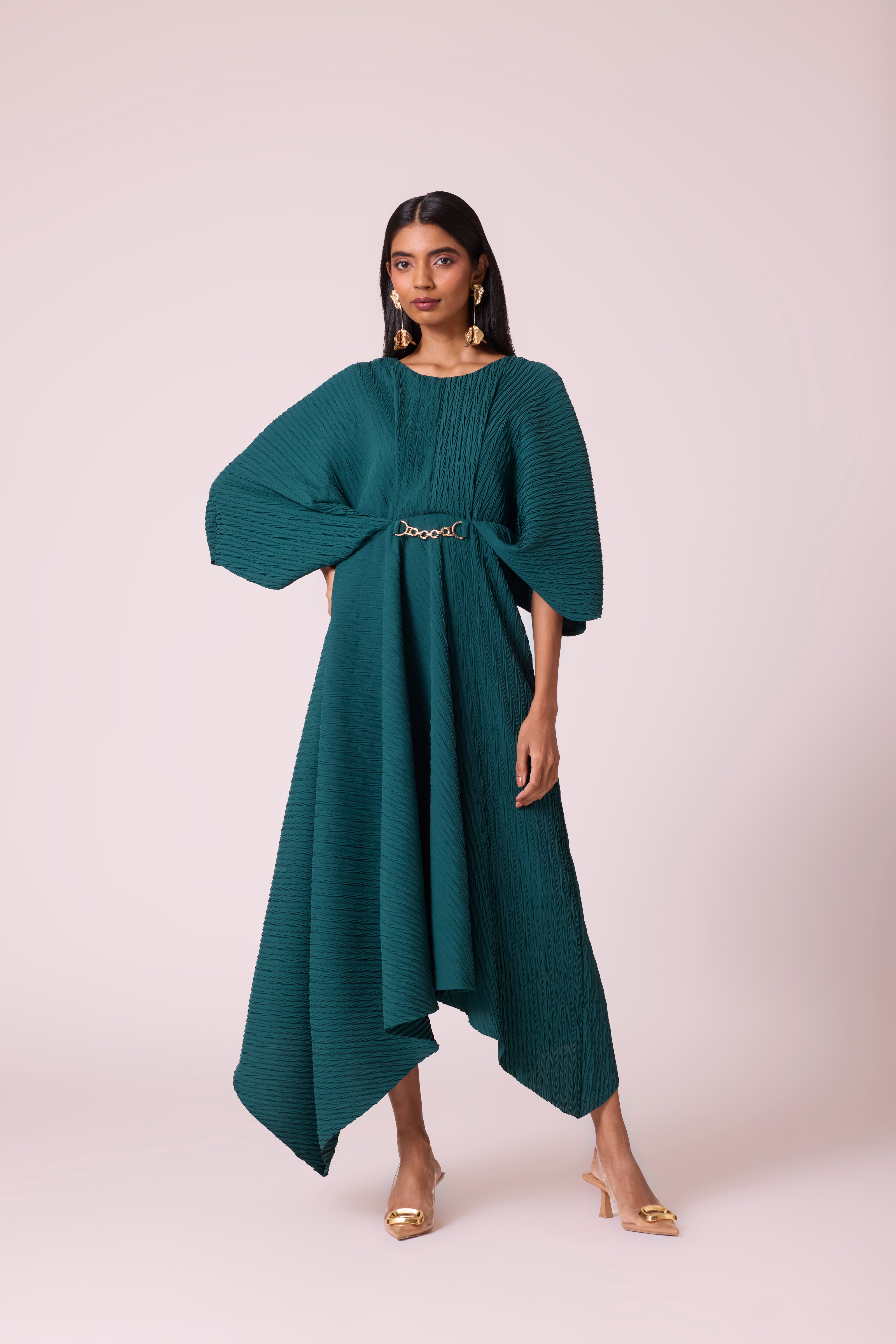 Kaftan style Bodice with princess line pleats, A gently cinched waist and a a sliming bias cut handkerchief hem which moves with you. A metal buckle accentuates the waist line.