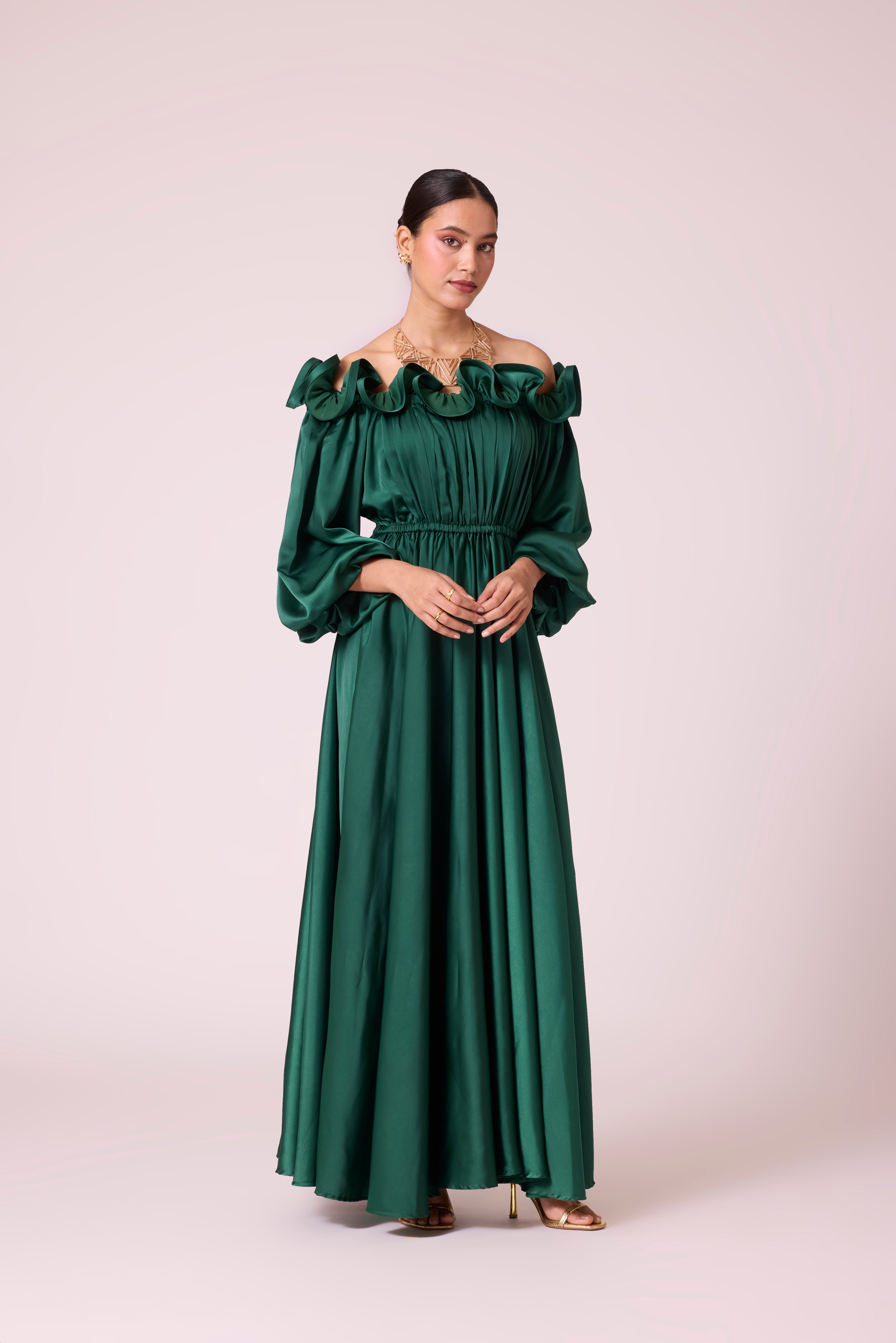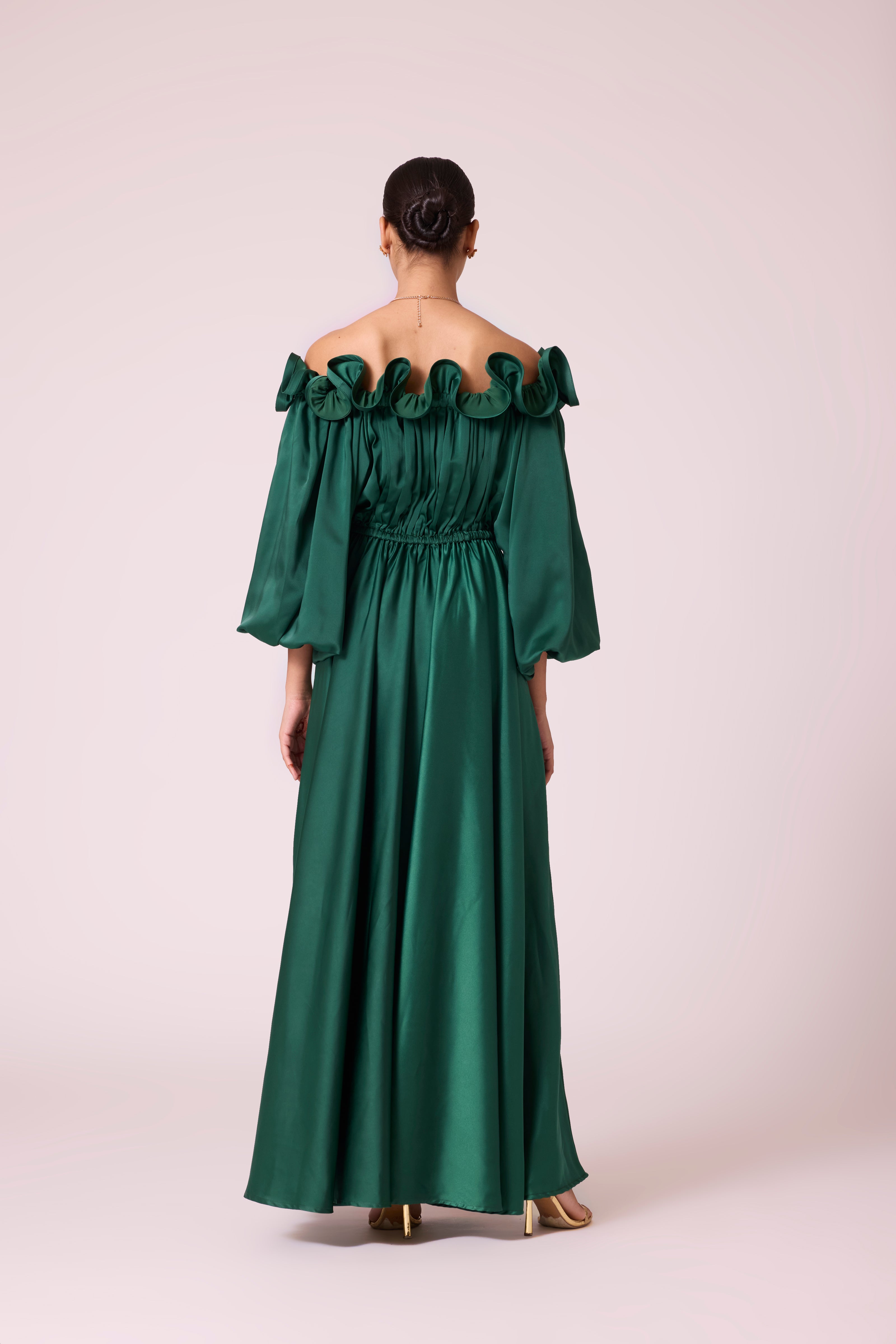 A statement full skirted satin maxi dress featuring structured ruffled off shoulder detailing over a naturally pleated elasticated bodice.