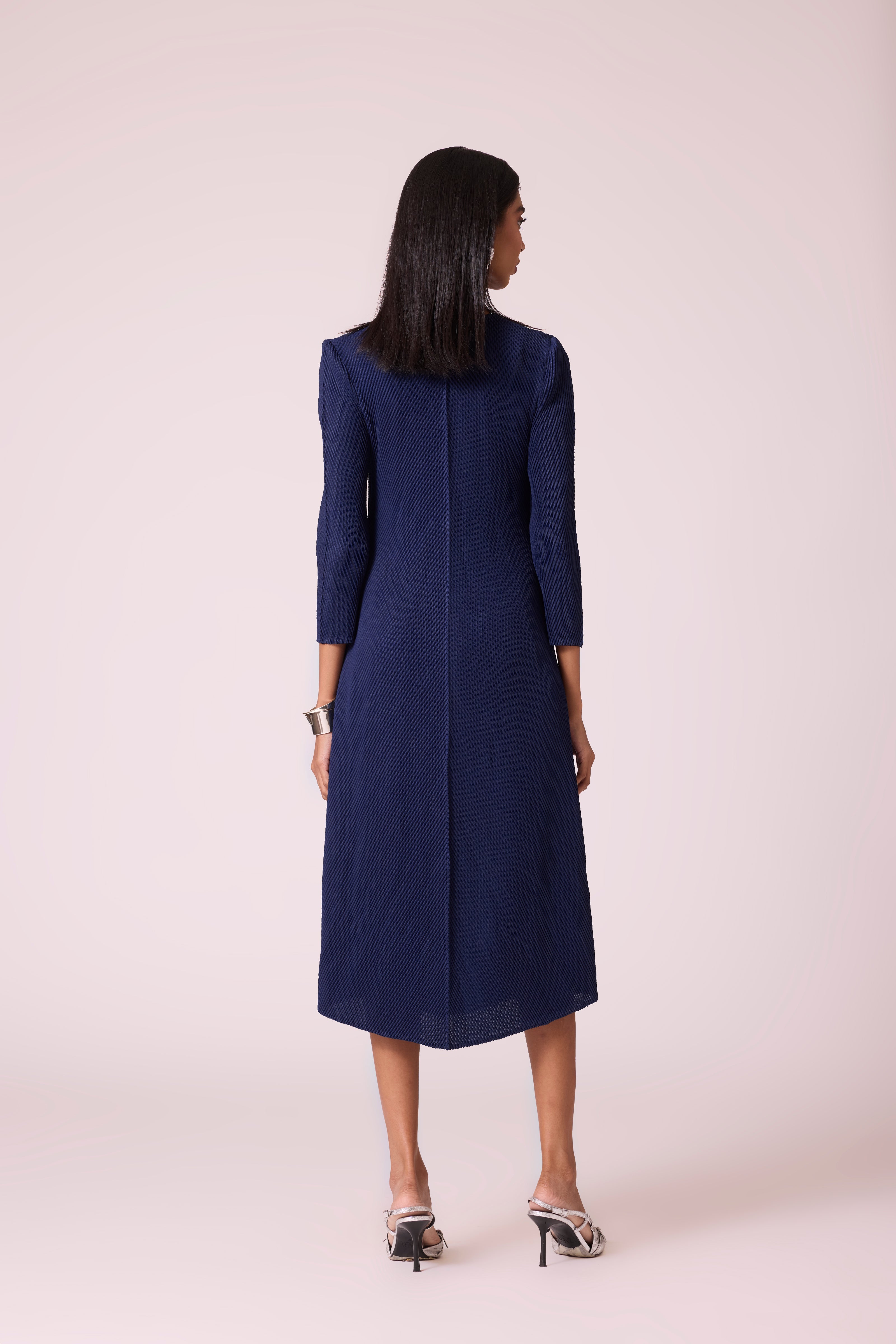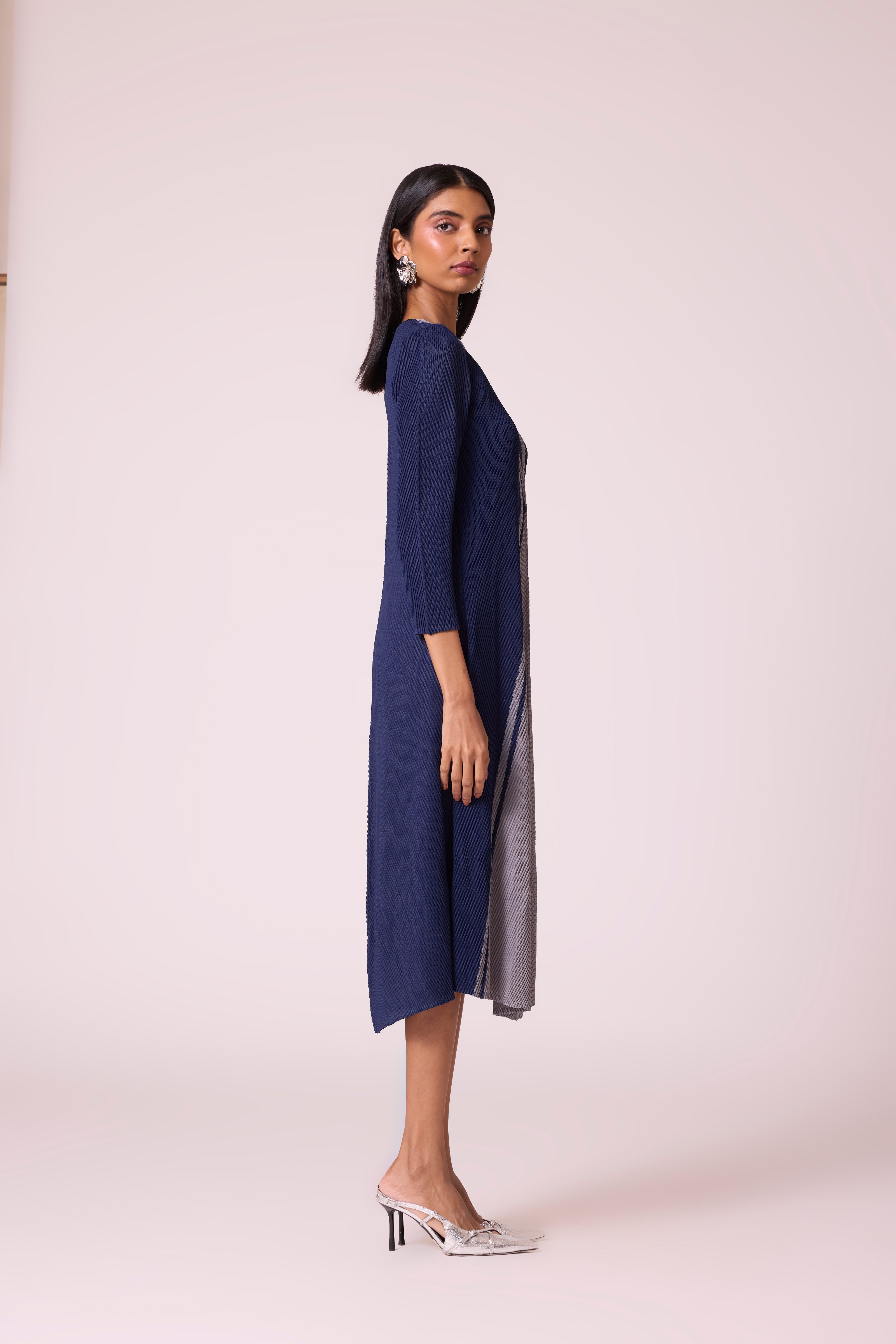 A line tonal dress with an aesthetic placement print of light and dark colors to create a slimming look. Comes with a navy slim belt for those who prefer a cinched look.