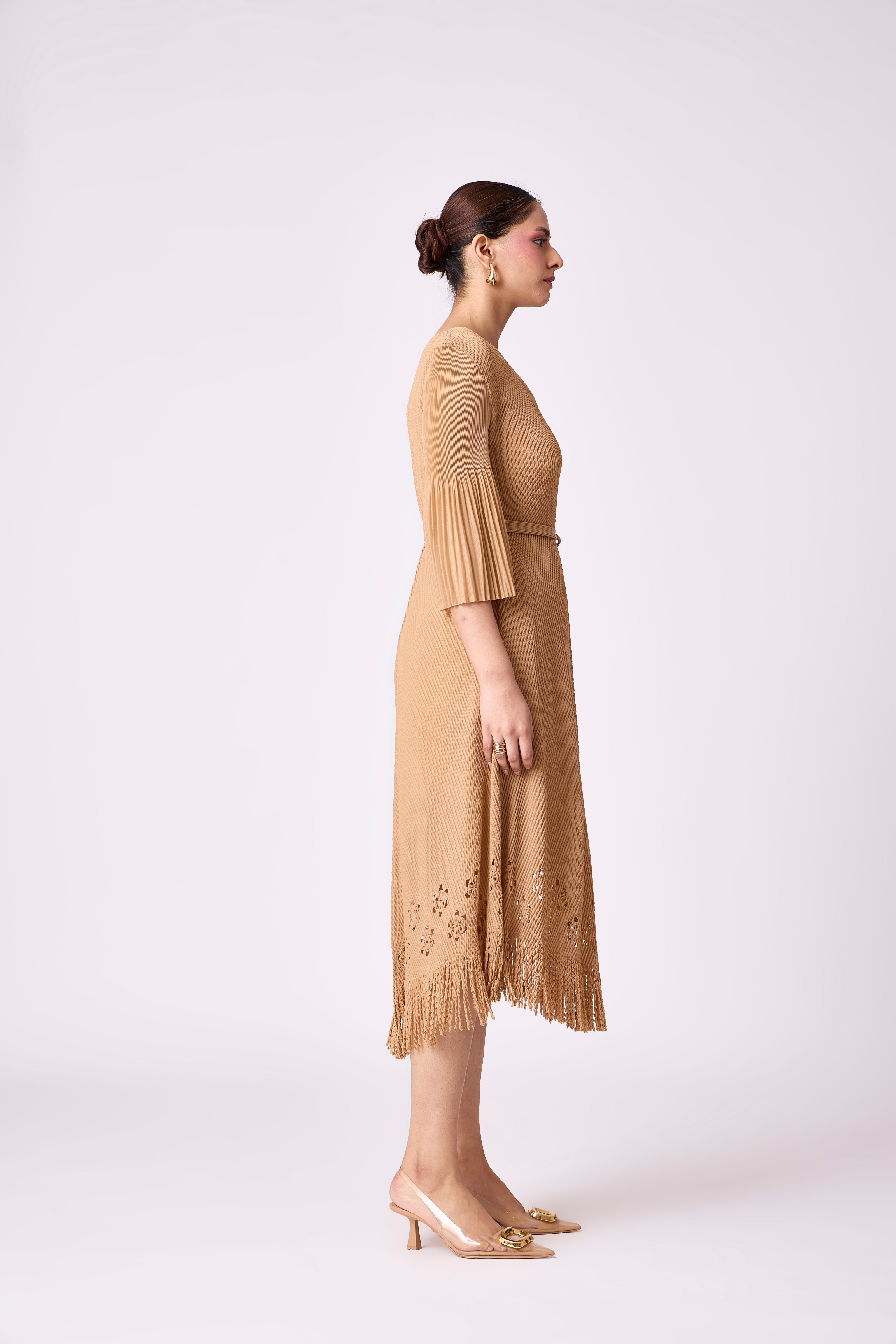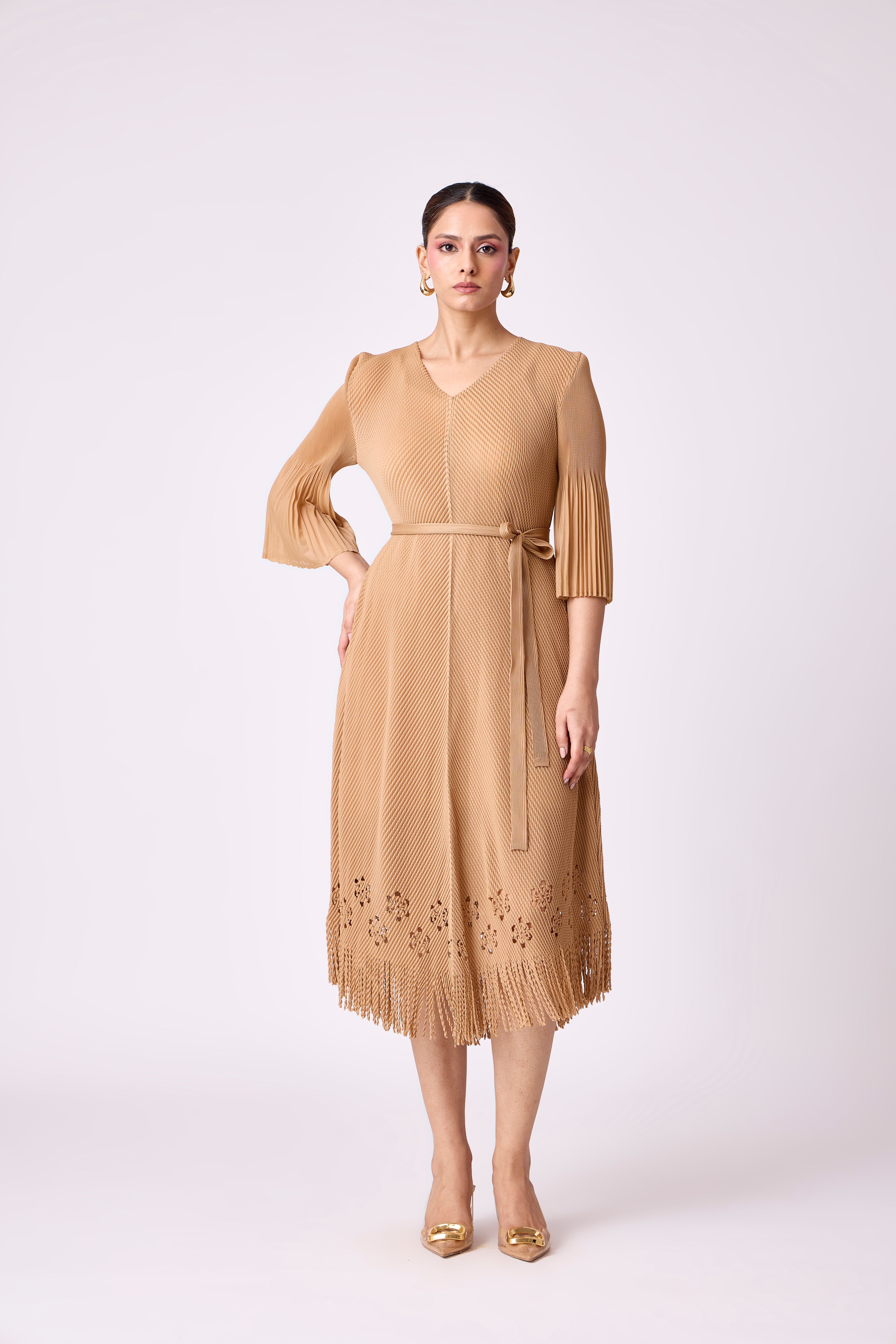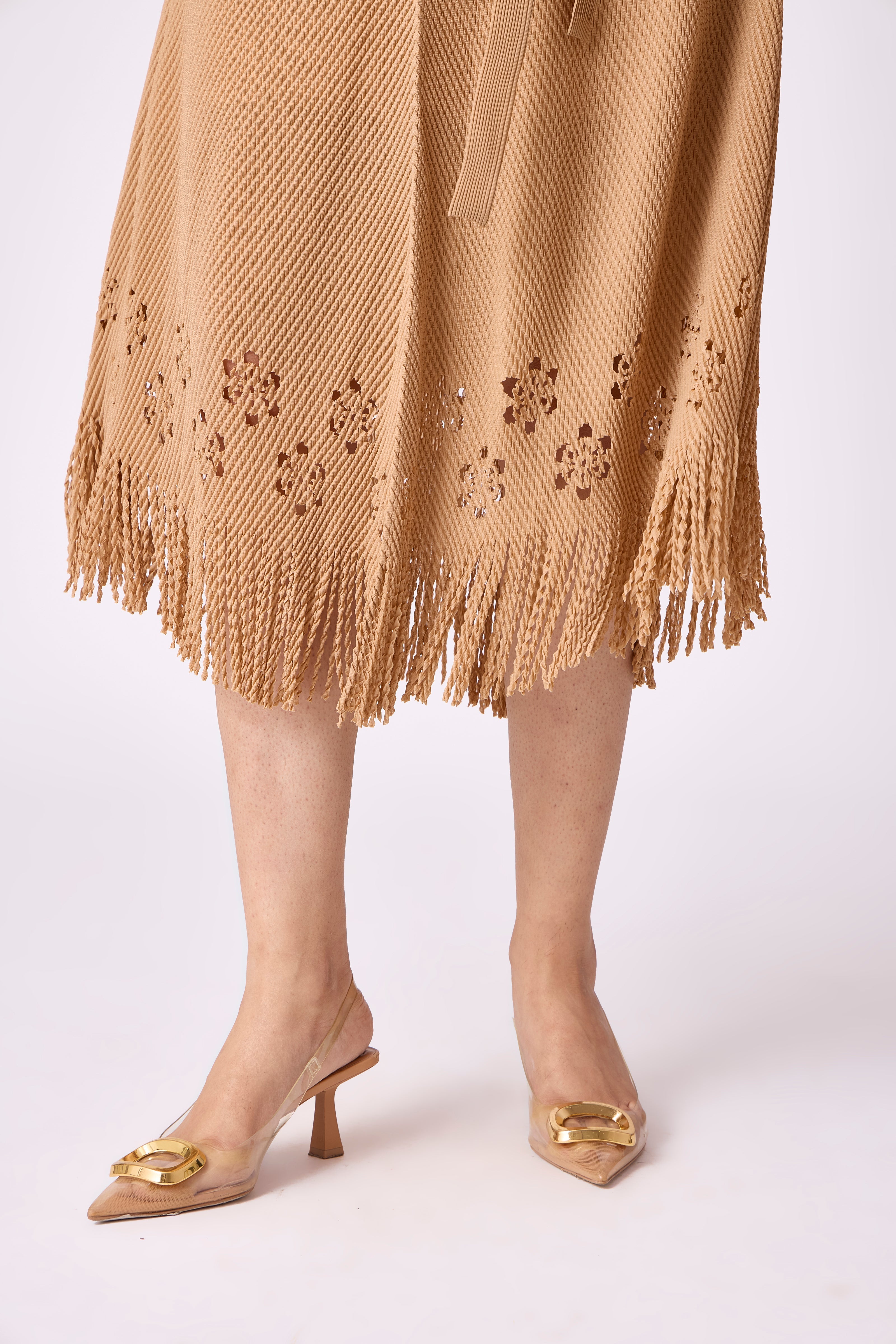 An A-line sundress featuring a laser cutwork hem enhanced with fringe detailing. Comes with same fabric belt for those who prefer a cinched look.