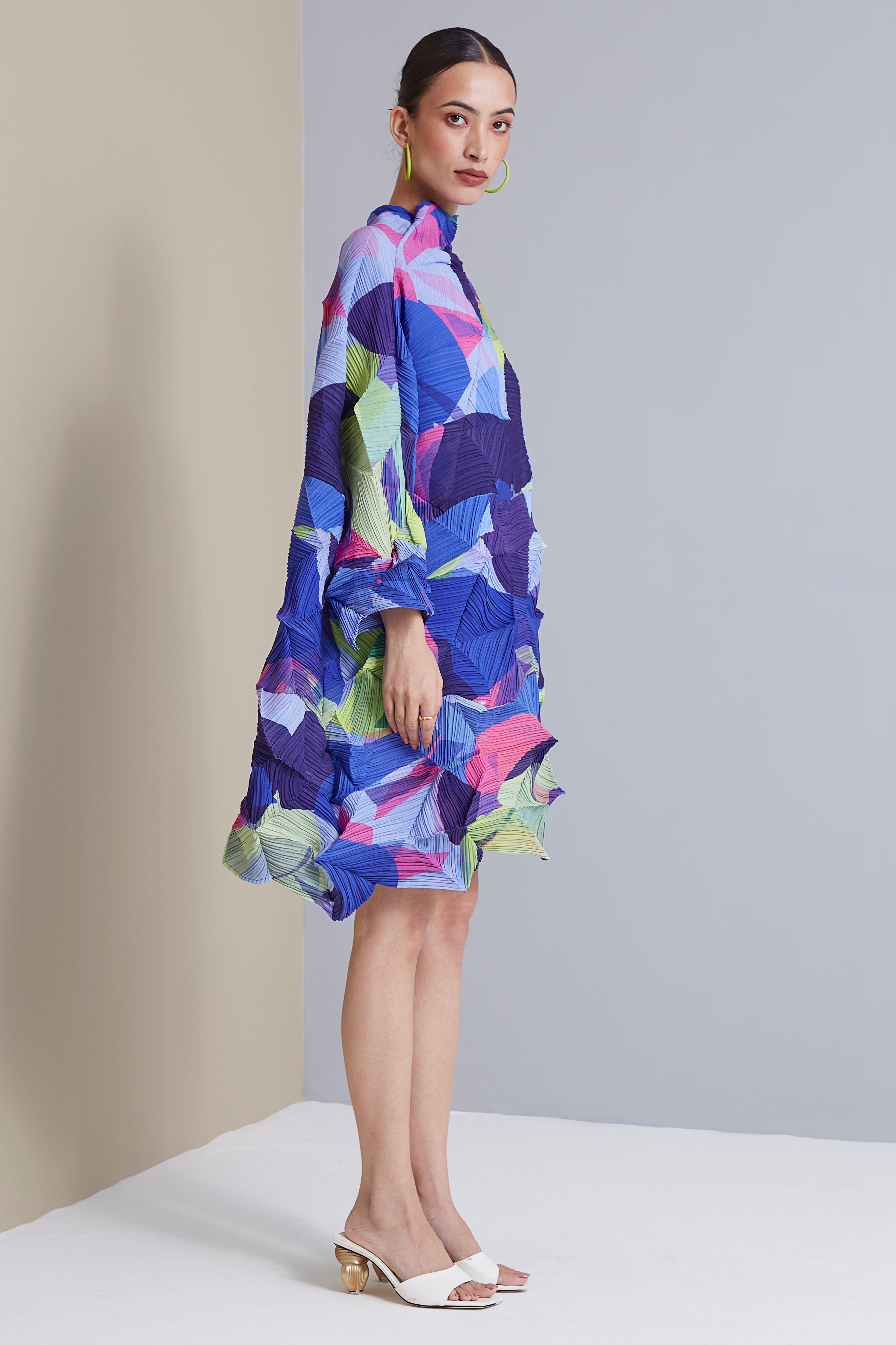 An Innovative 3D pleating technique on a lightweight fabric makes this a statement top in a multi-colored abstract print, which can be styled with a belt or your go-to denim.
