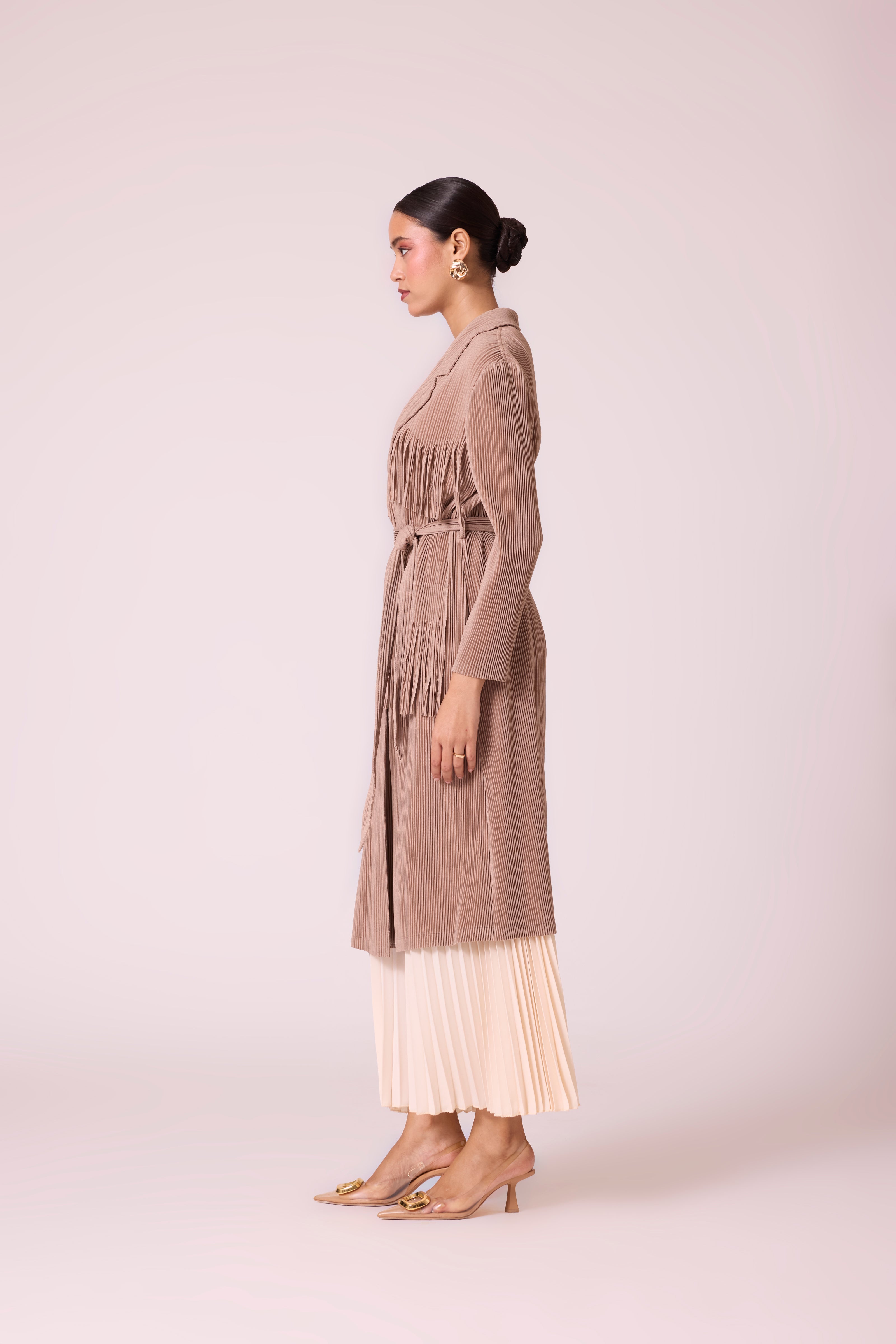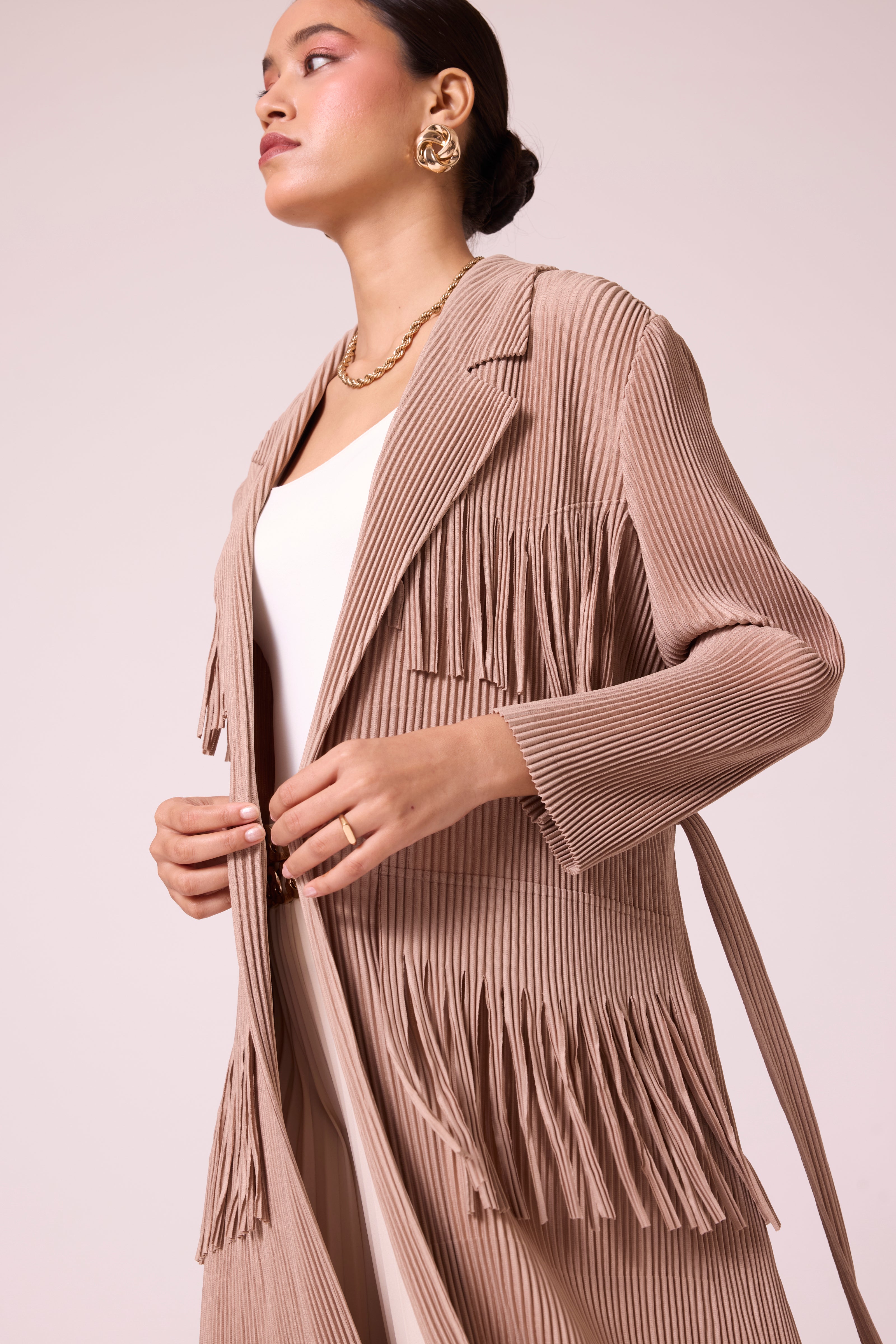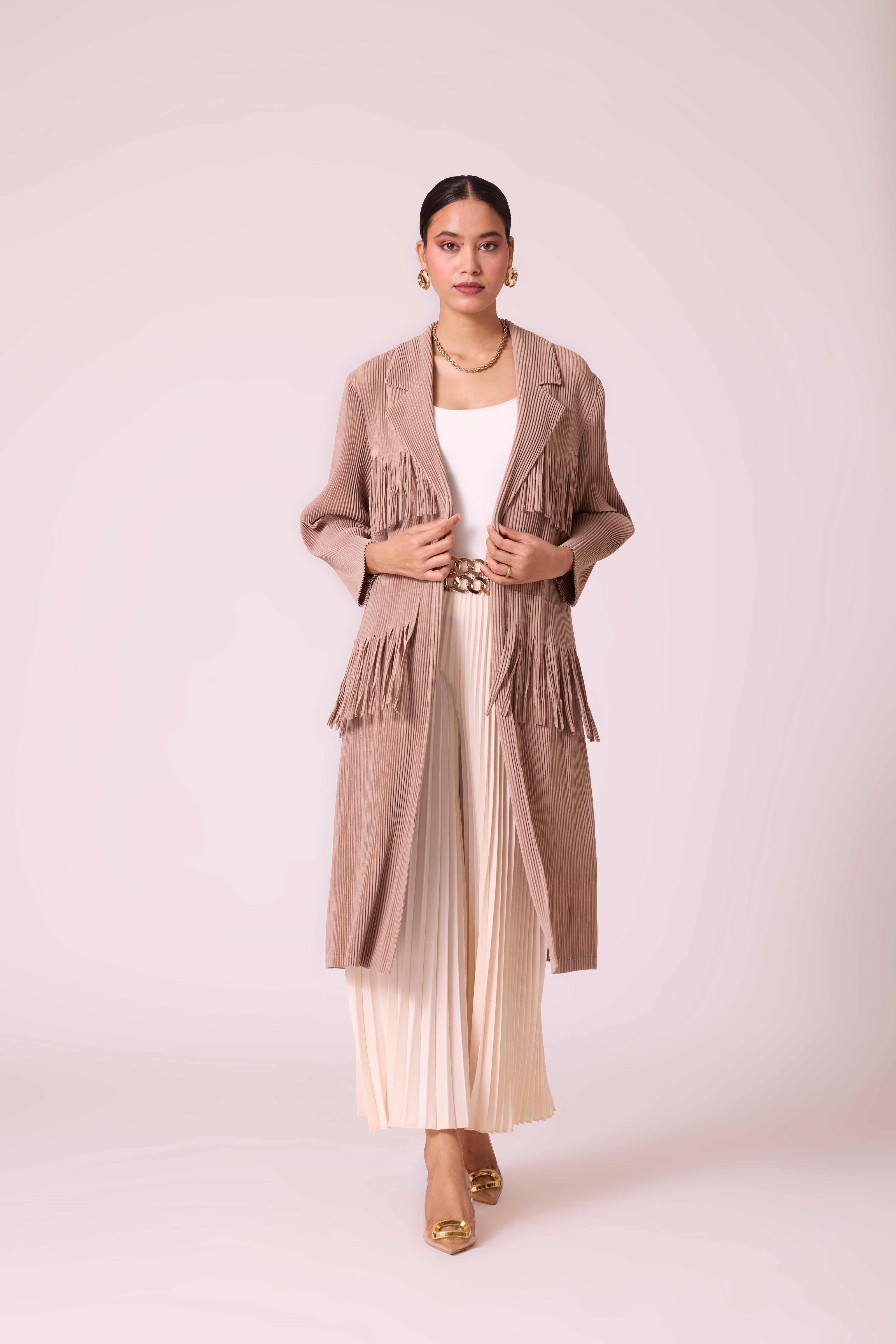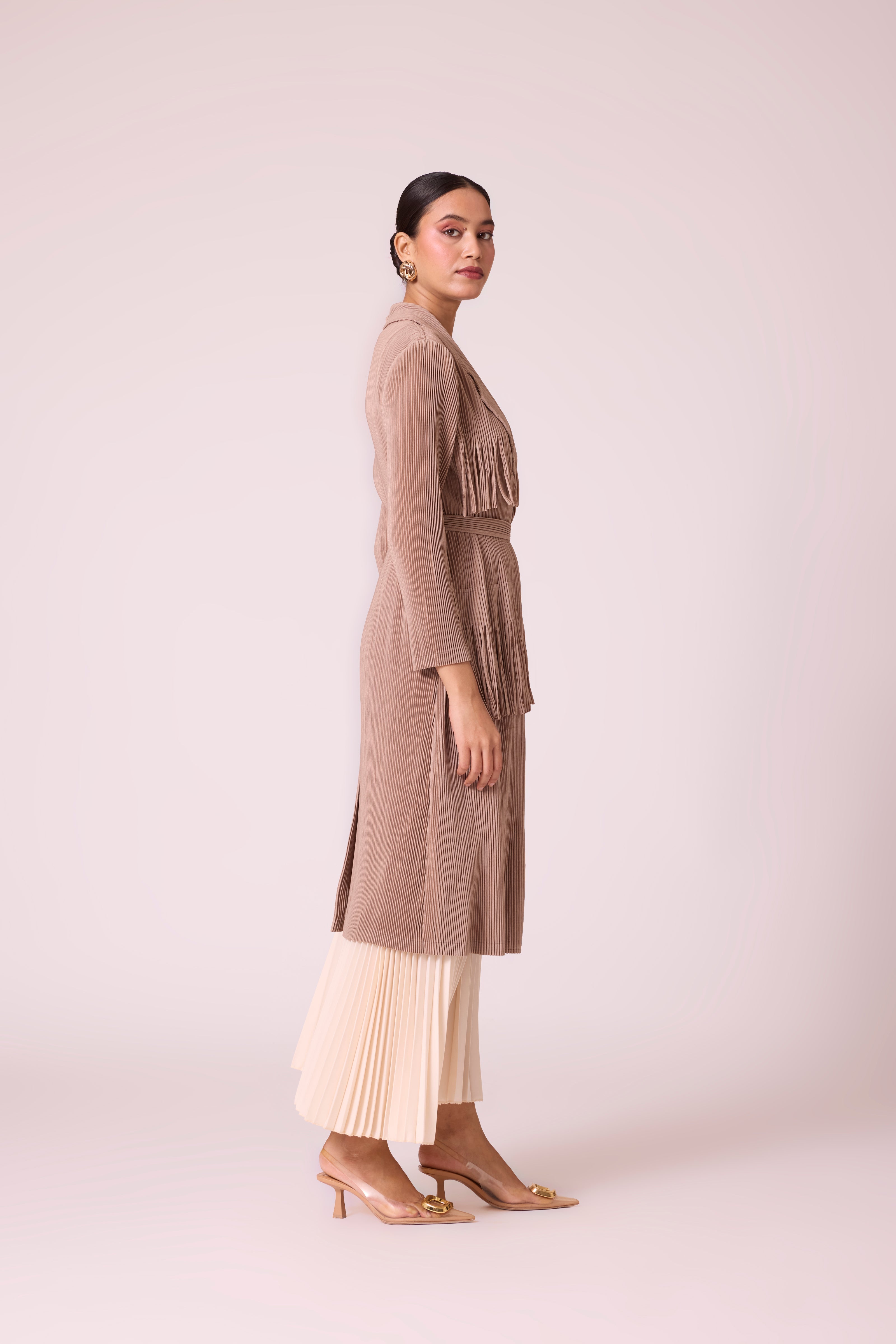 A knit pleated coat featuring layered fringe trims and a self-tie belt, blending the structure of a classic trench with modern detailing.