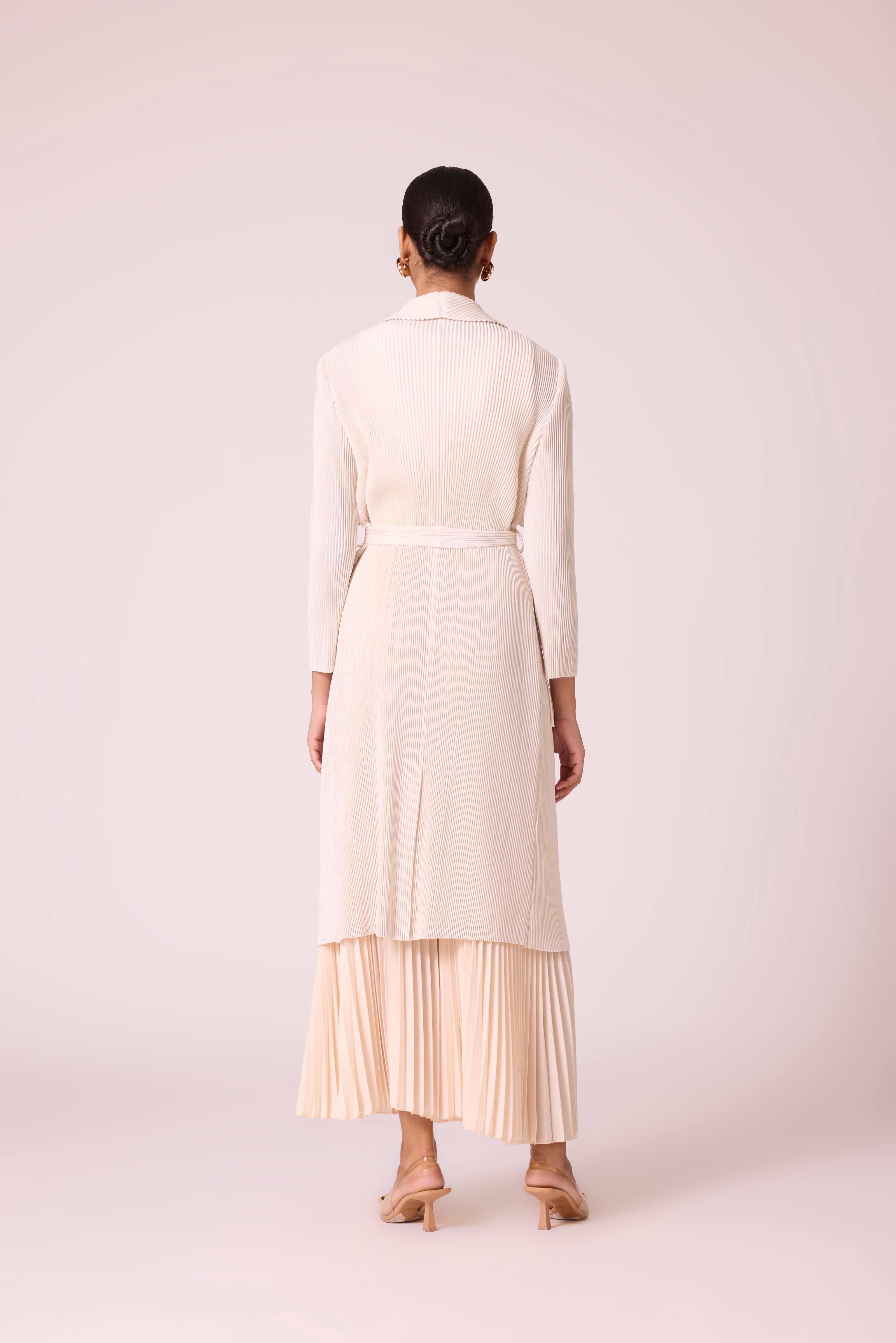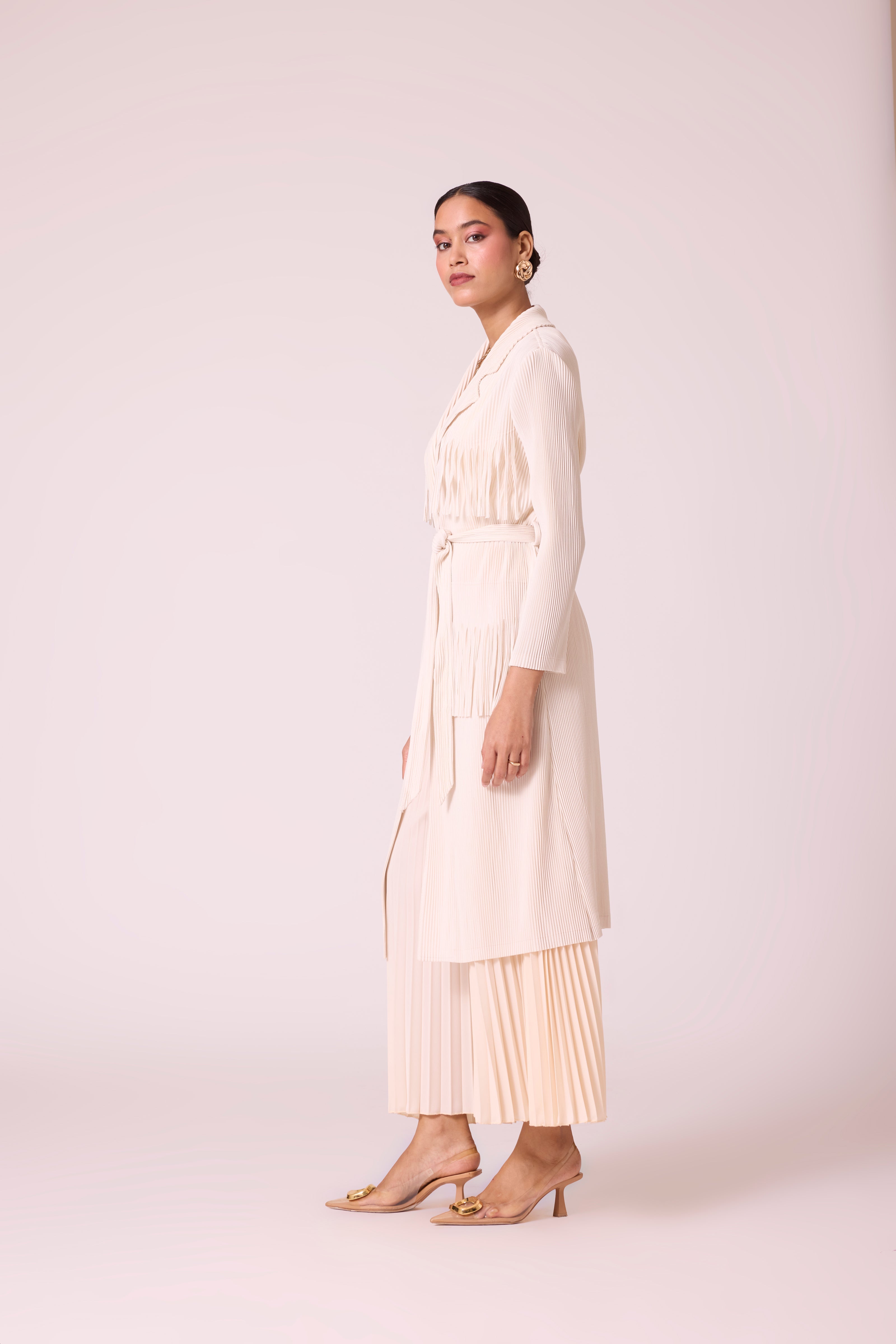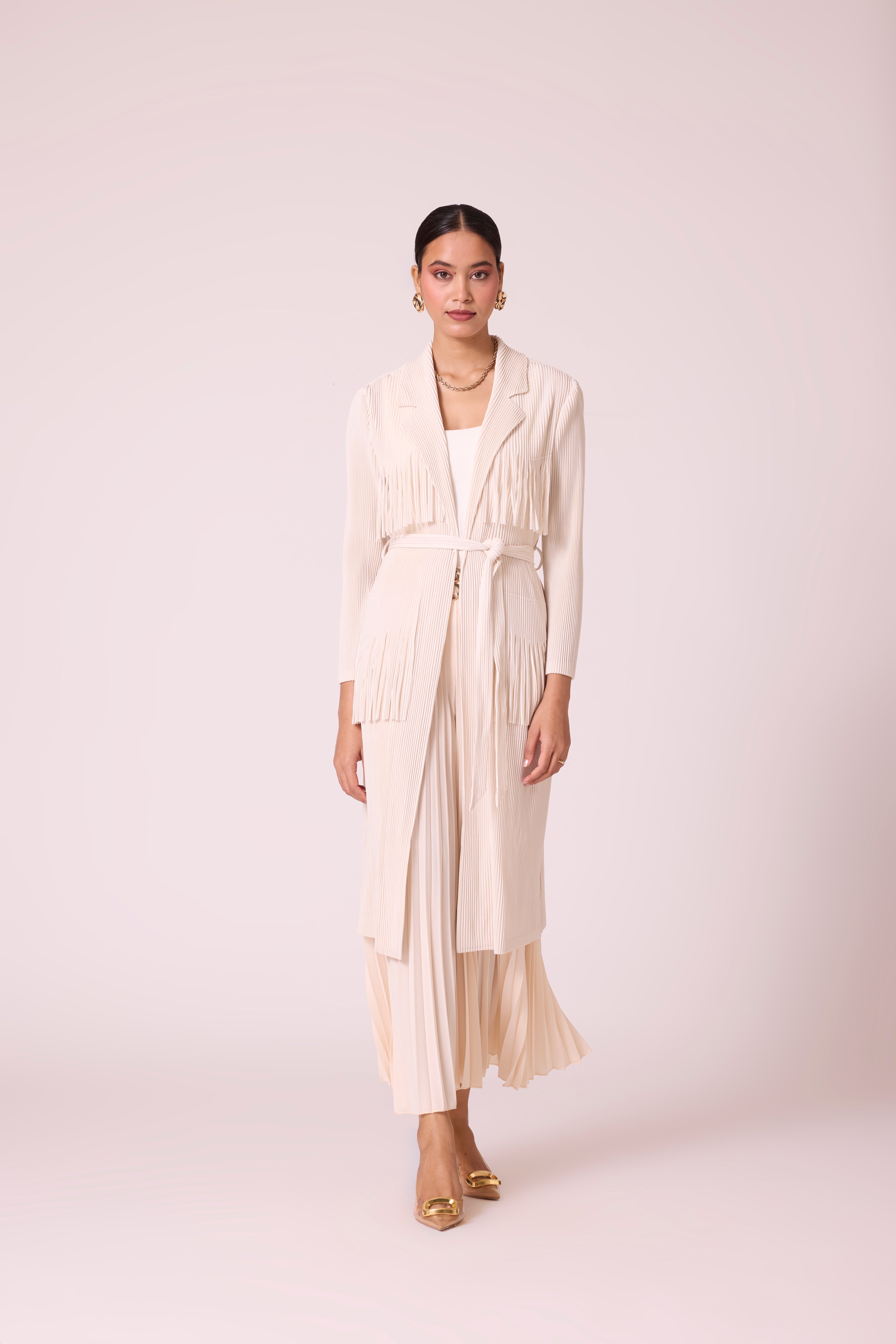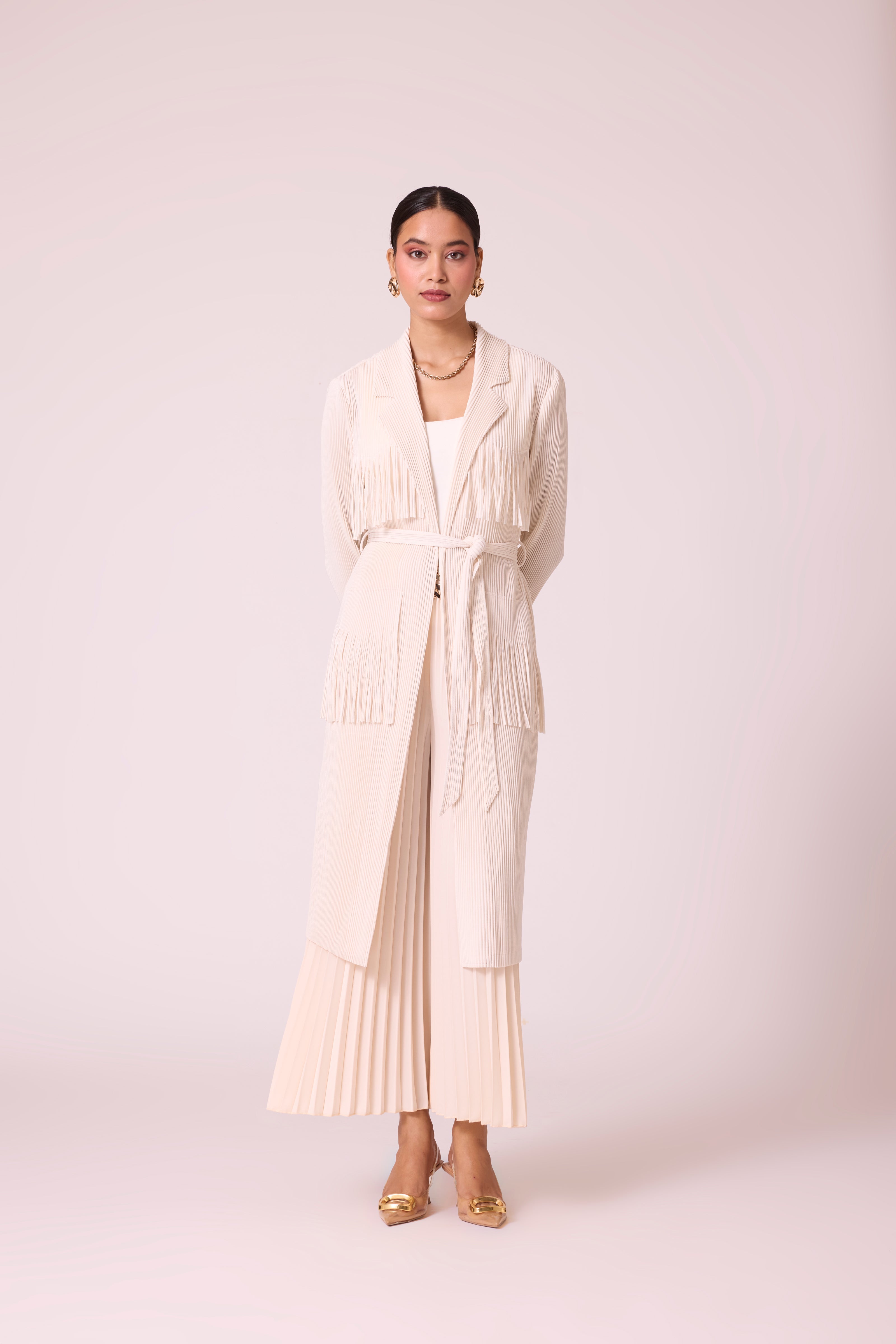 A knit pleated coat featuring layered fringe trims and a self-tie belt, blending the structure of a classic trench with modern detailing.