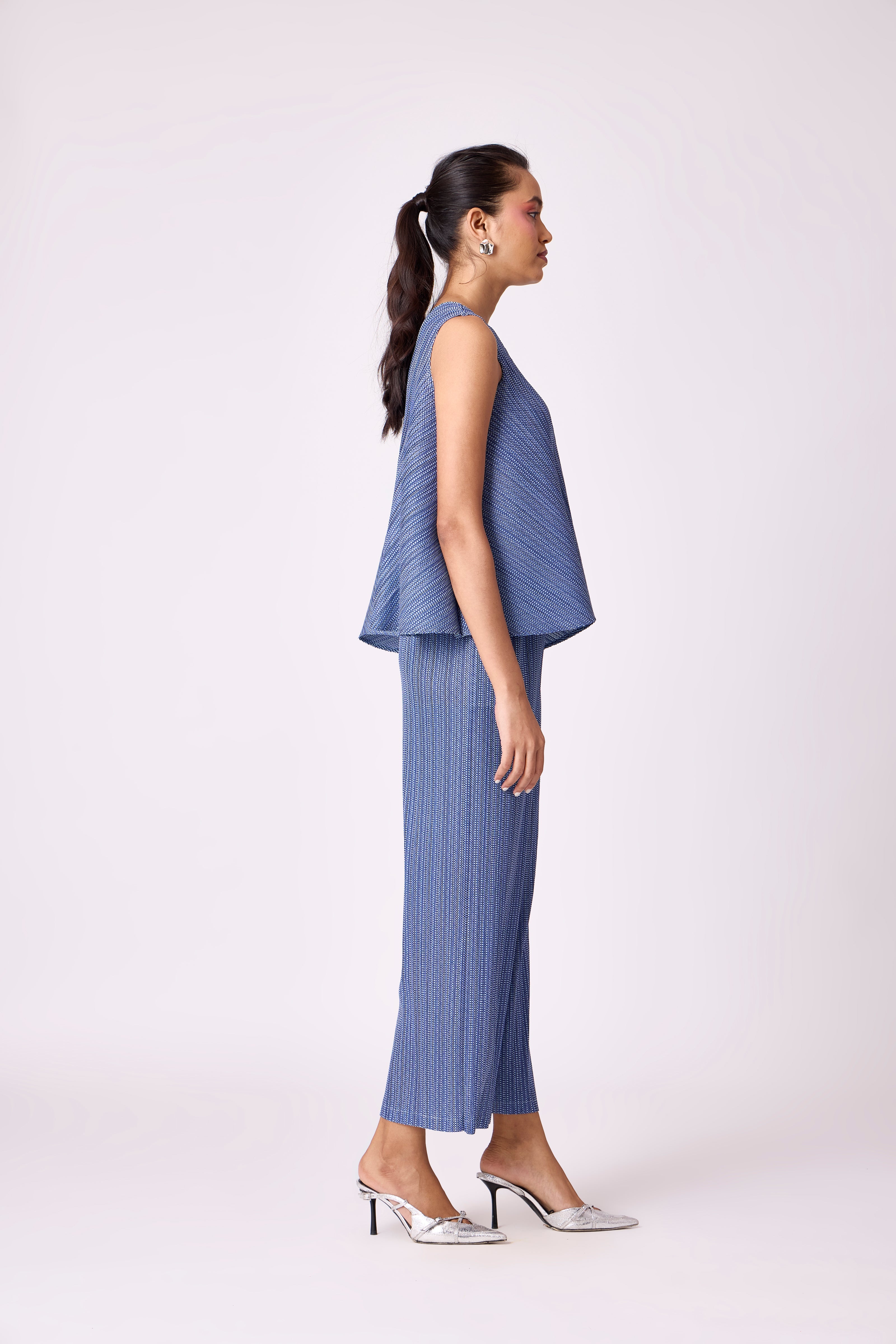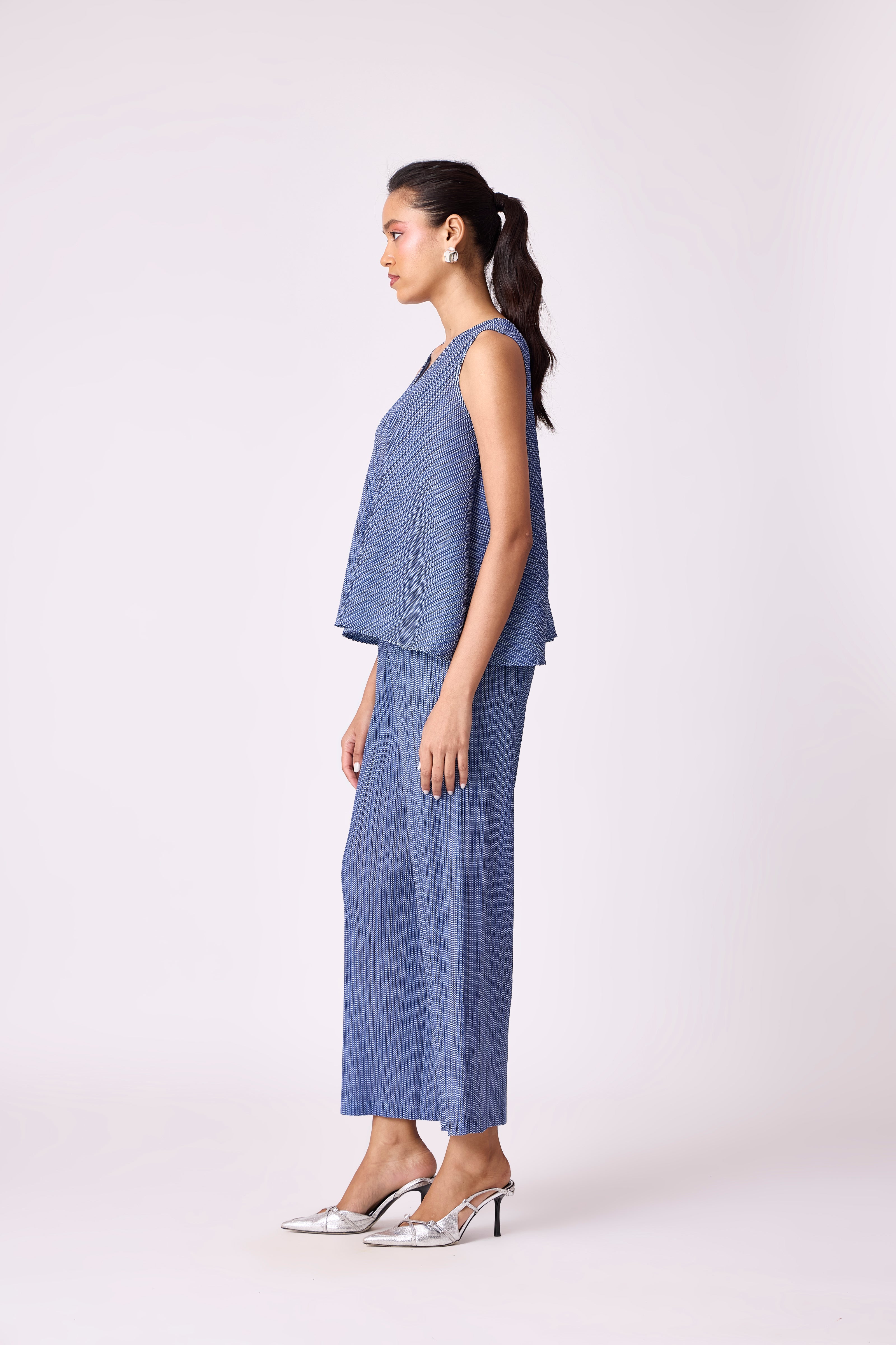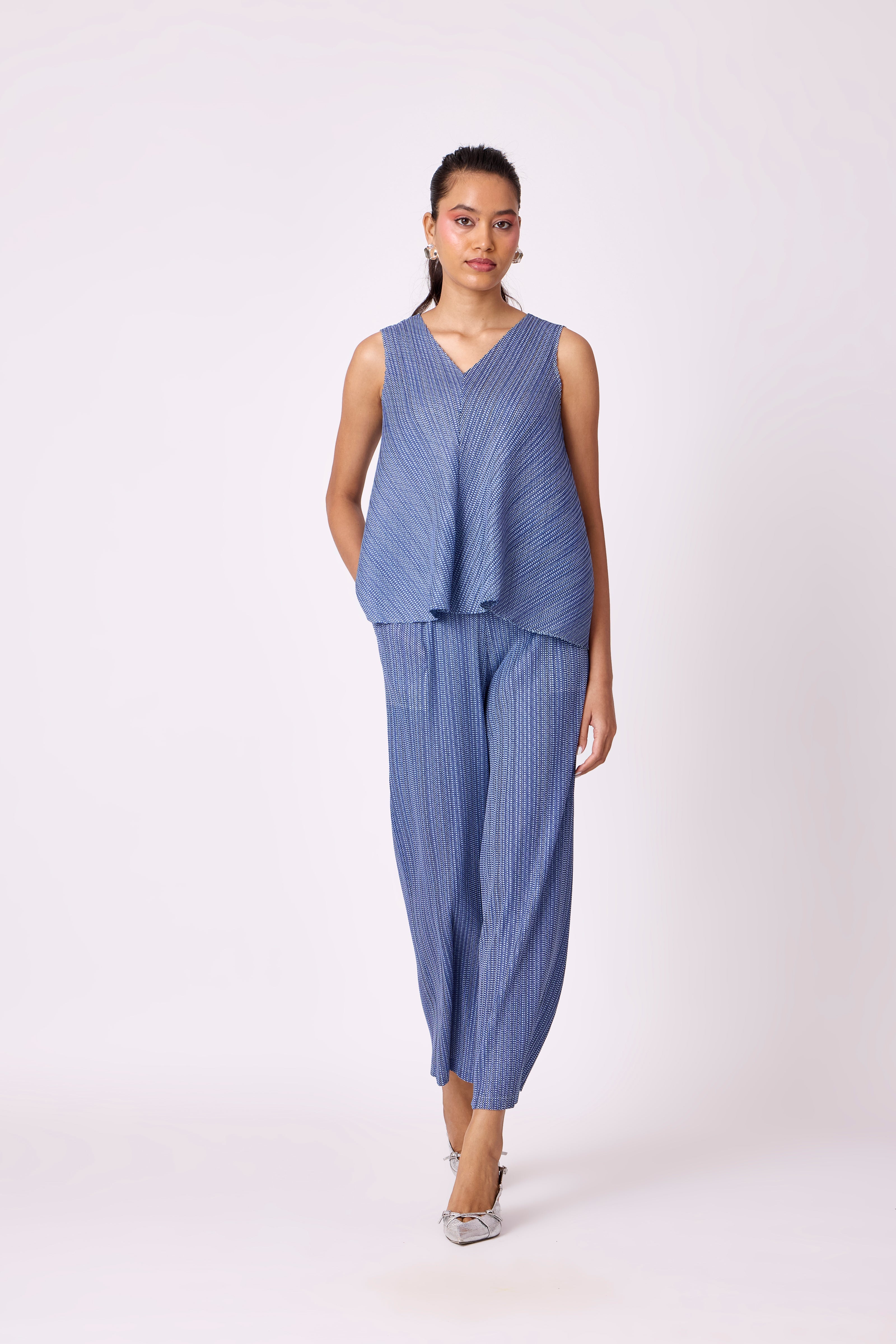 A breezy V neck top and straight leg pant in soft light pleated fabric.