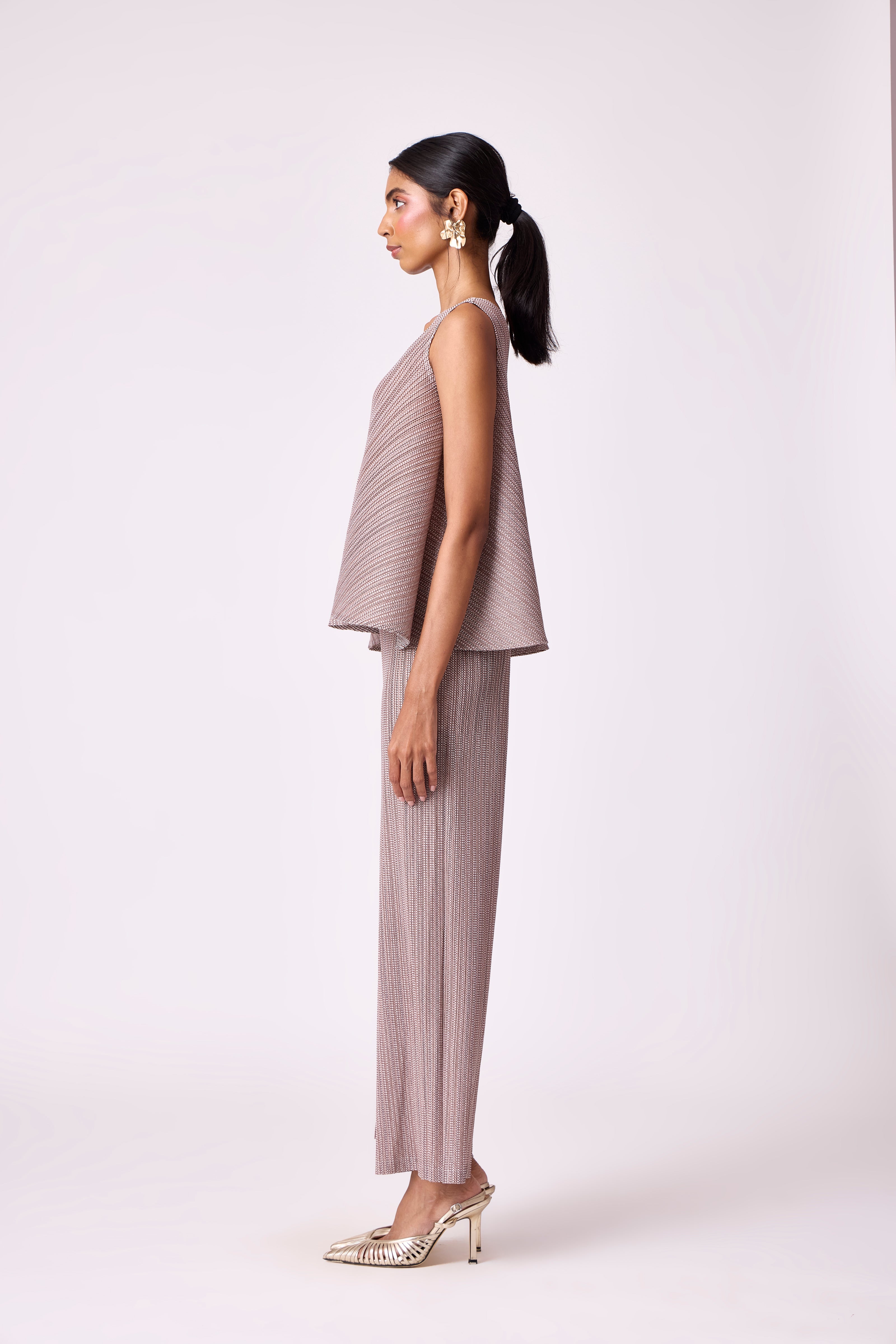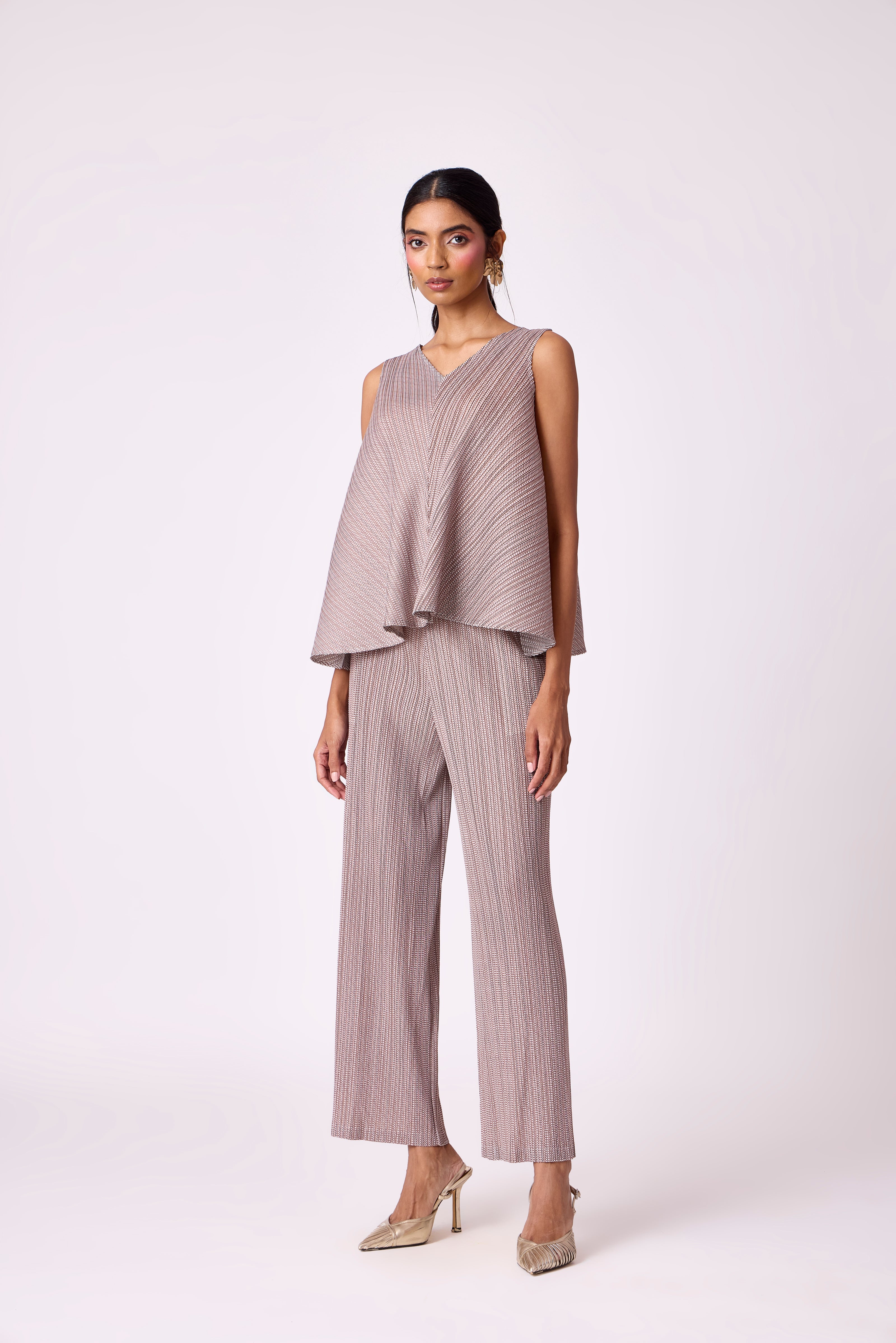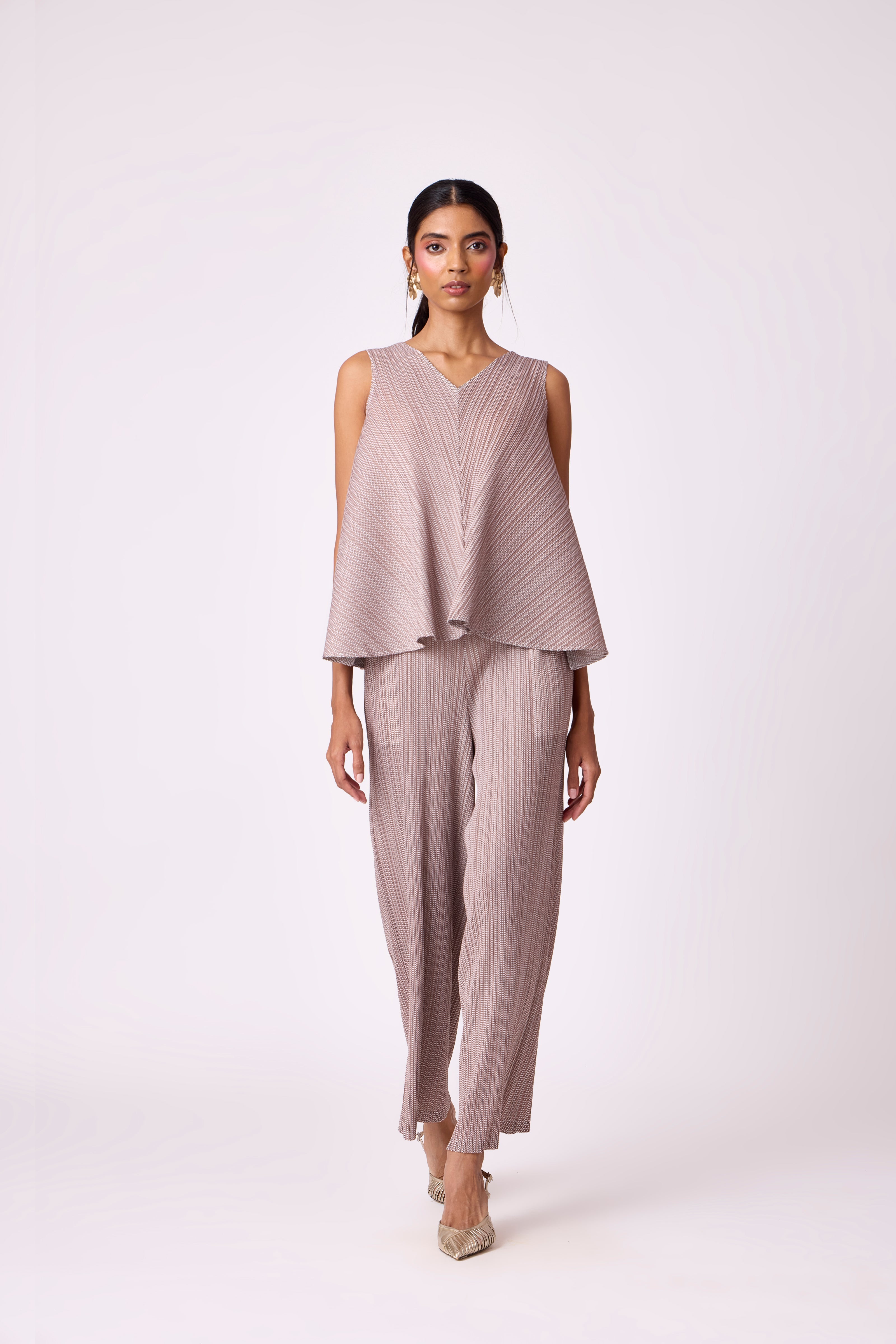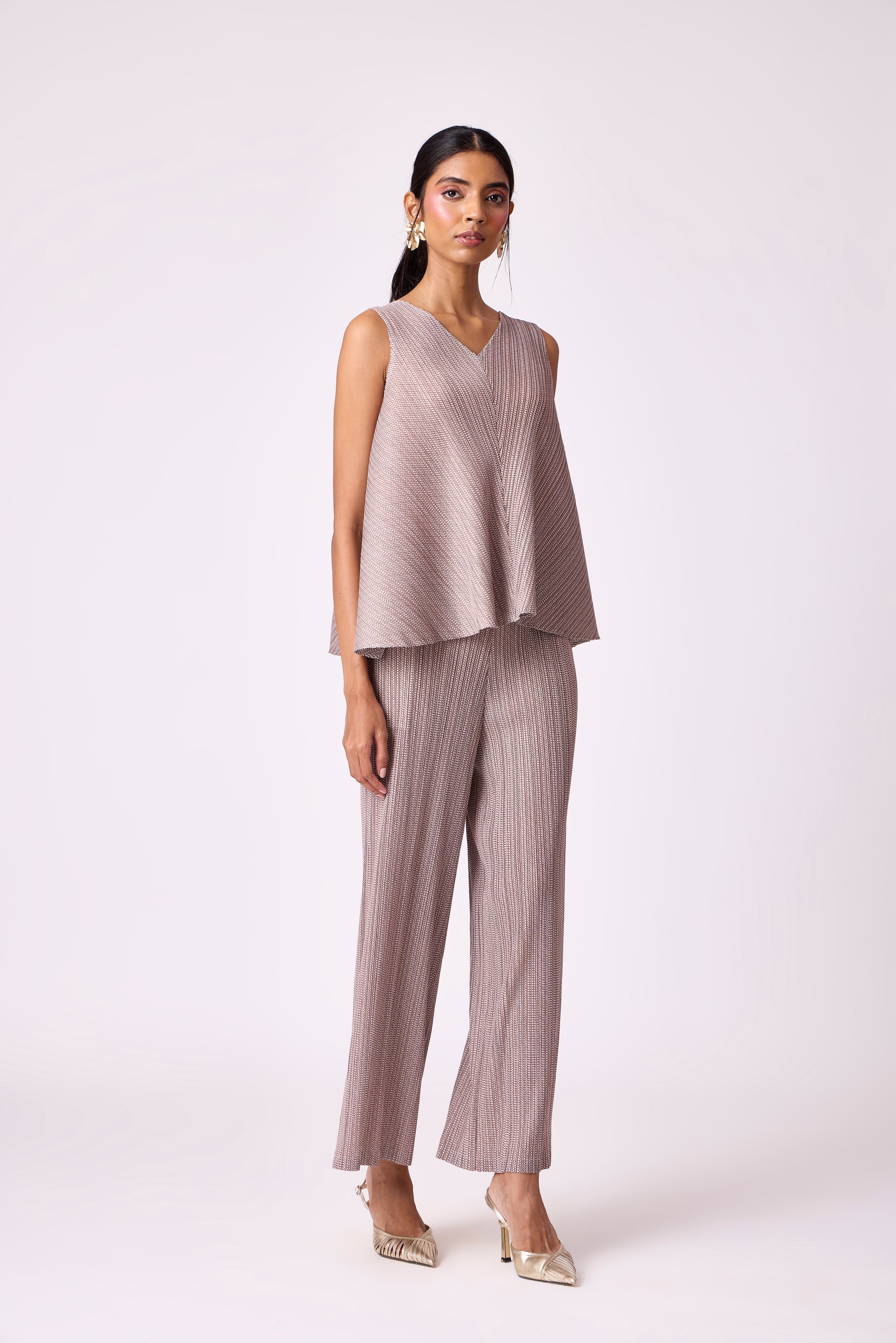 A breezy V neck top and straight leg pant in soft light pleated fabric.
