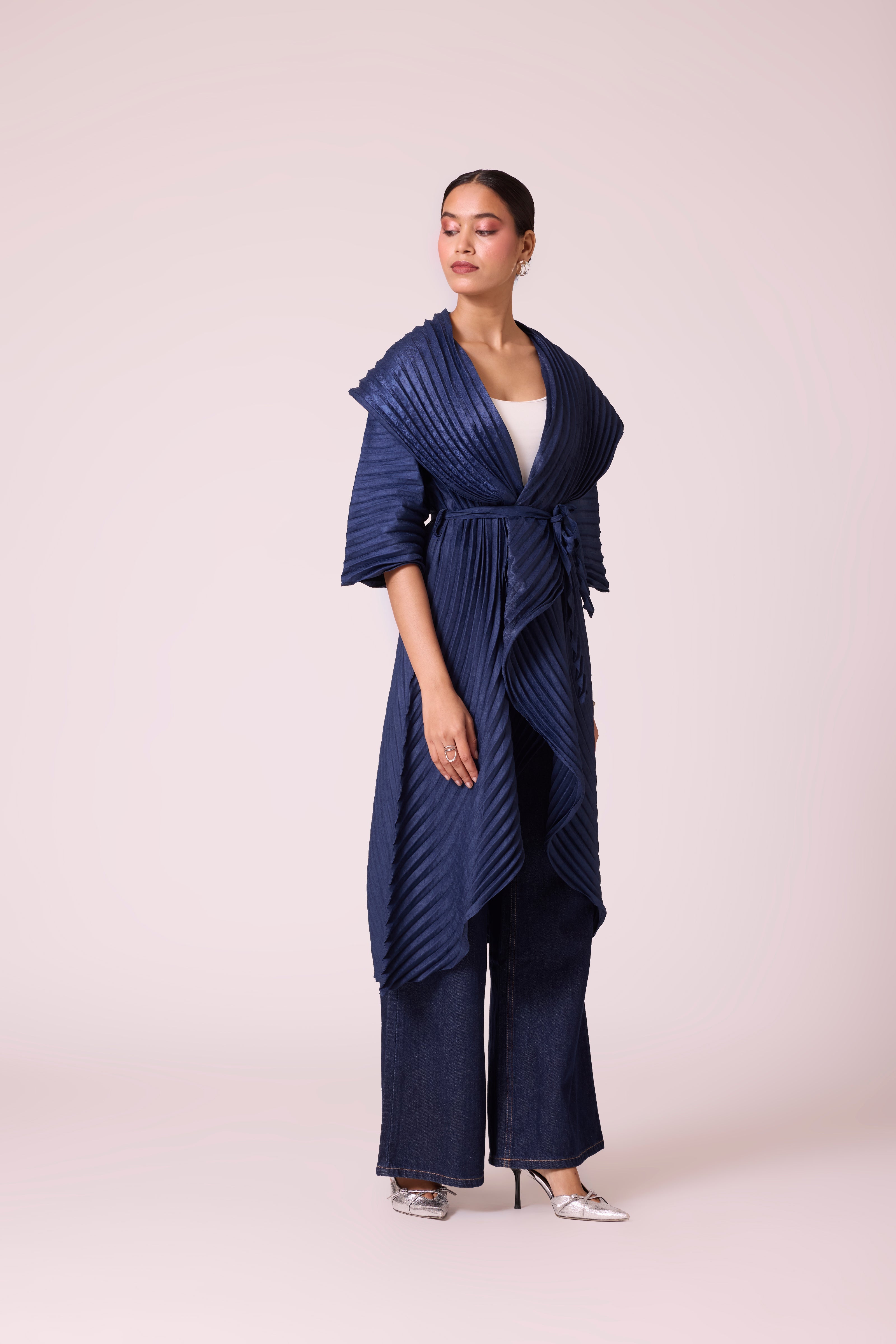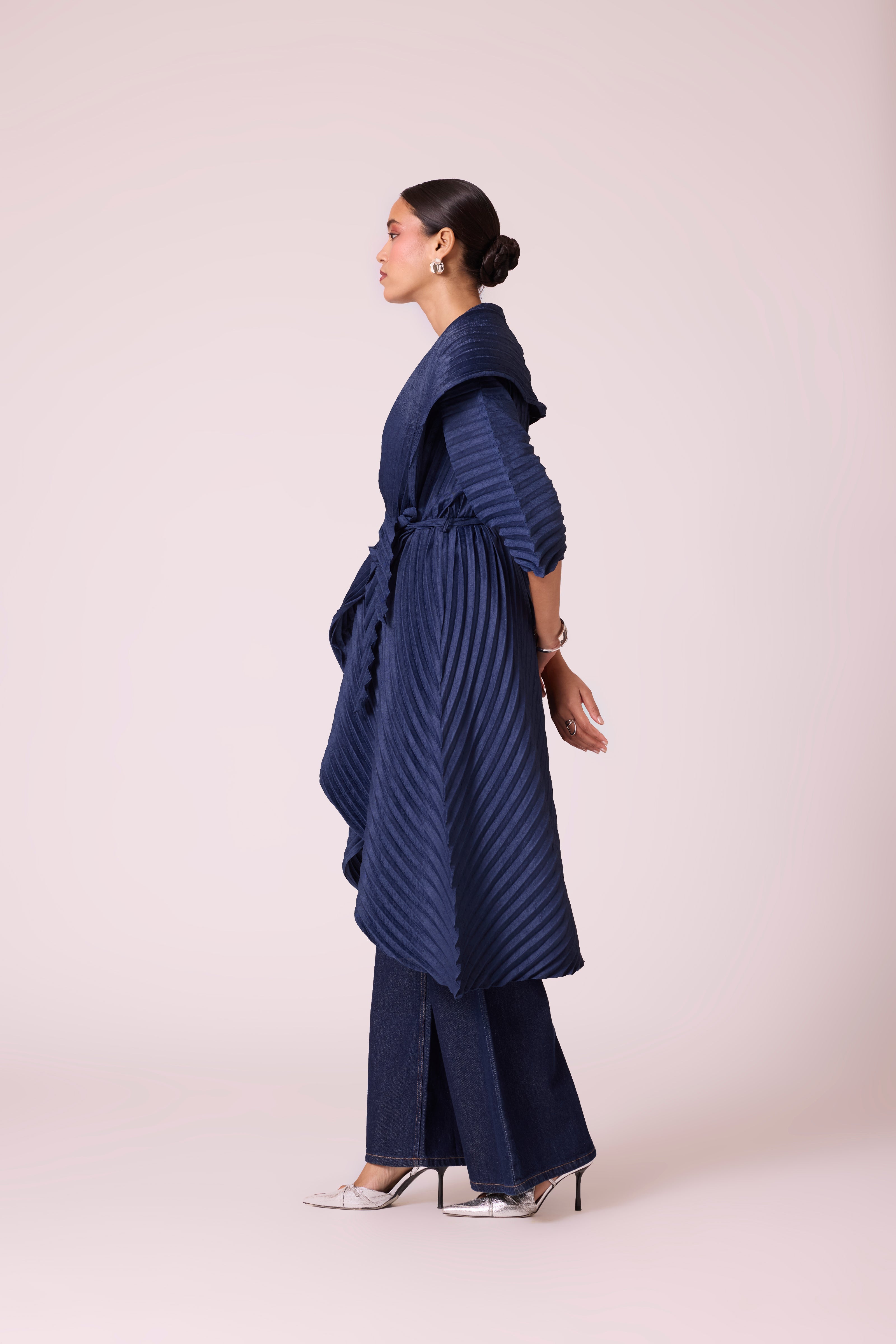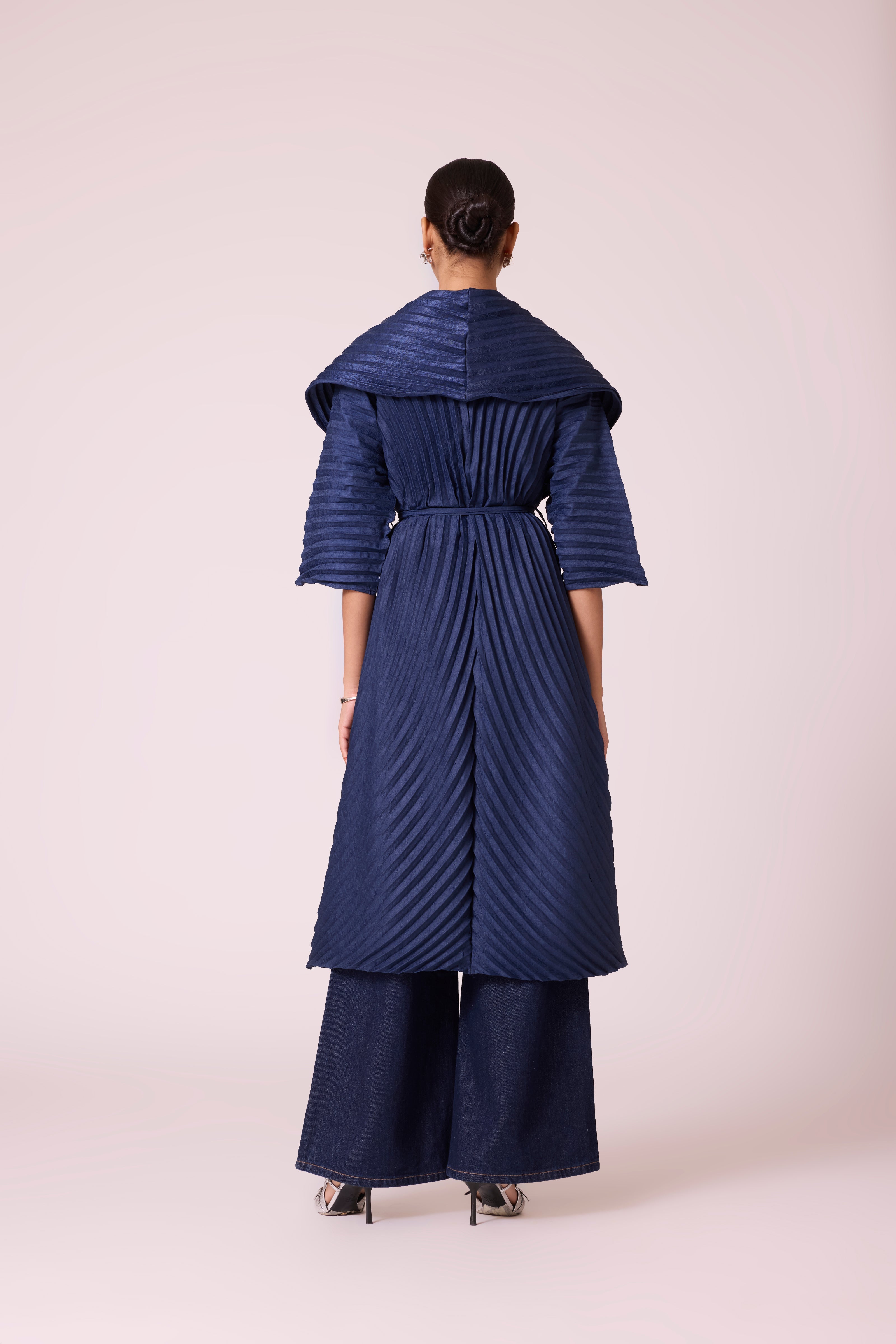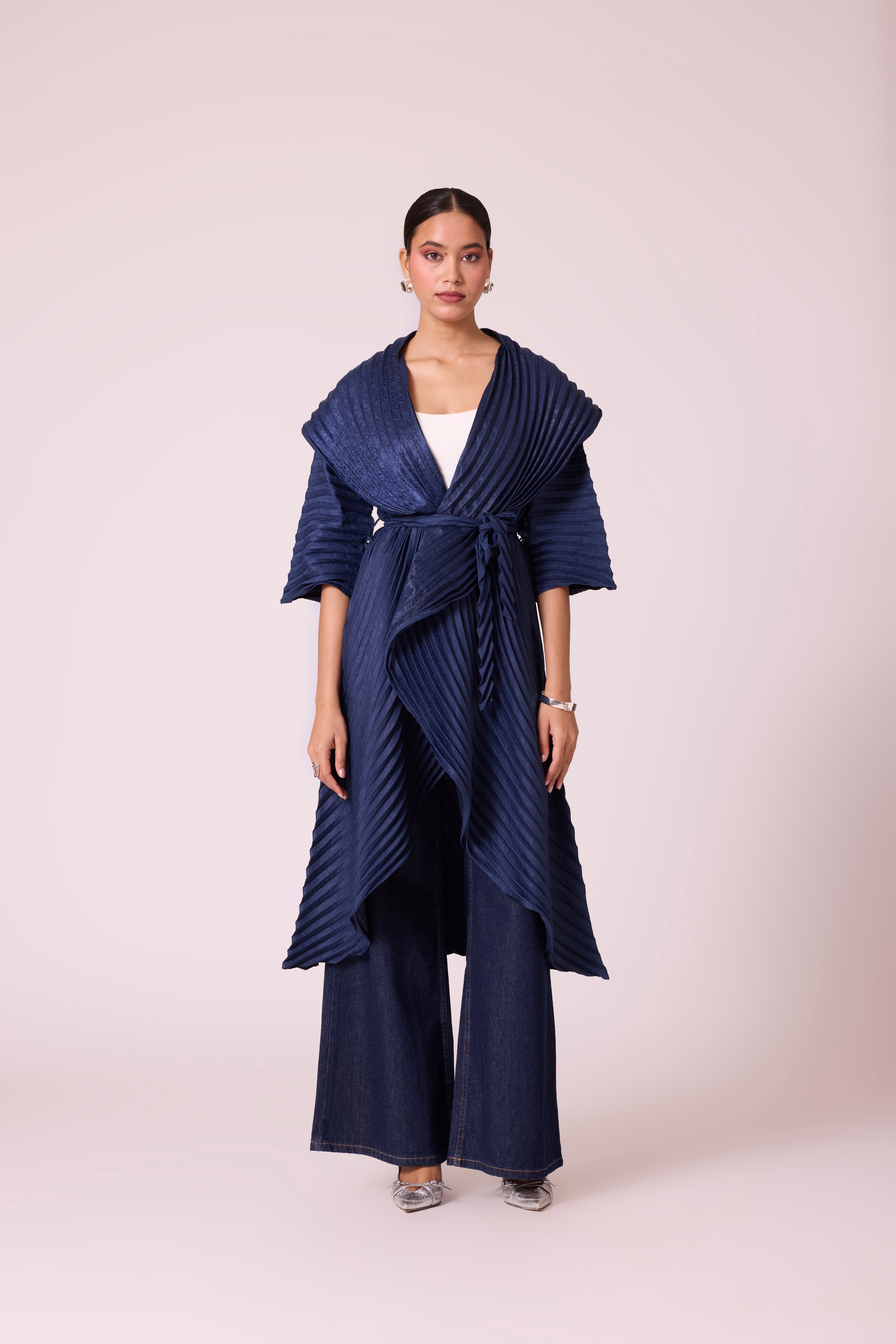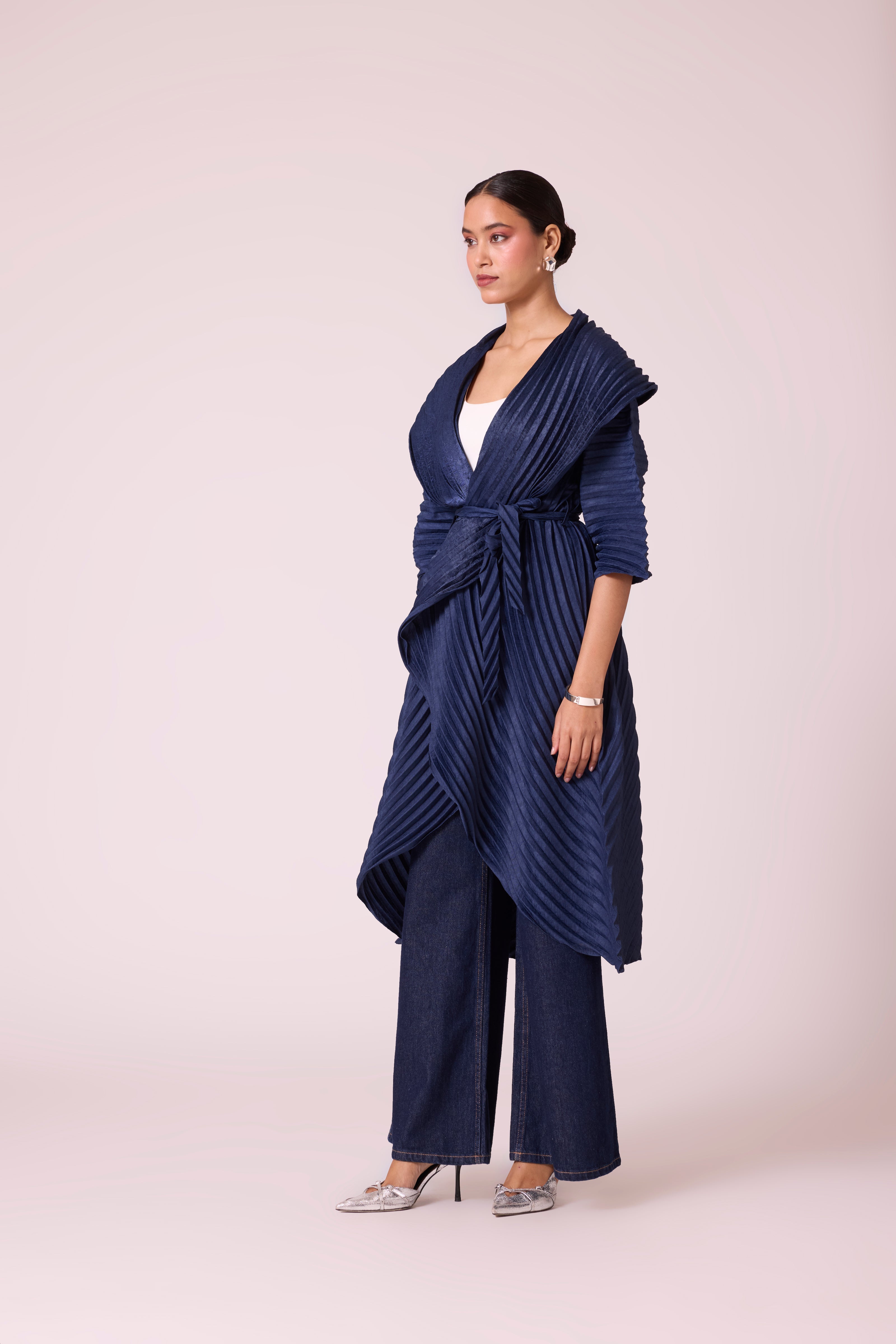 A sculptural pleated jacket with a dramatic shawl collar and cascading front, featuring bold, architectural folds and finished with a tie belt.