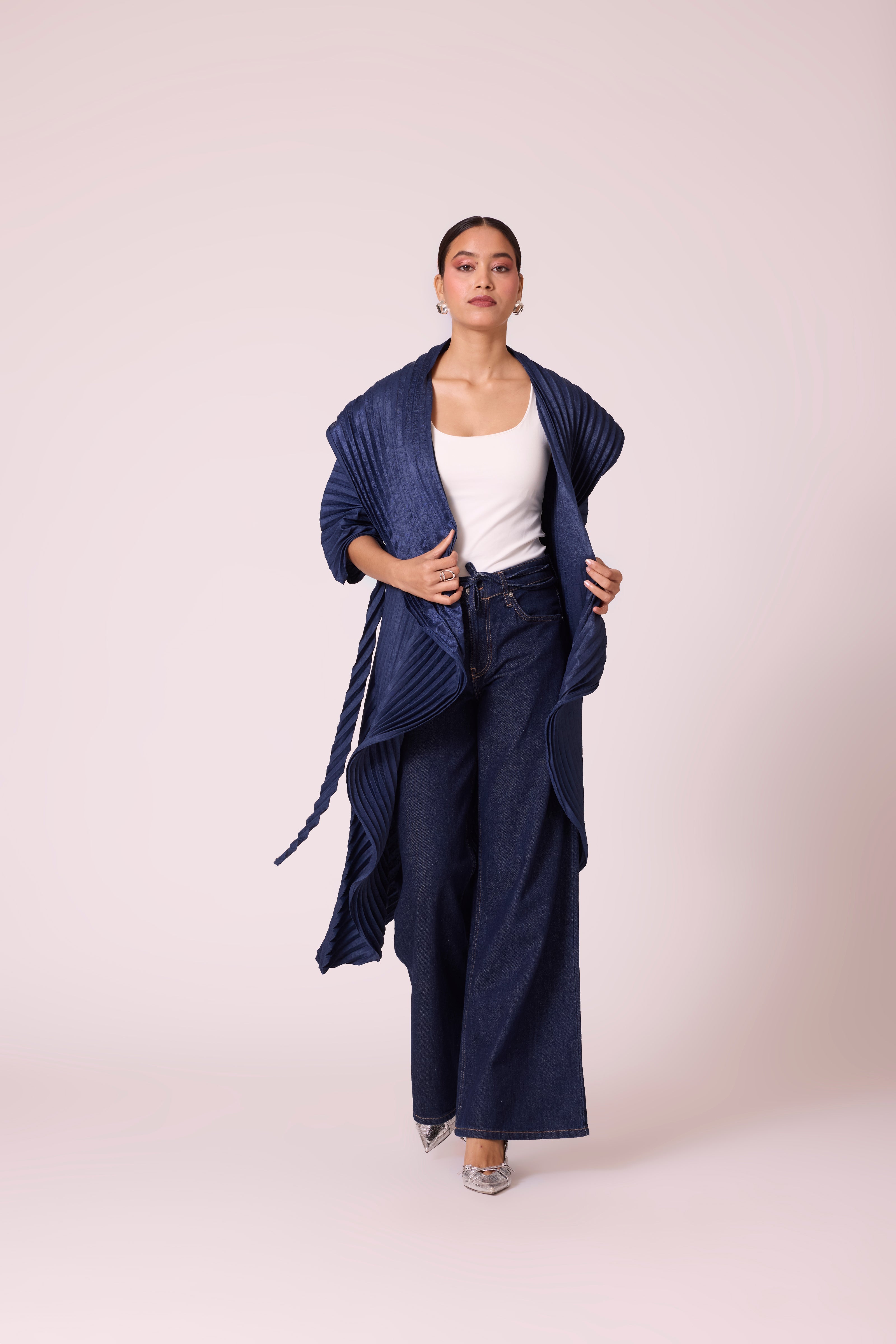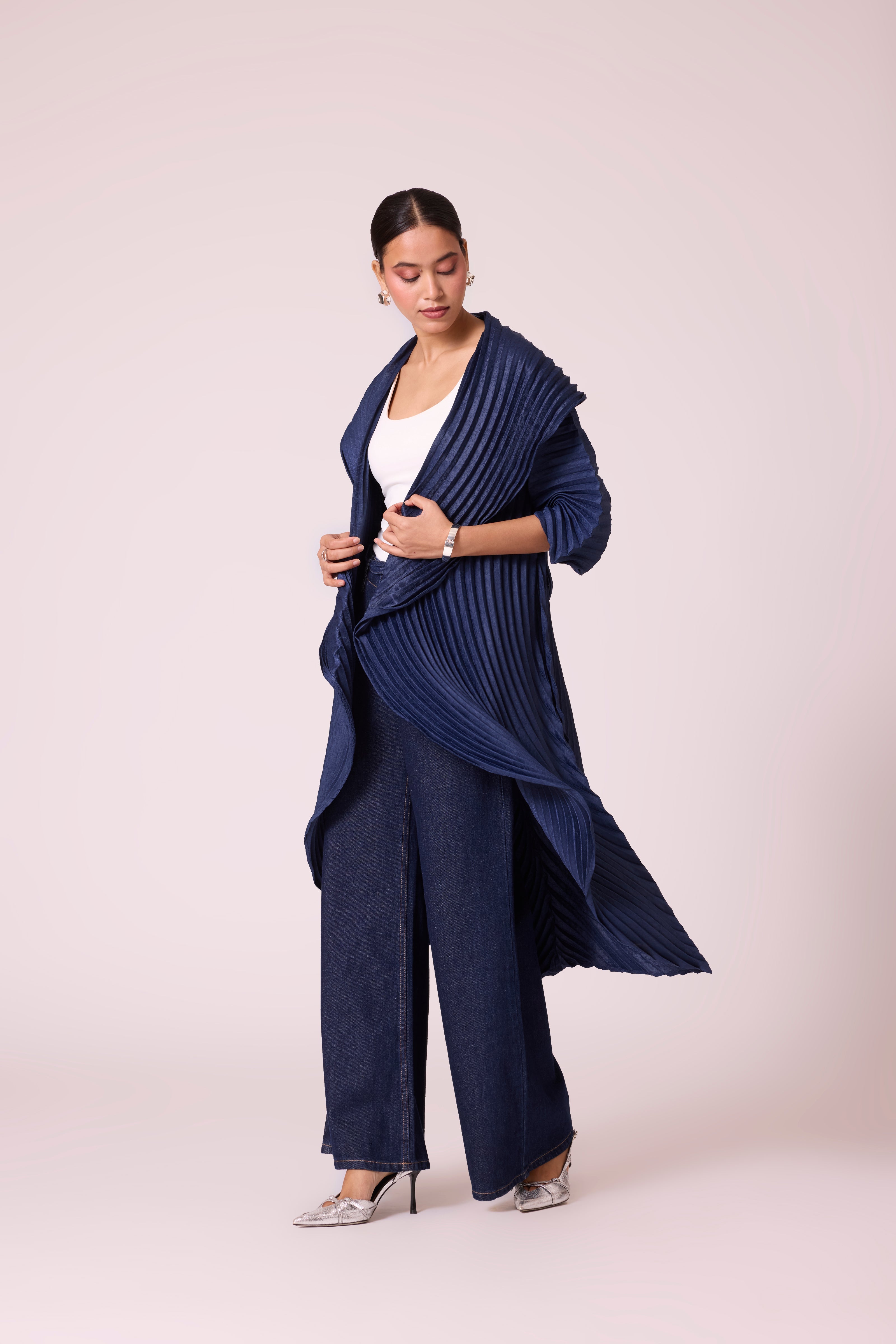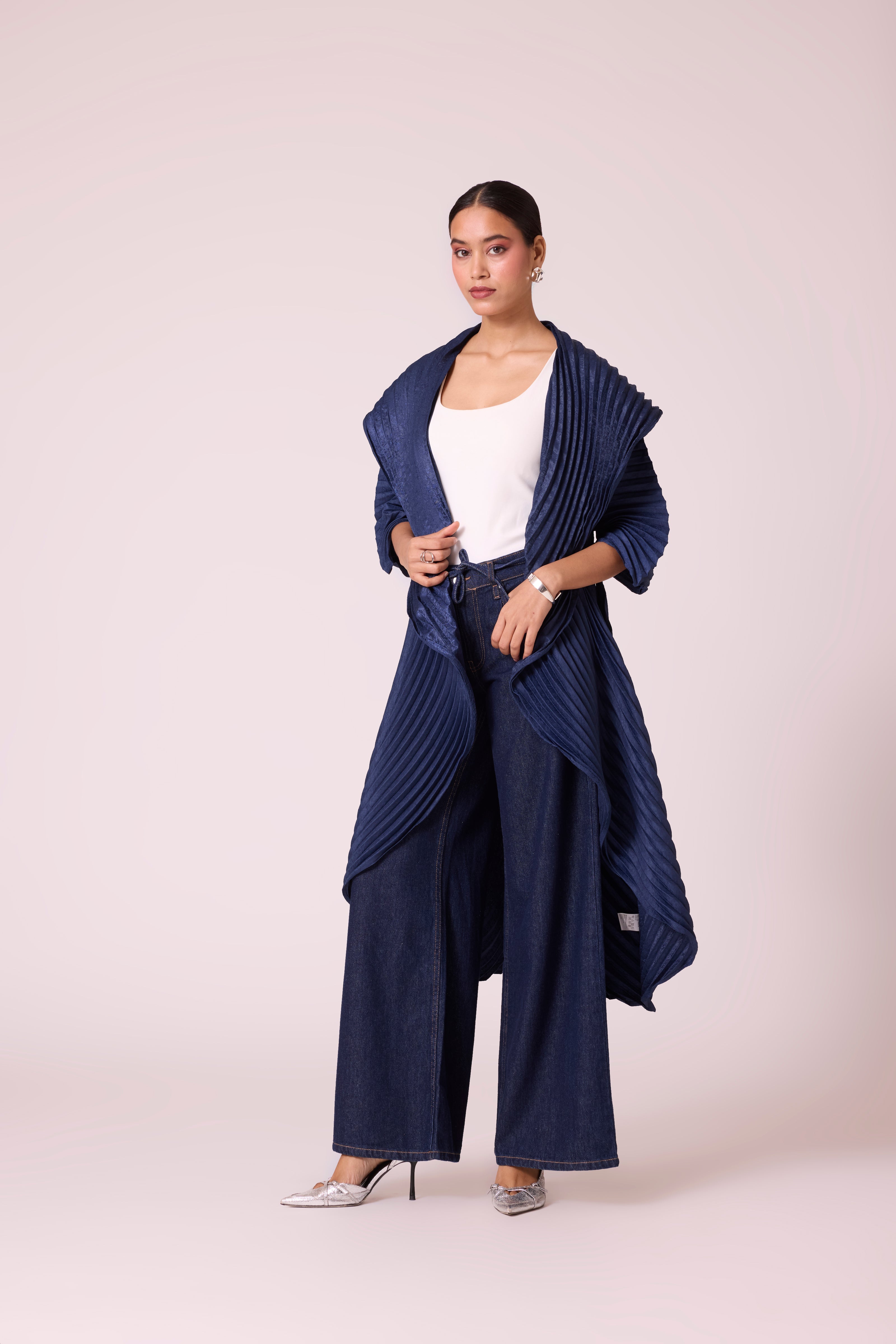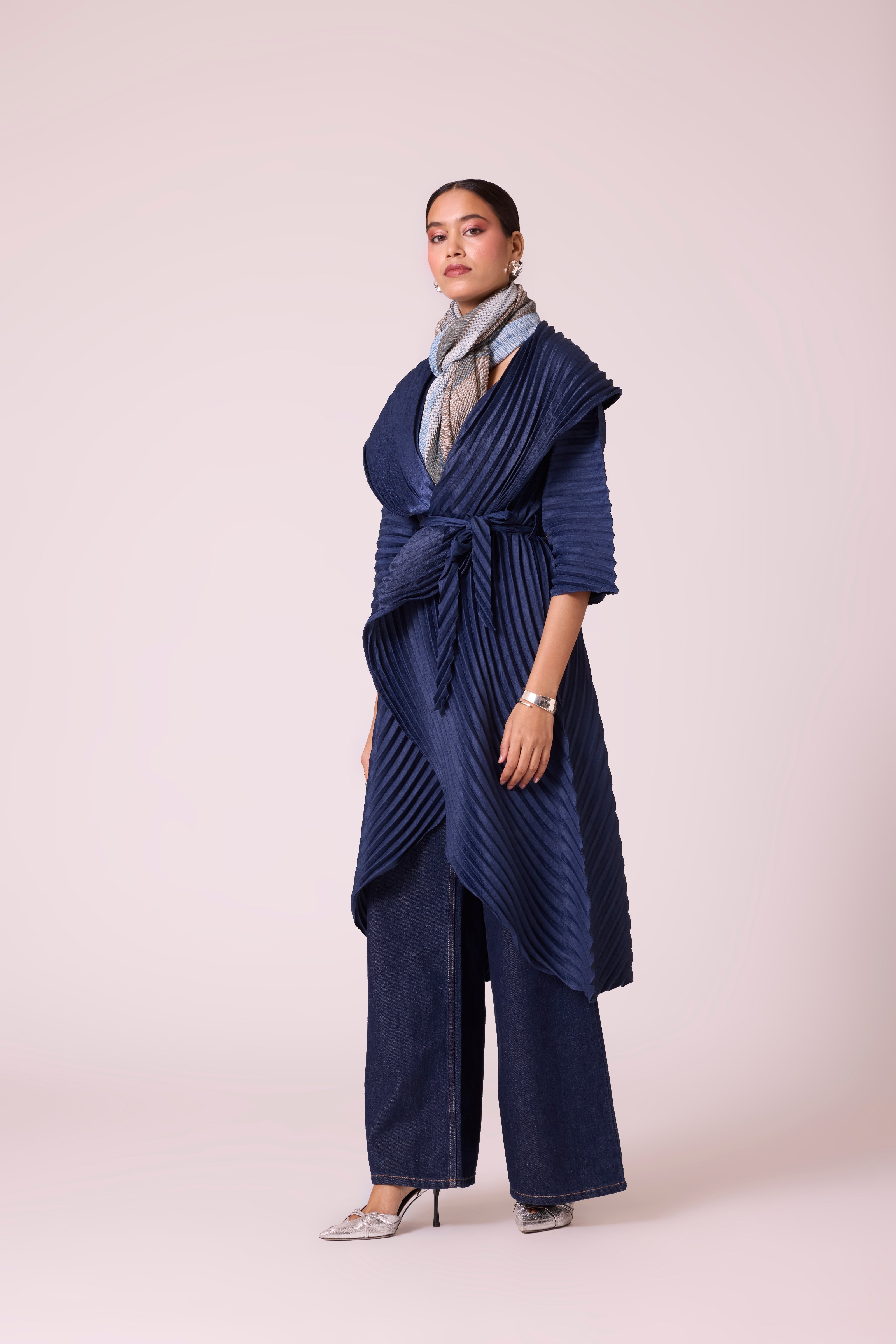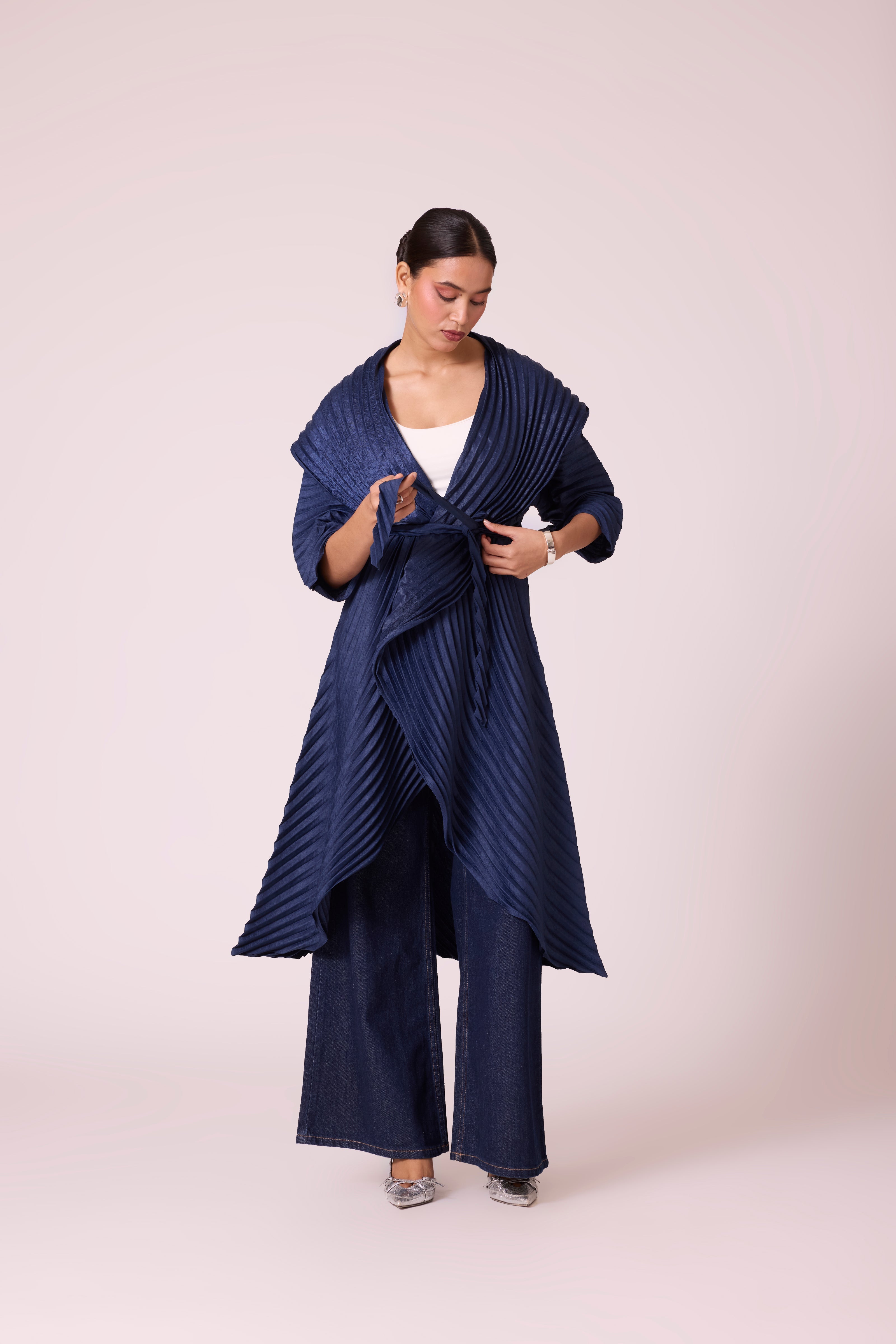 A sculptural pleated jacket with a dramatic shawl collar and cascading front, featuring bold, architectural folds and finished with a tie belt.
