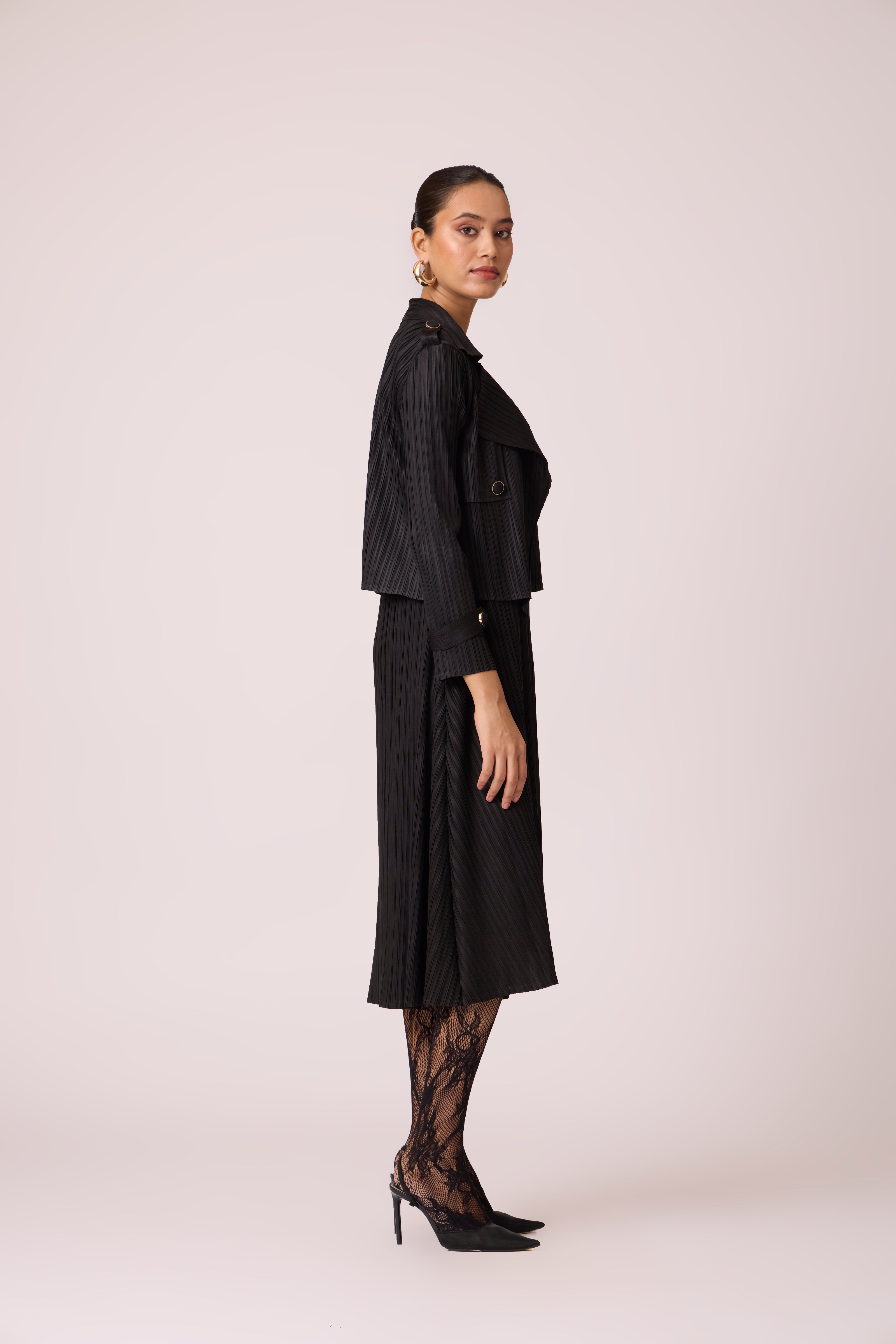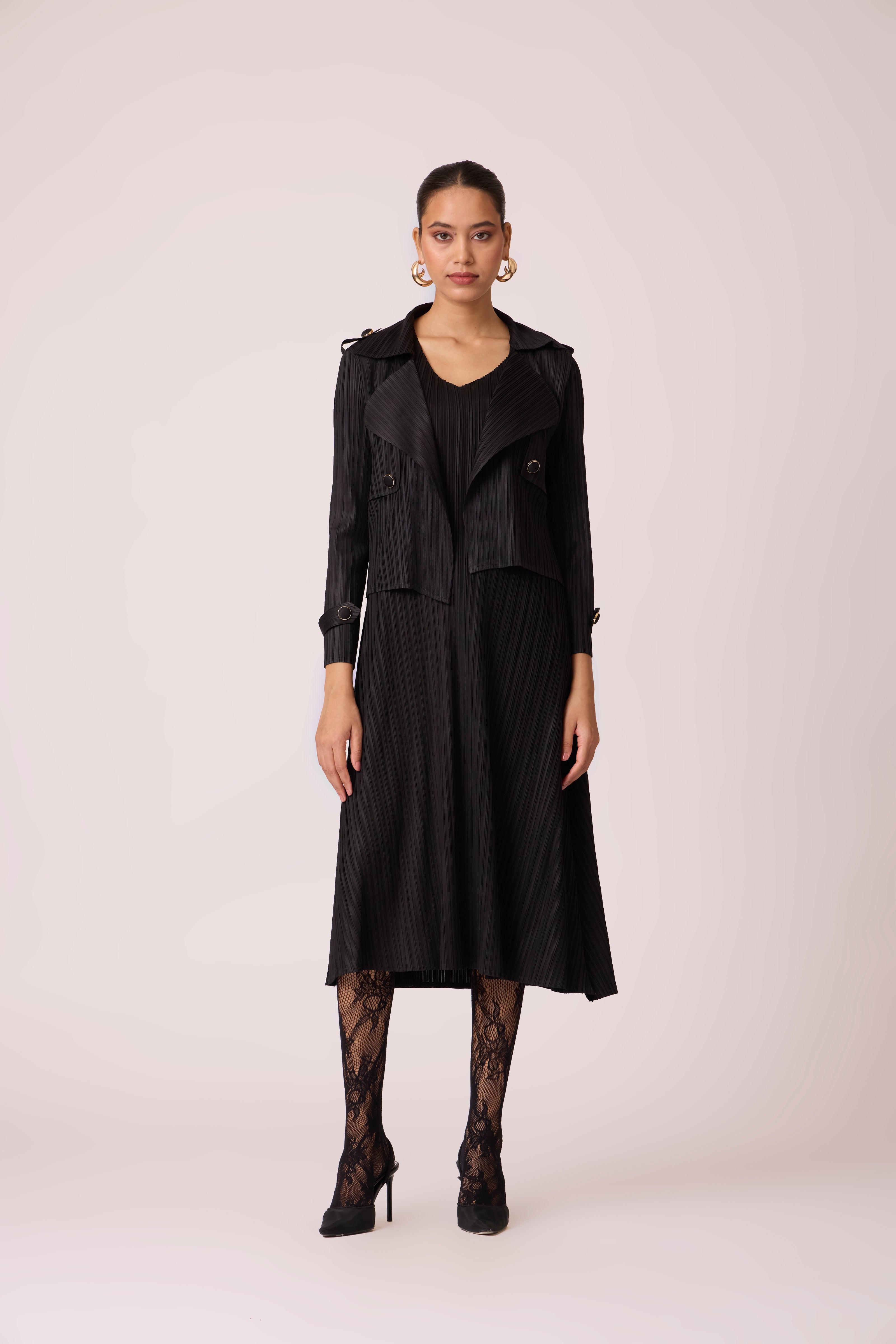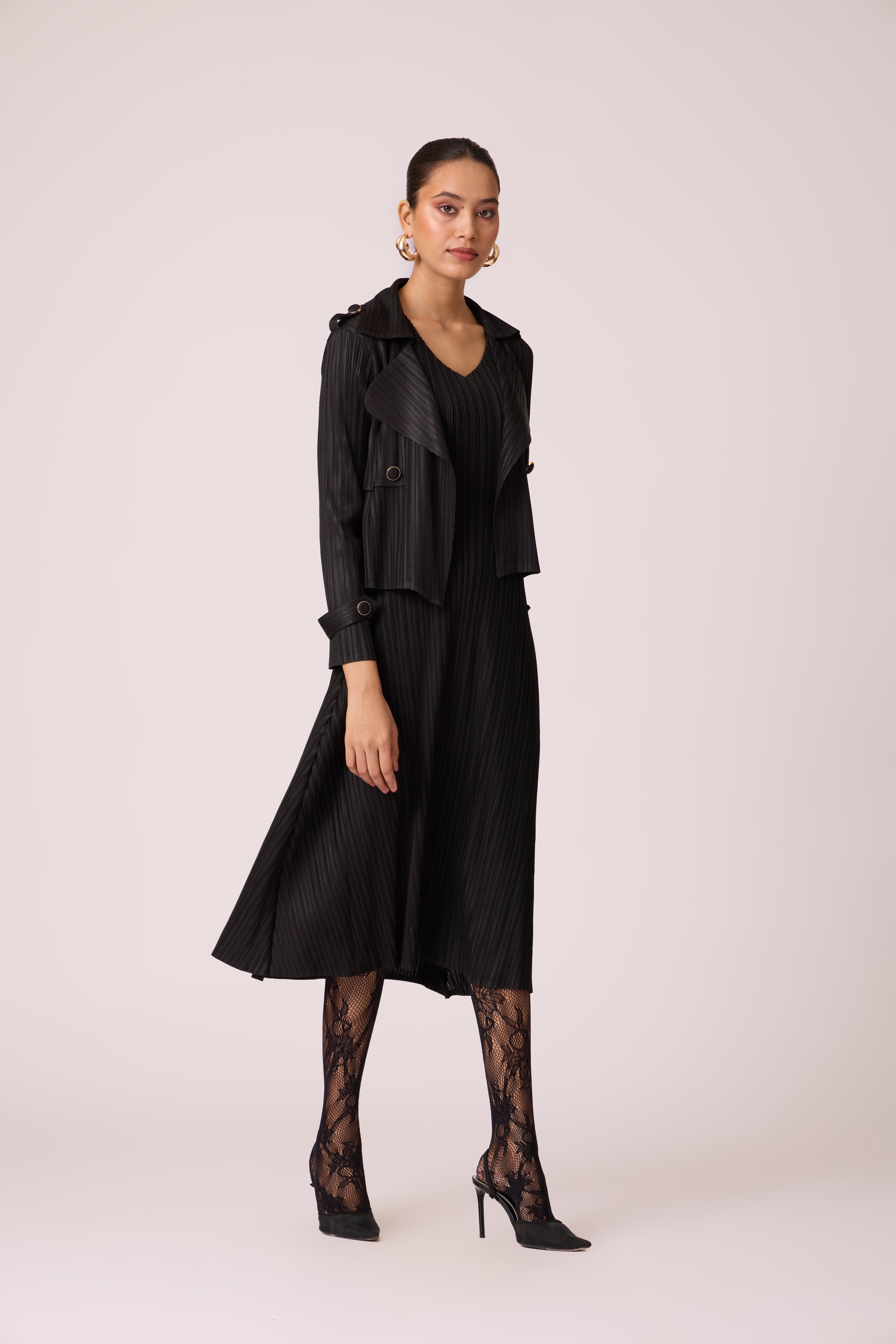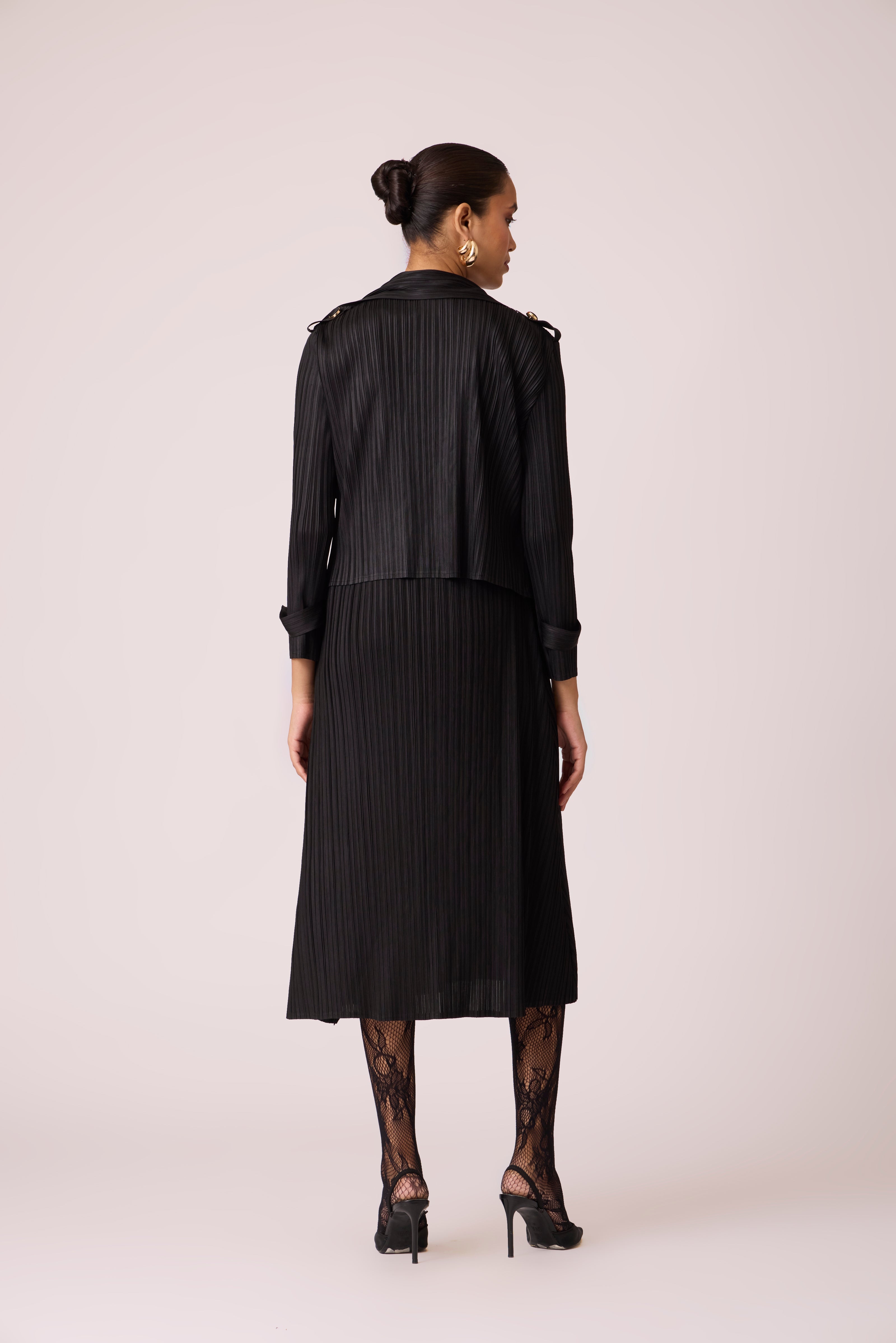A classic pleated A line V neck dress with a matching short trench style jacket for power office looks which can easily transcend to formal dinners.