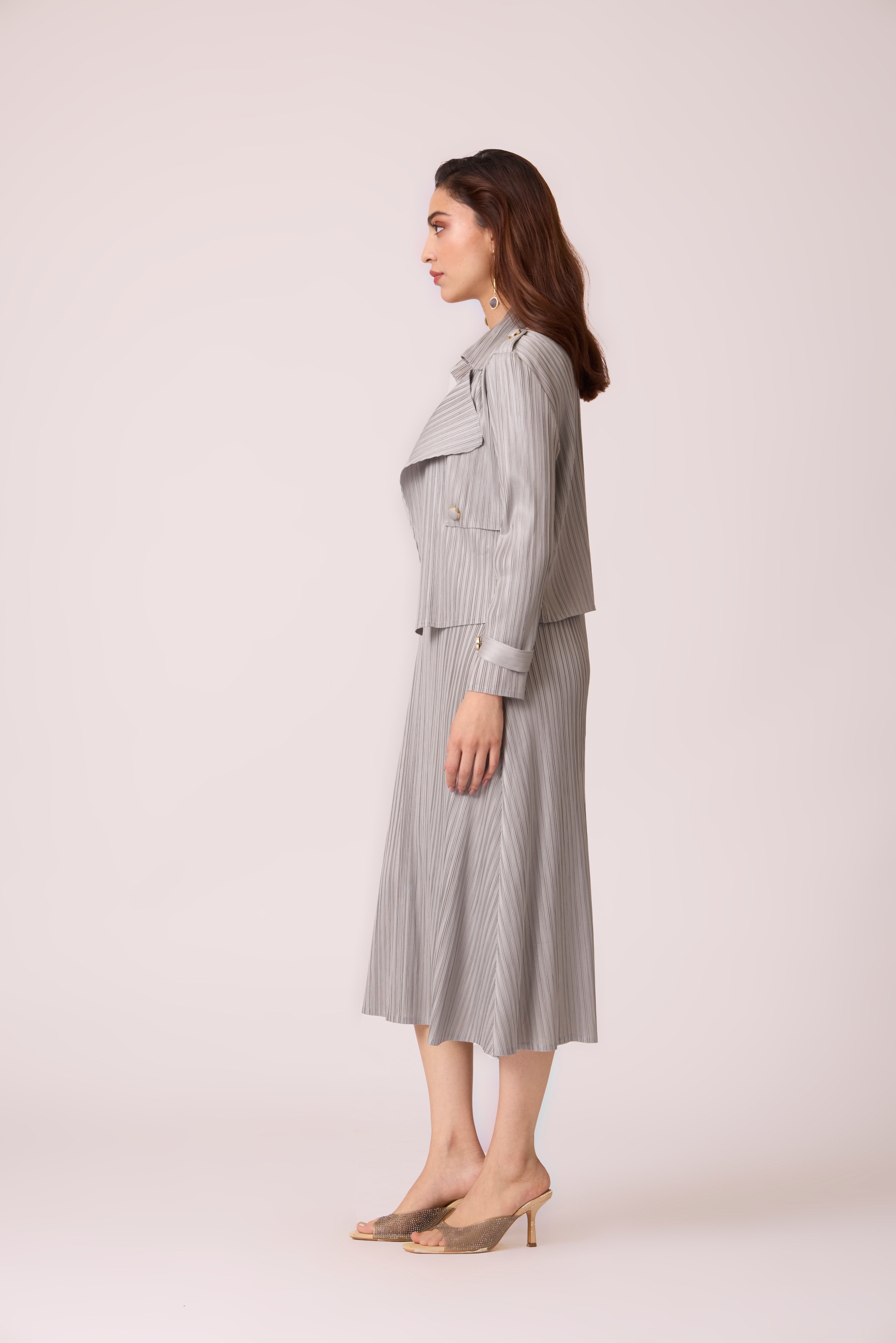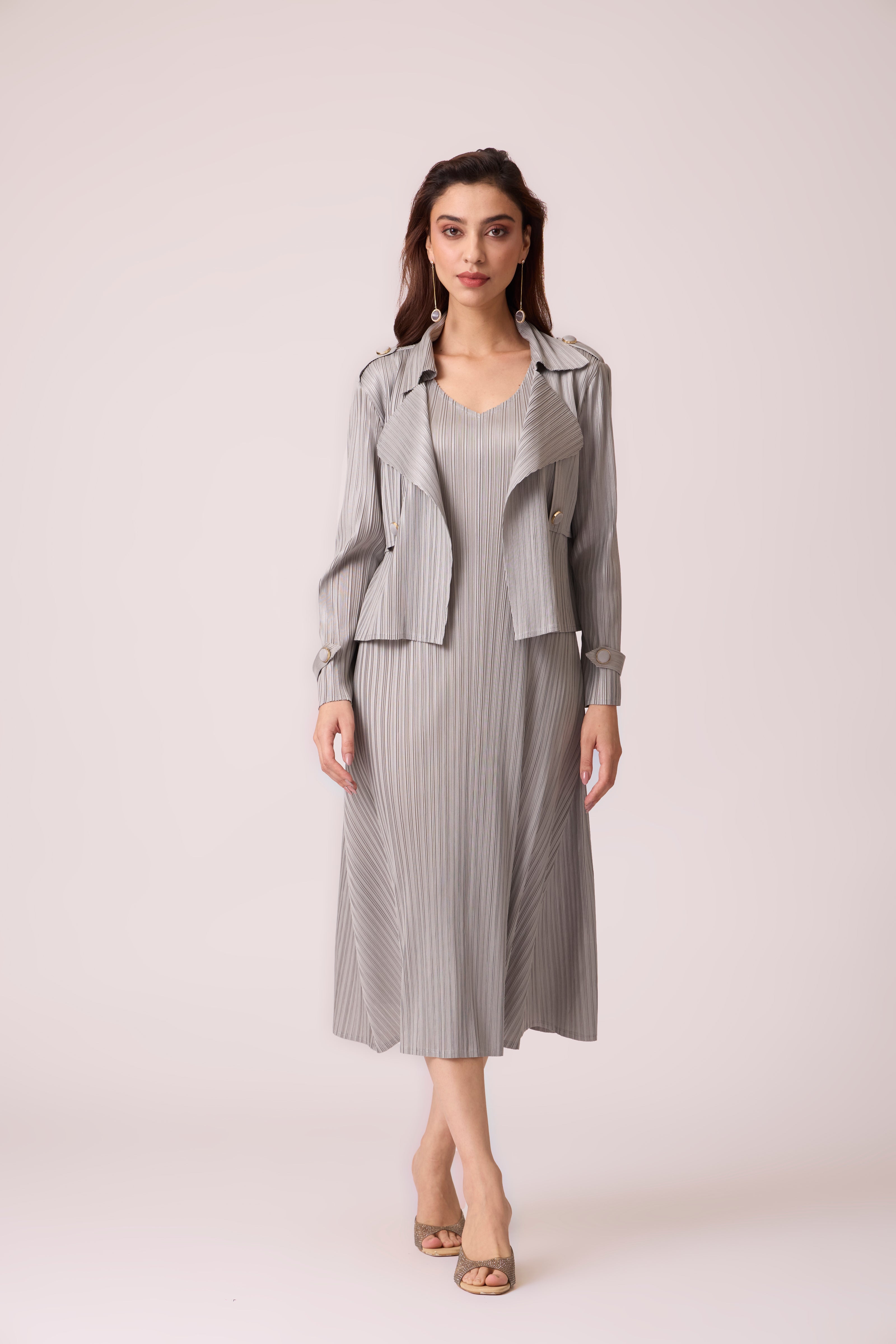 A classic pleated A line V neck dress with a matching short trench style jacket for power office looks which can easily transcend to formal dinners.