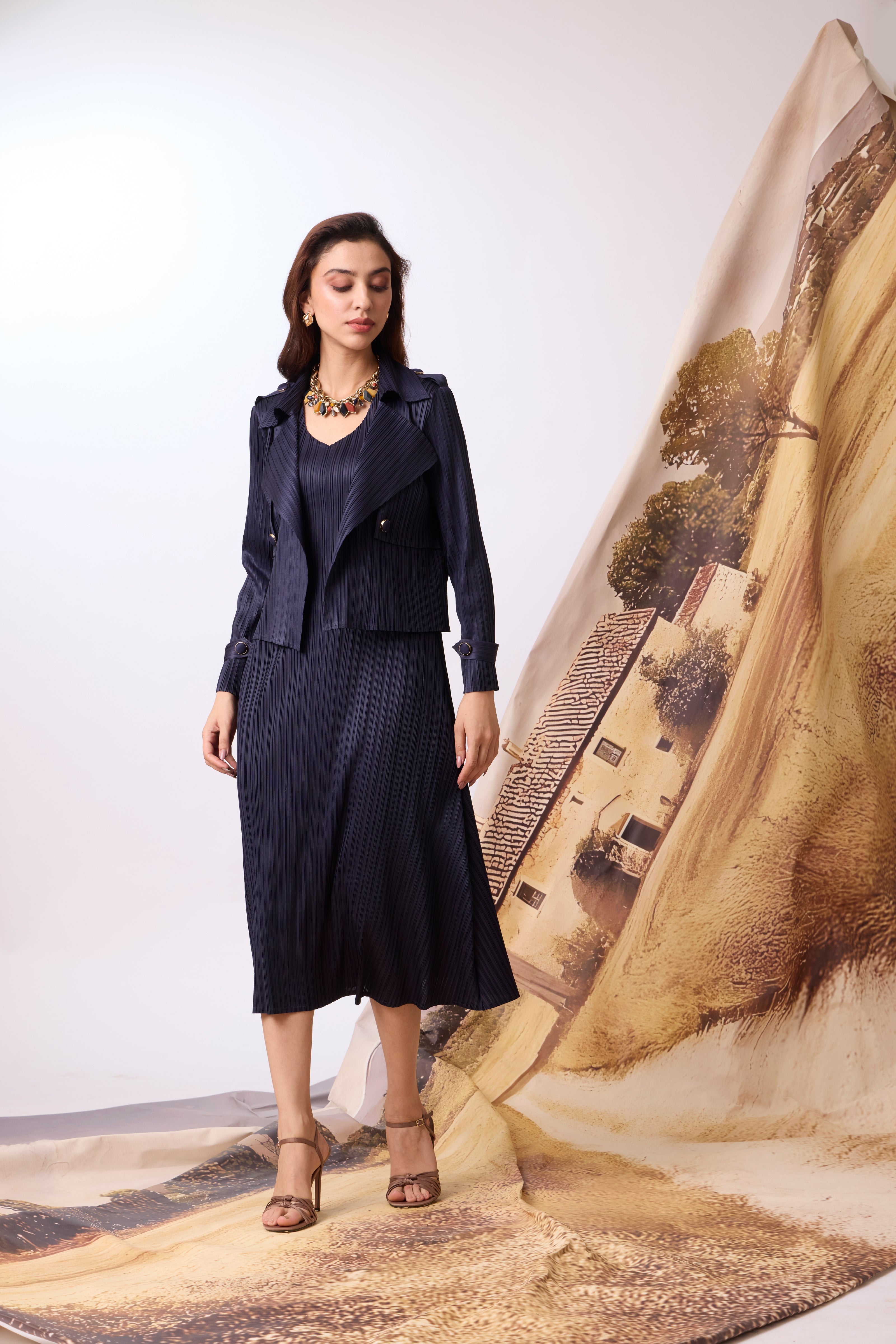 A classic pleated A line V neck dress with a matching short trench style jacket for power office looks which can easily transcend to formal dinners.