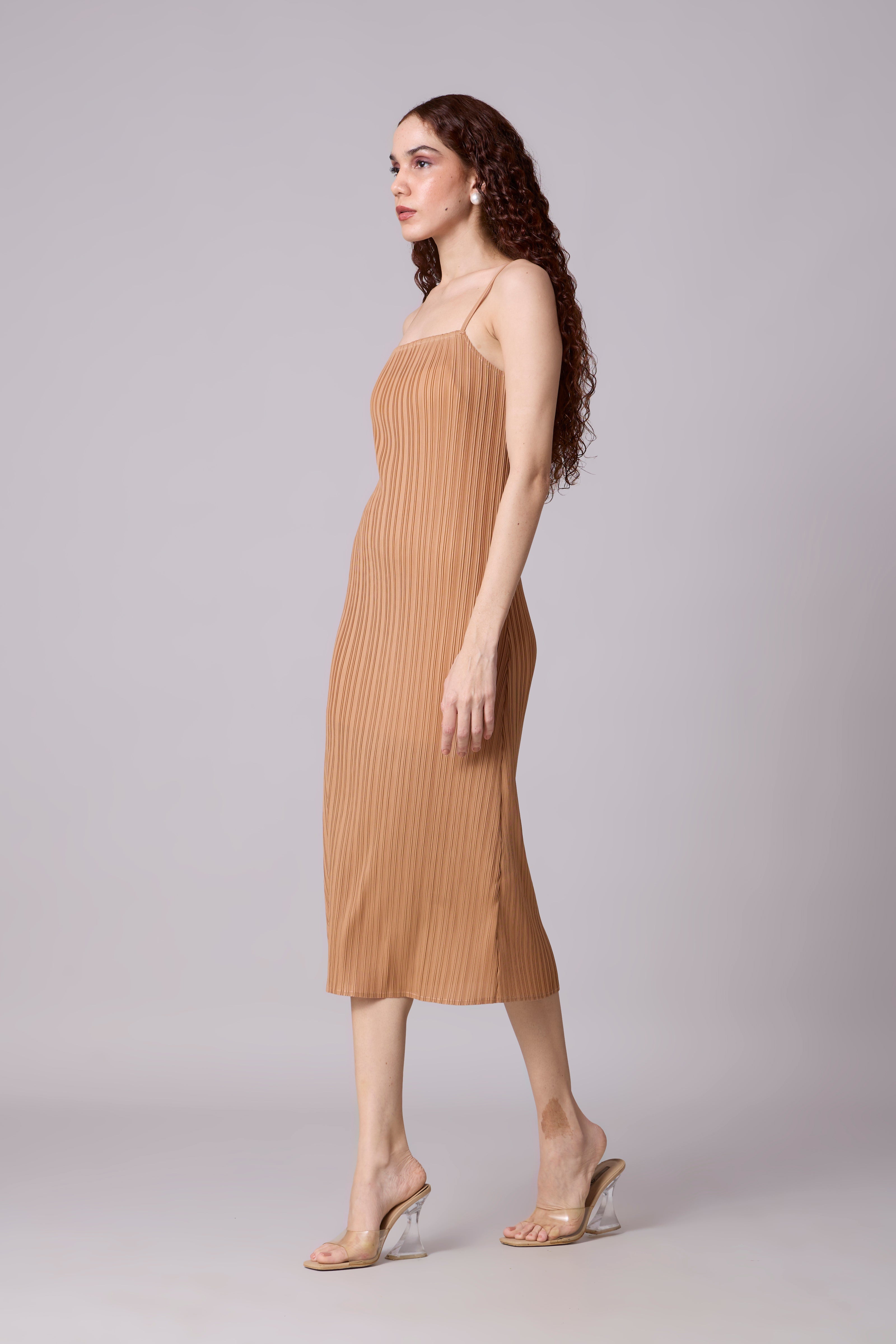 Accordion-pleated maxi slip dress comes with the slit on one side.