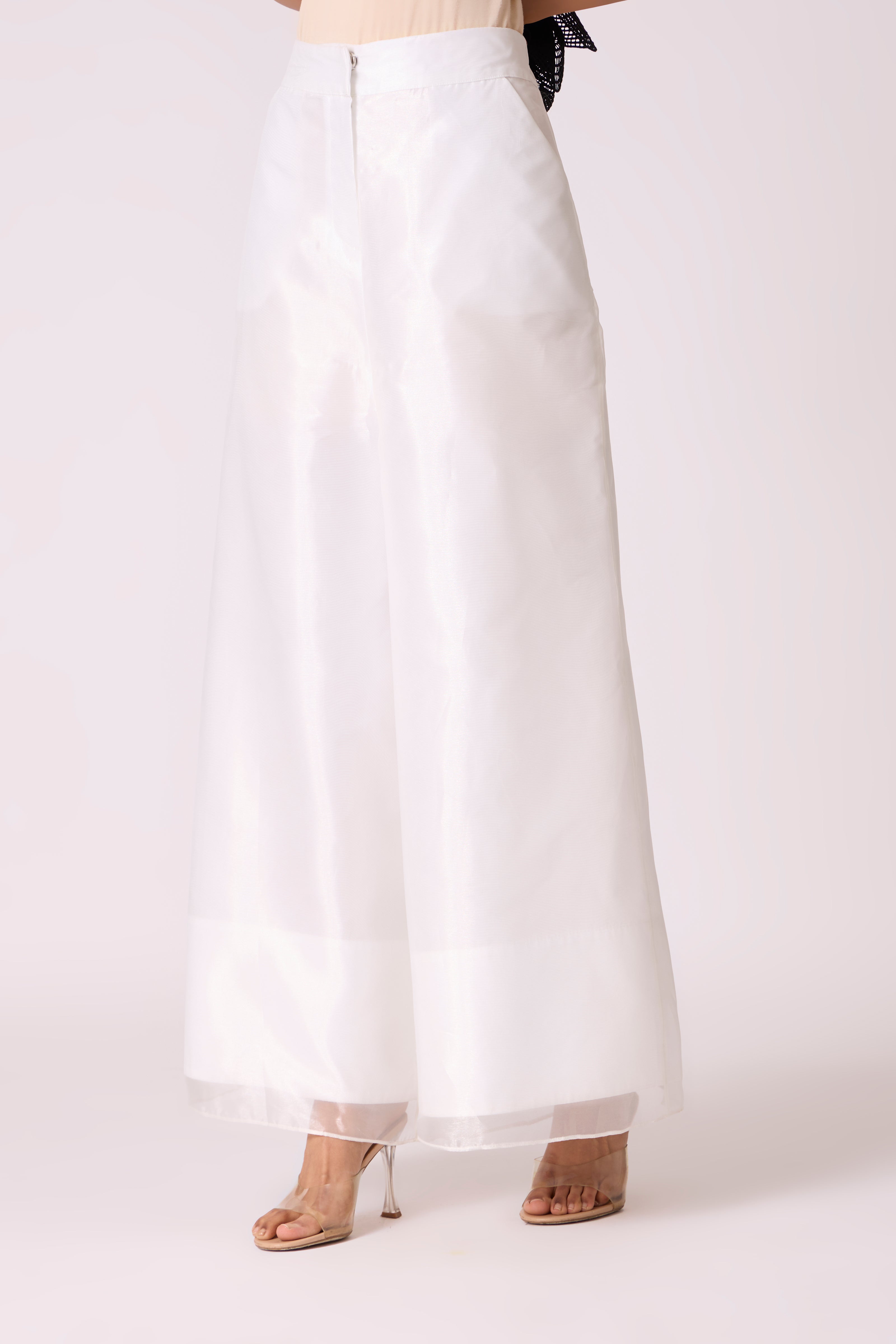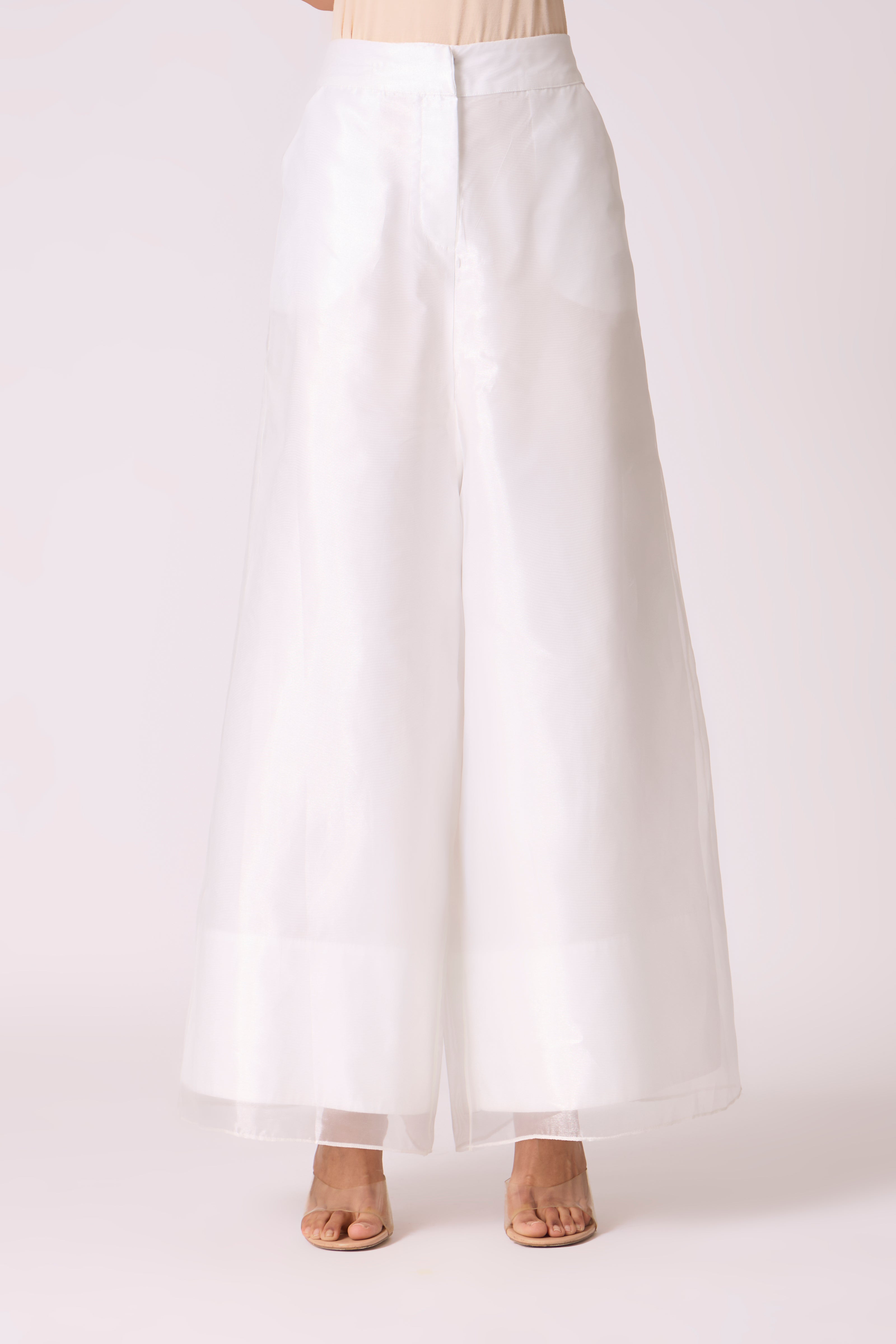 Sheer organza wide leg pants with a soft lining for easy wear. These wide-leg pants are light, floaty, and effortlessly chic; perfect for adding a touch of drama to your look.