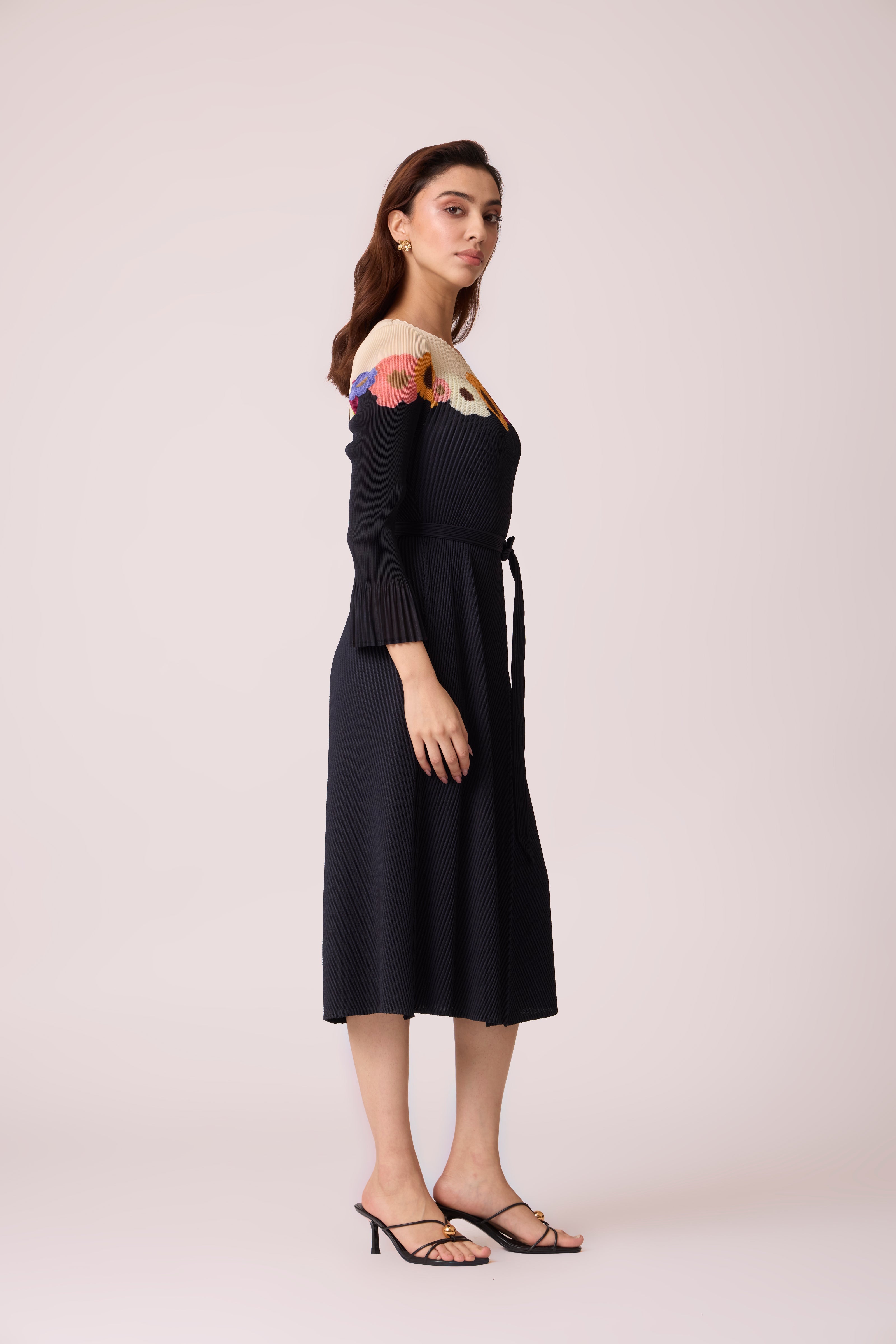 A charming pleated floral colour block printed A line dress. Comes with a same fabric belt for those who want a more fitted look.
