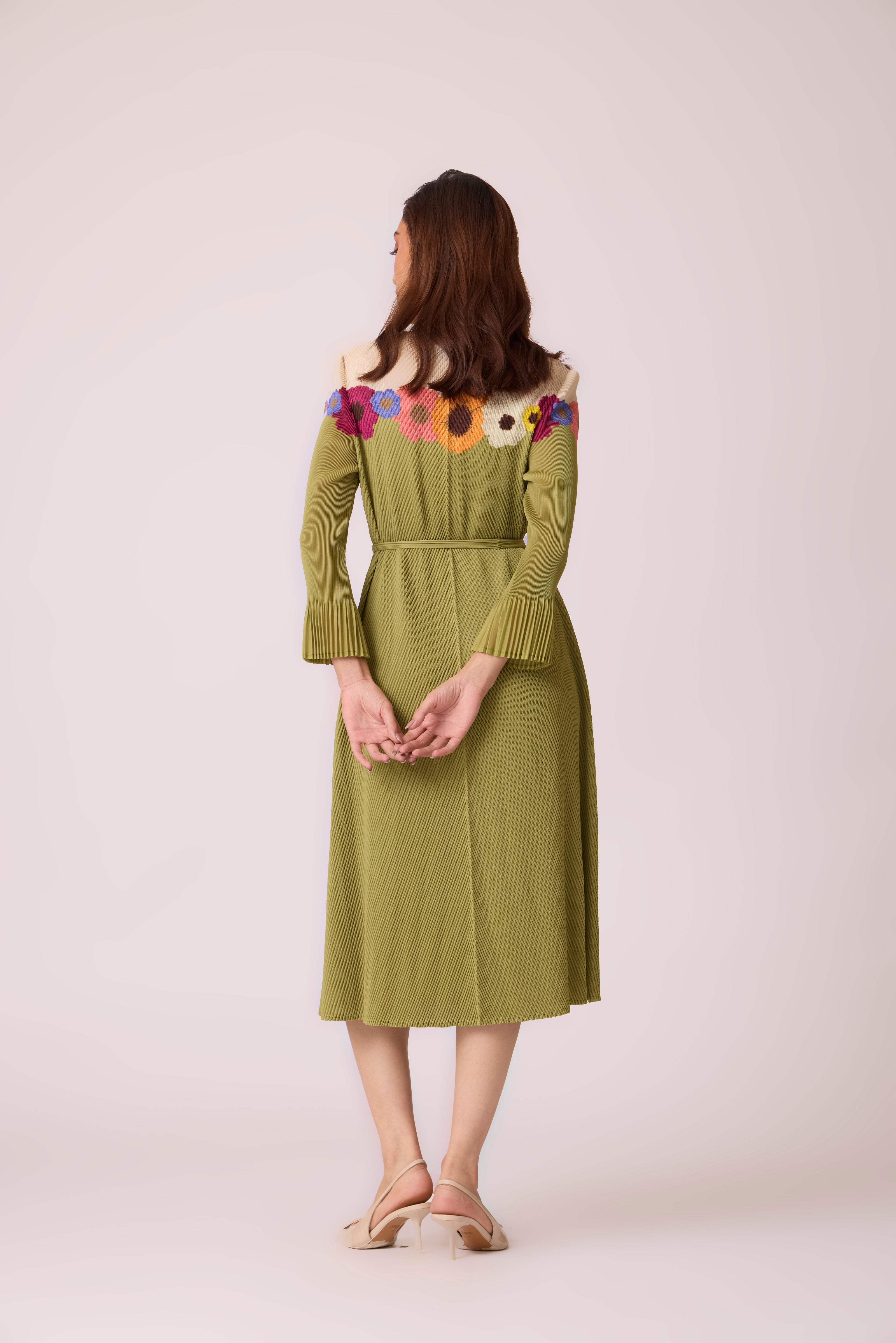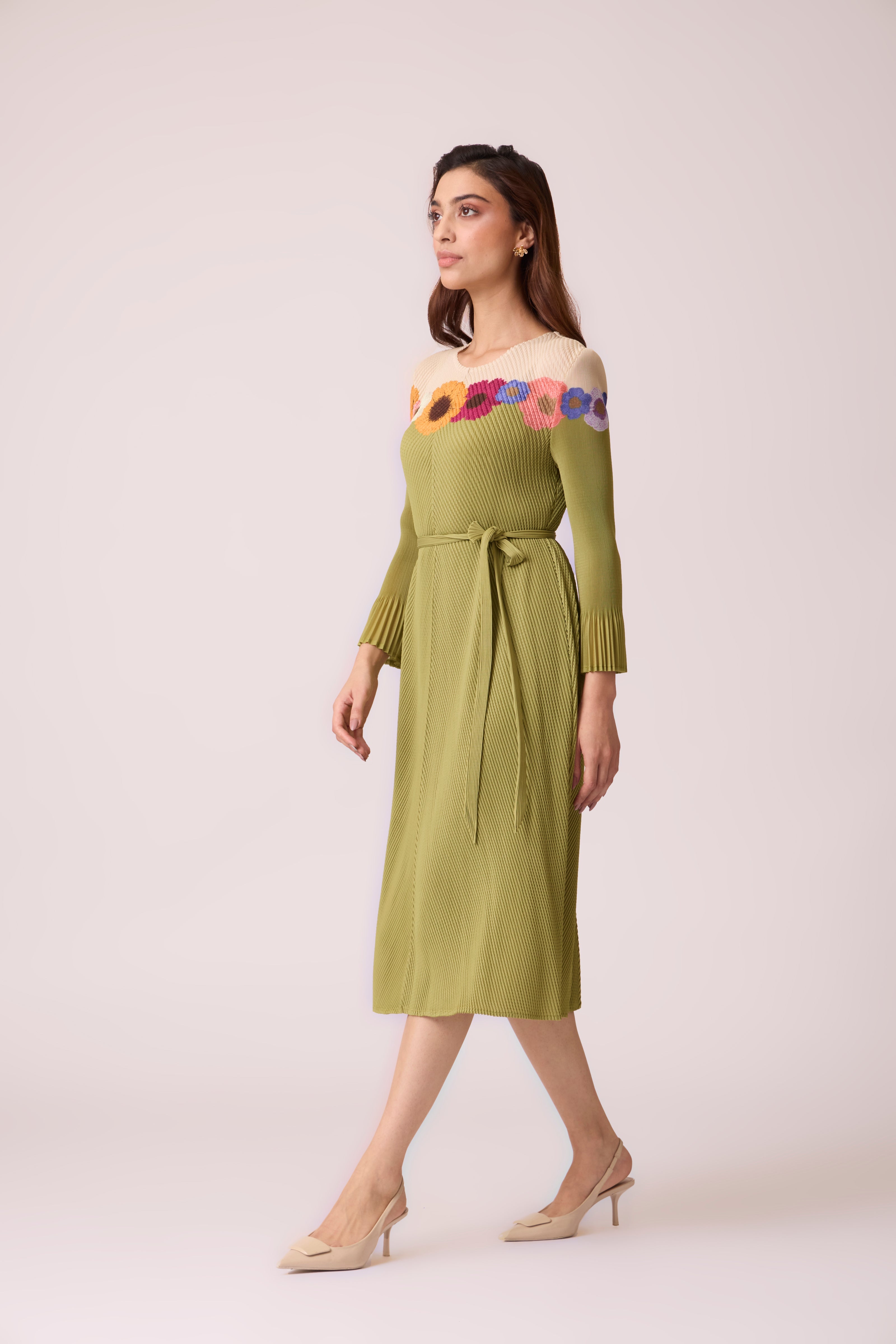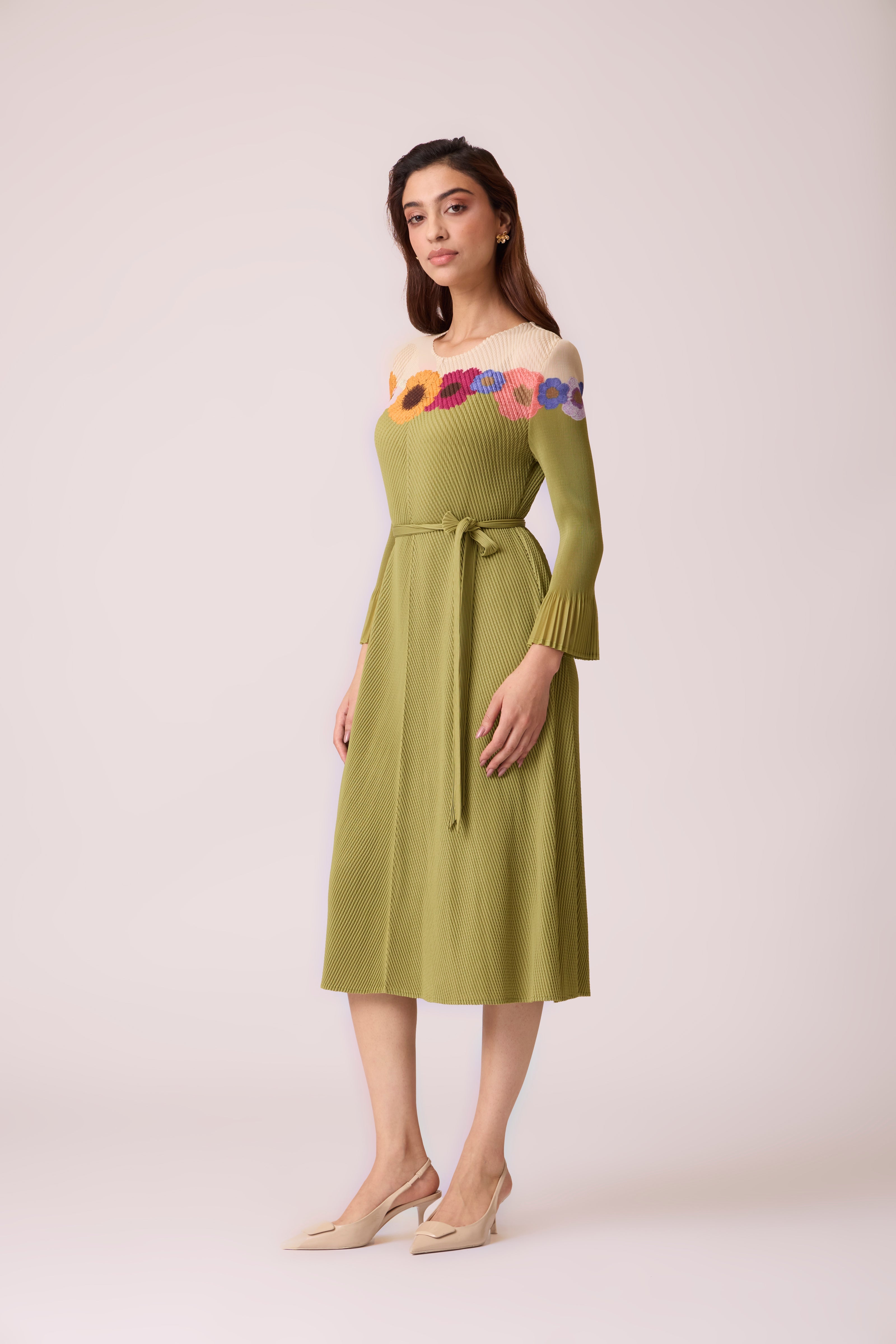 A charming pleated floral colour block printed A line dress. Comes with a same fabric belt for those who want a more fitted look.