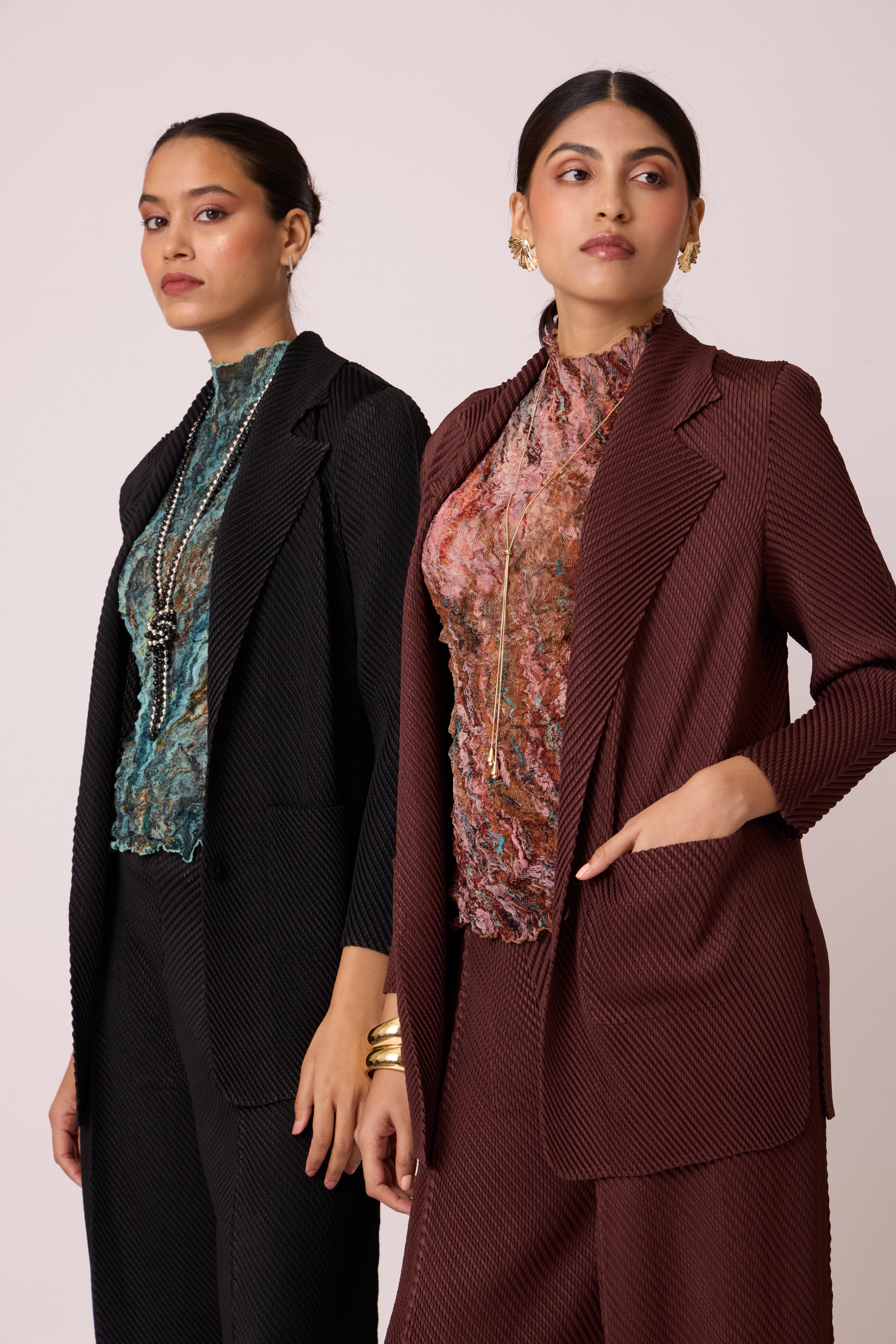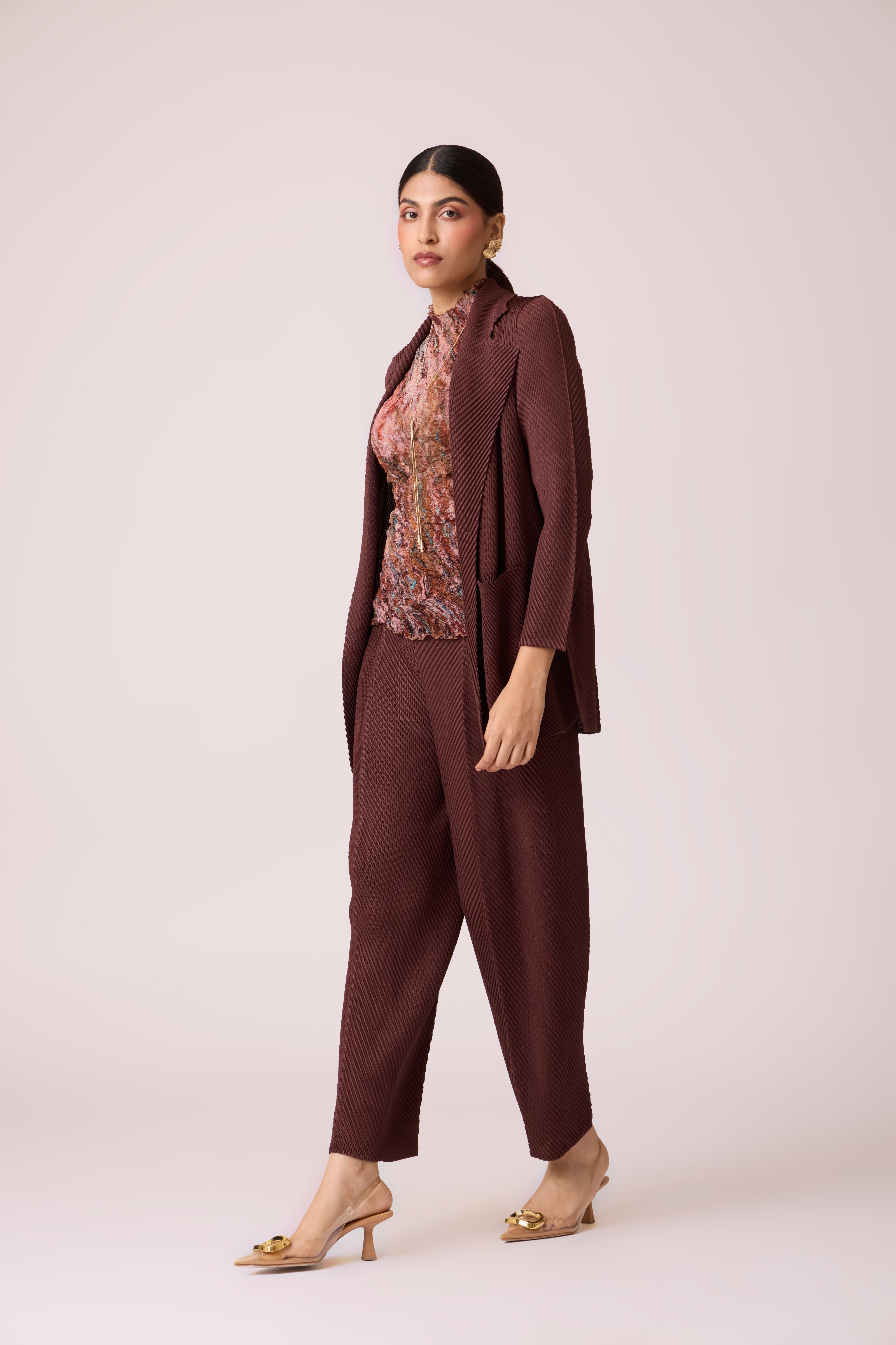 A lightweight blazer set in the new novel scaled pleating technique. Pair it with fitted, textured or fitted tank top for an elevated formal look.