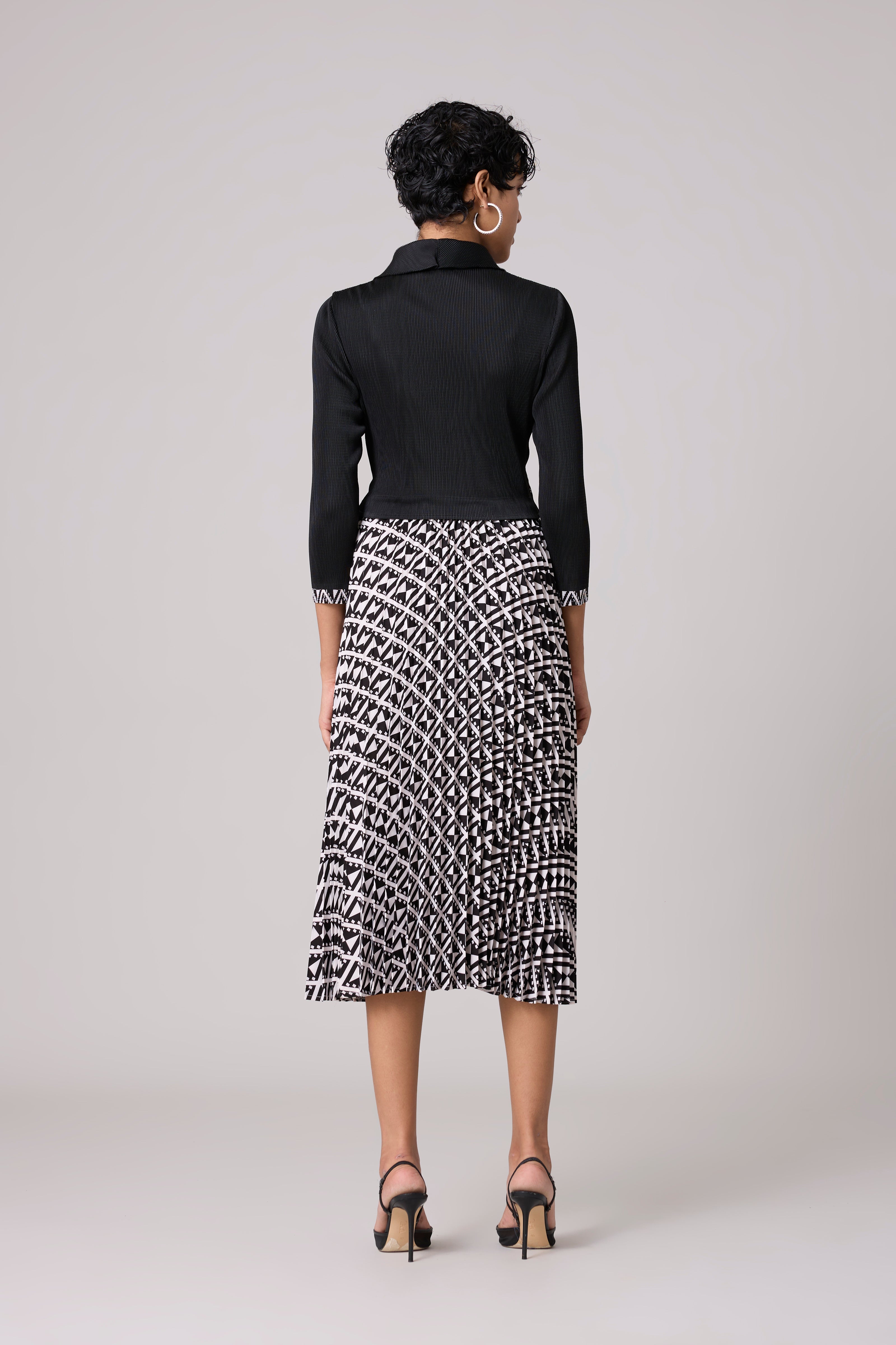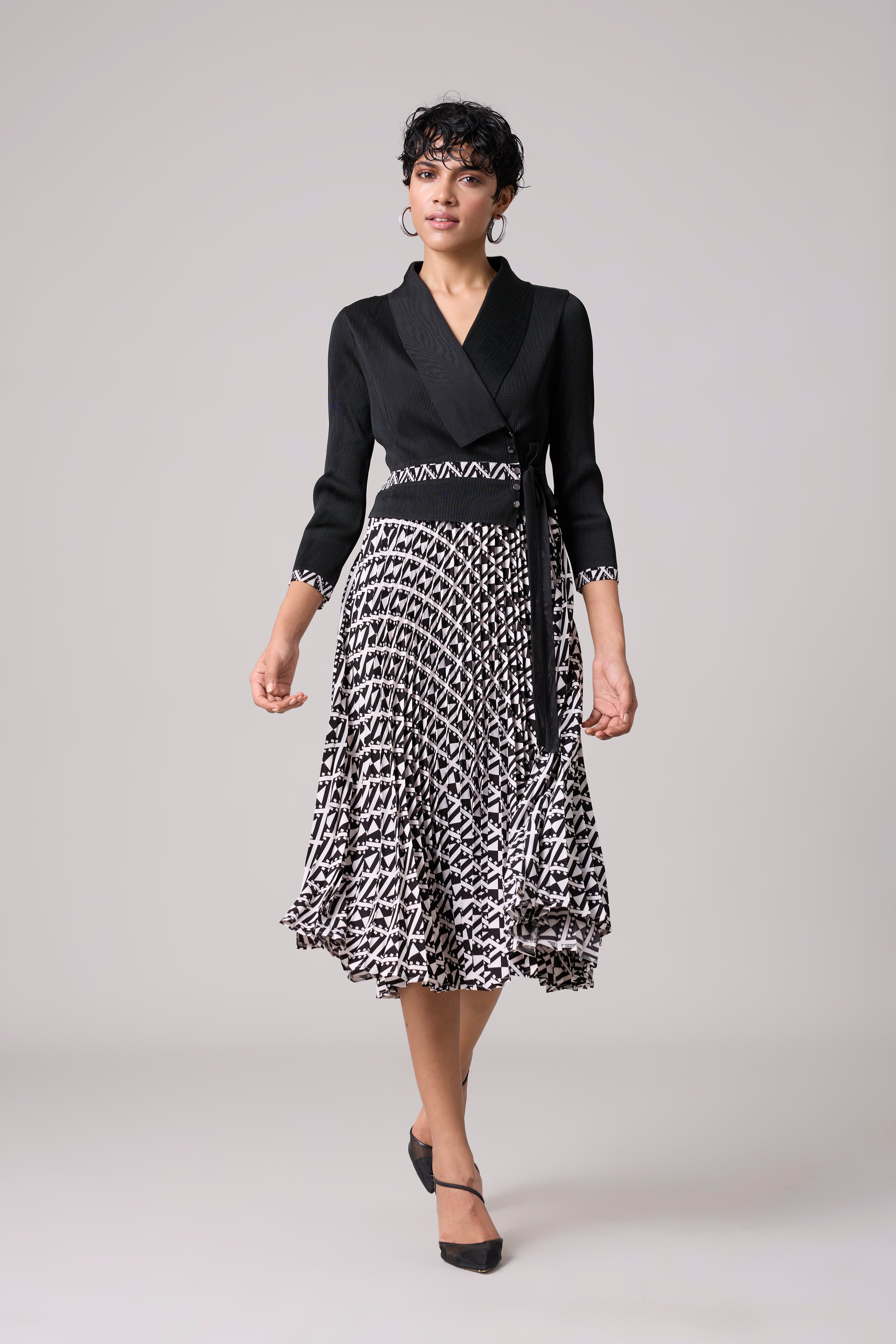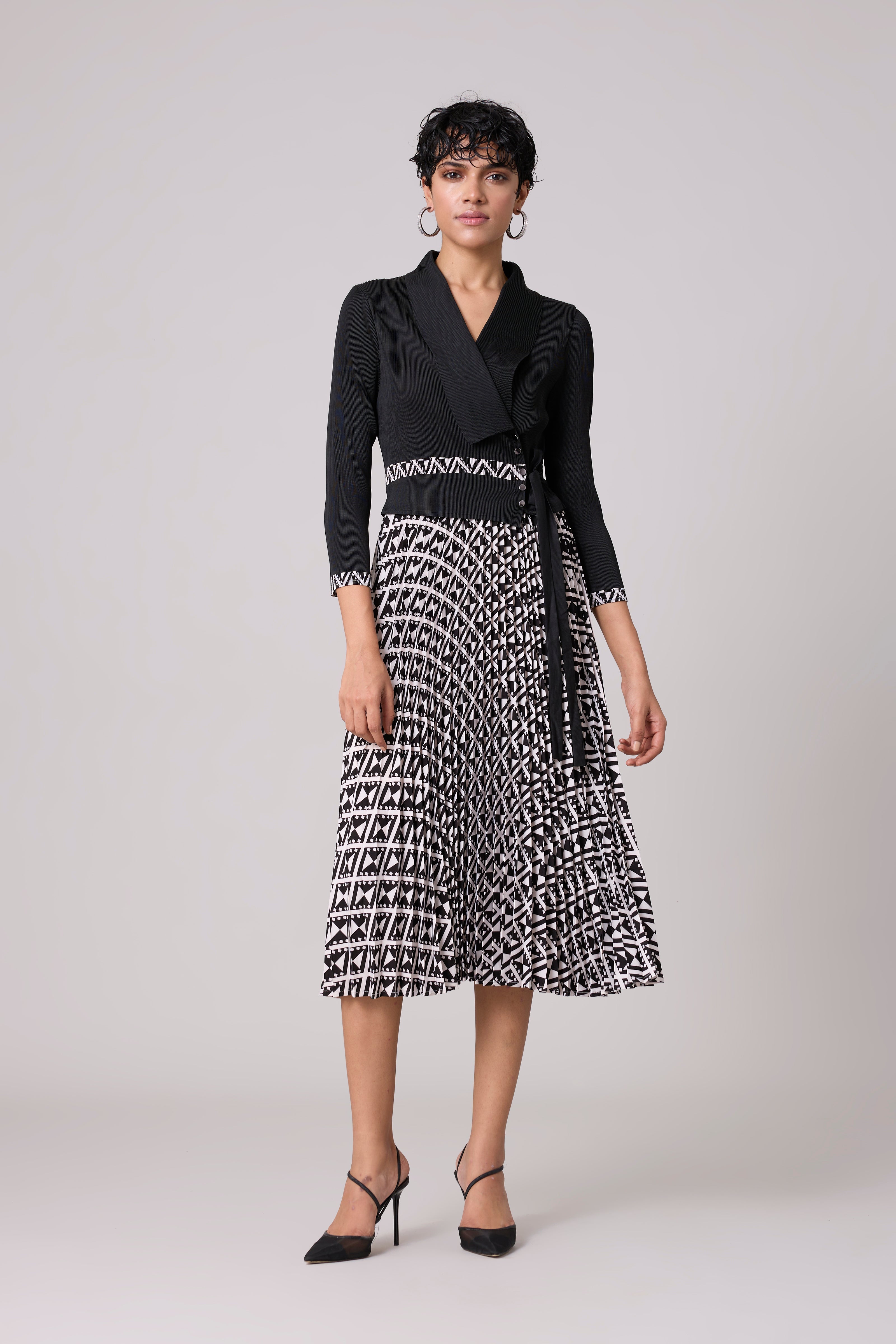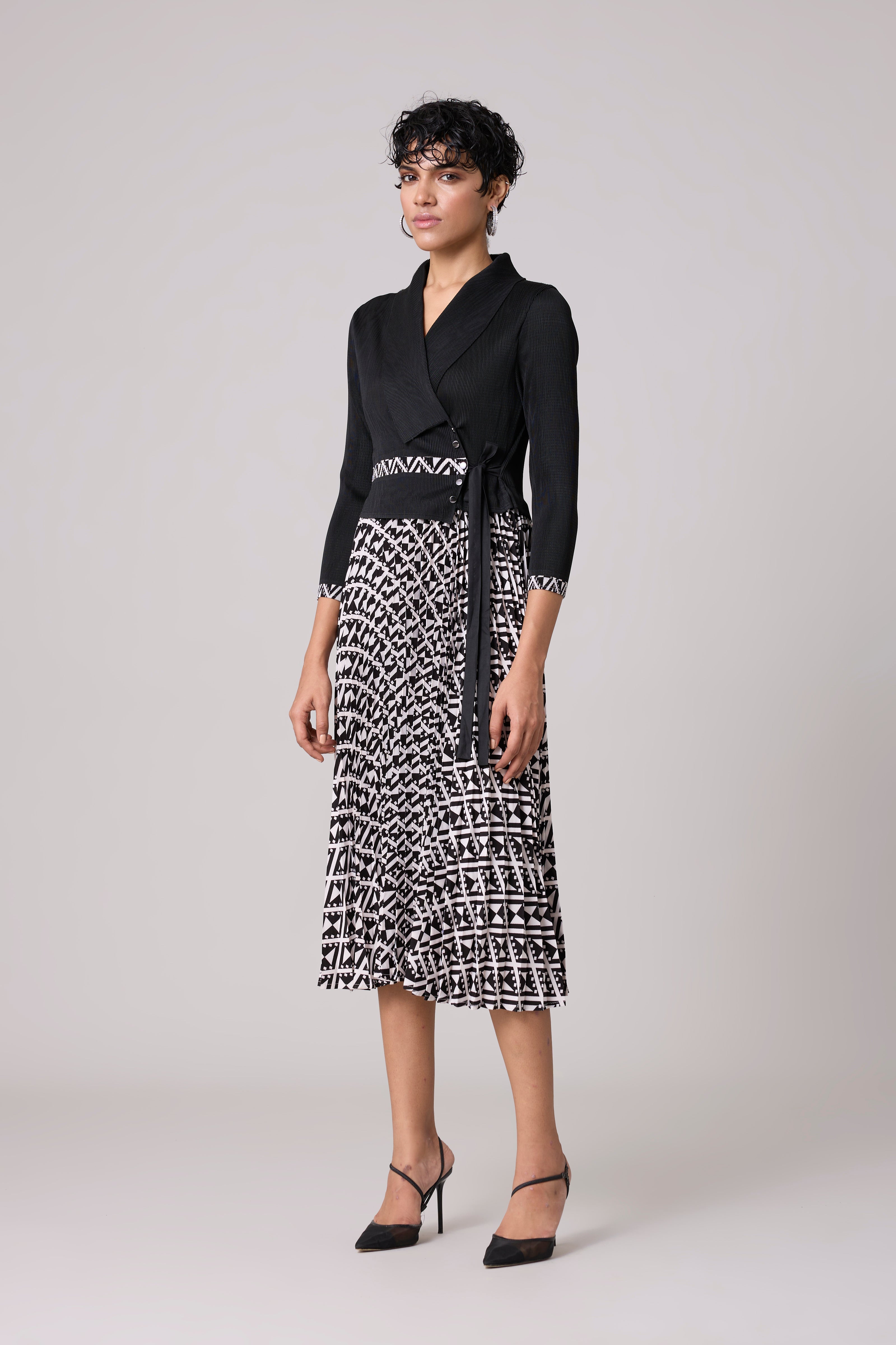 A dress featuring a solid colored bodice and a vibrant geometric print, embellished with a buttons. Perfect blend of modern style and timeless elegance.
