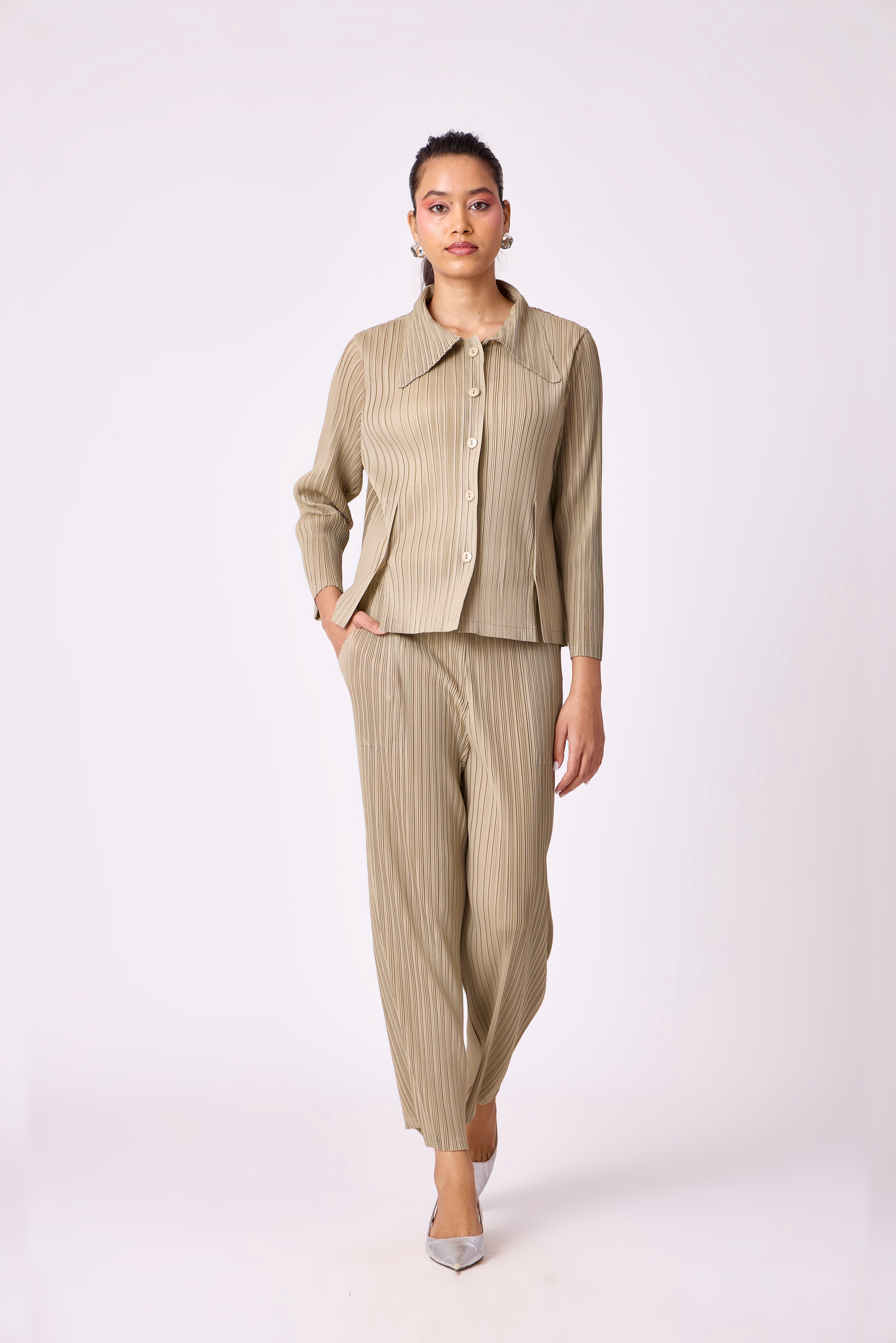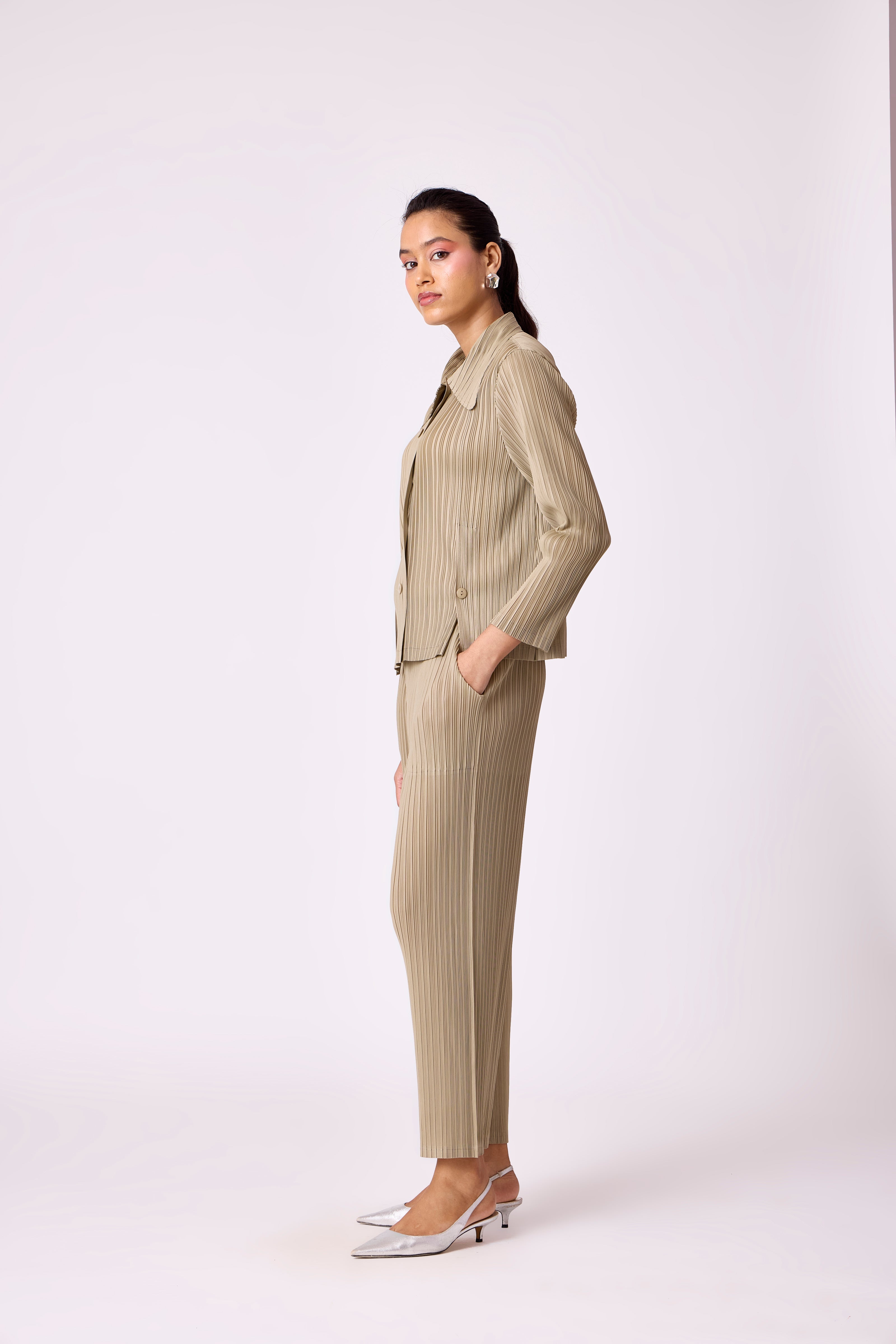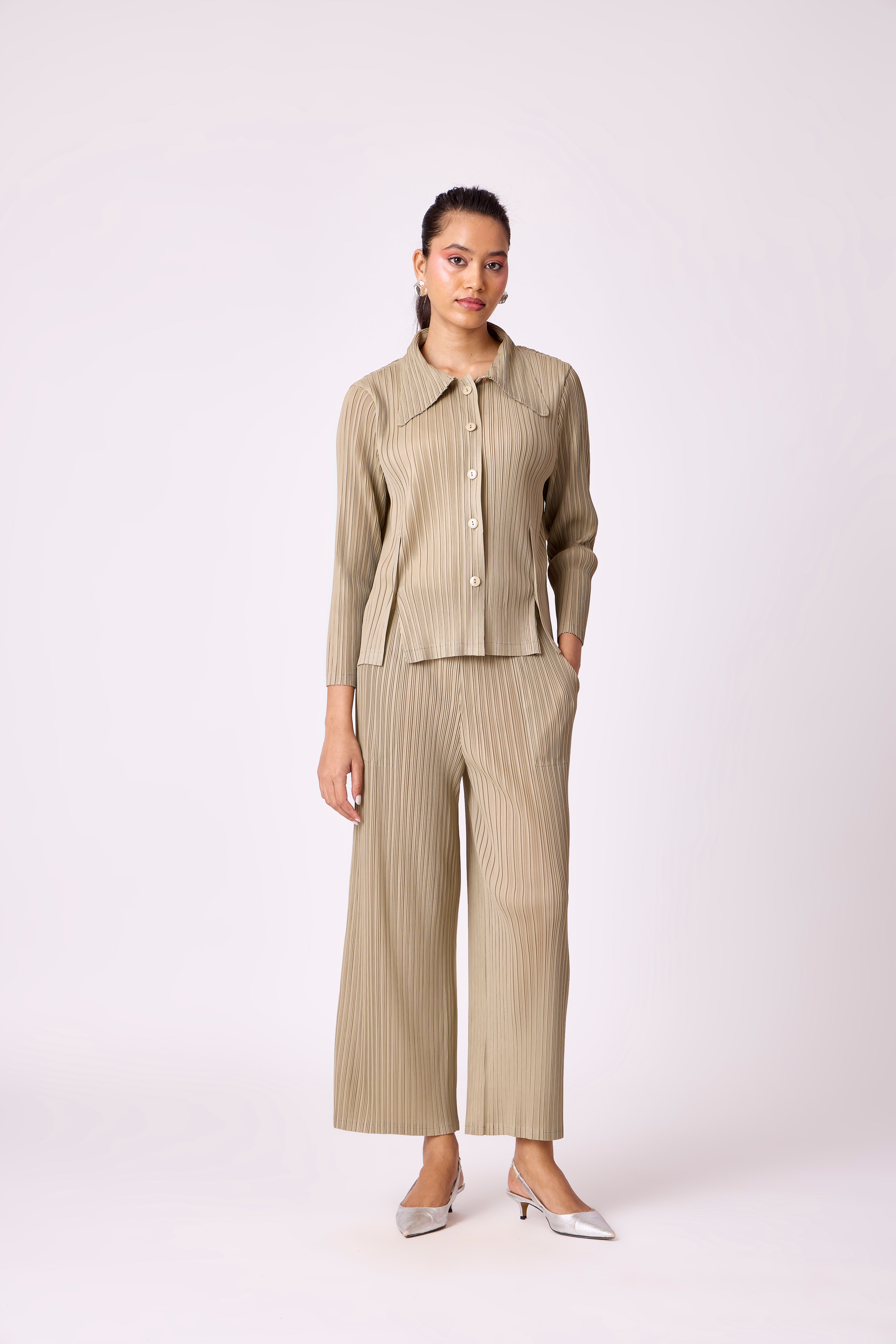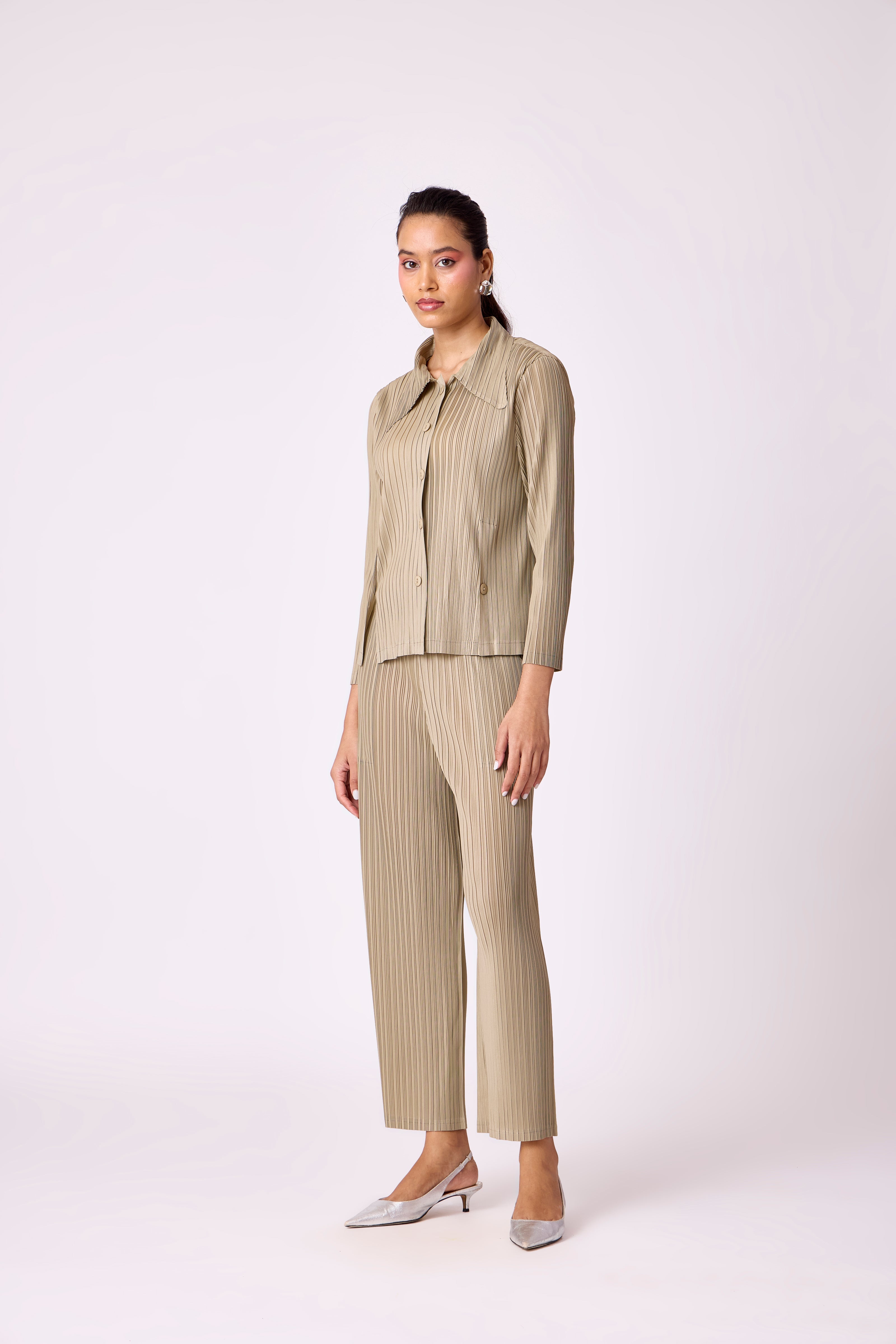 A pleated set with a relaxed button-down shirt featuring slit detailing - paired with classic straight leg pants