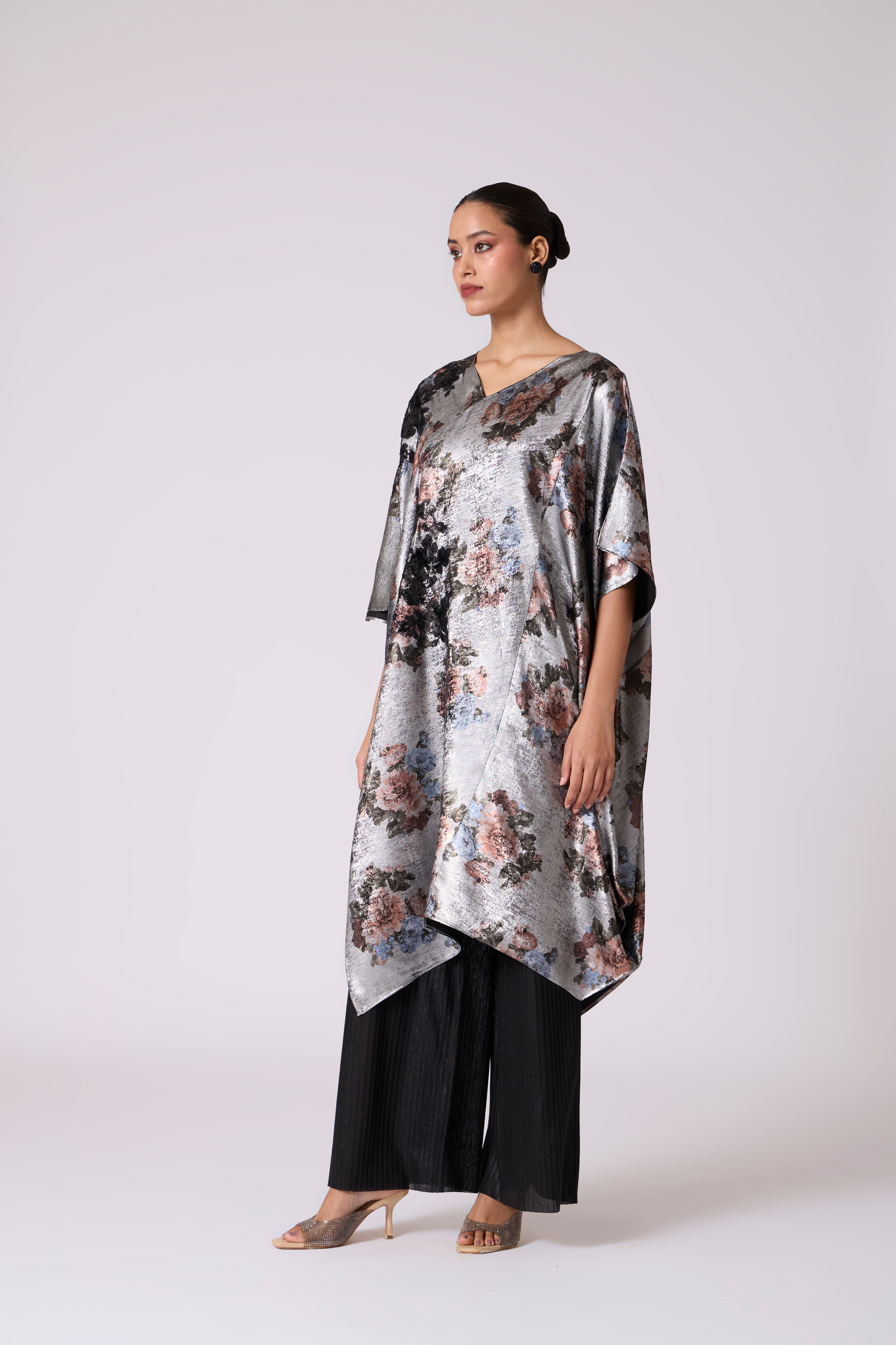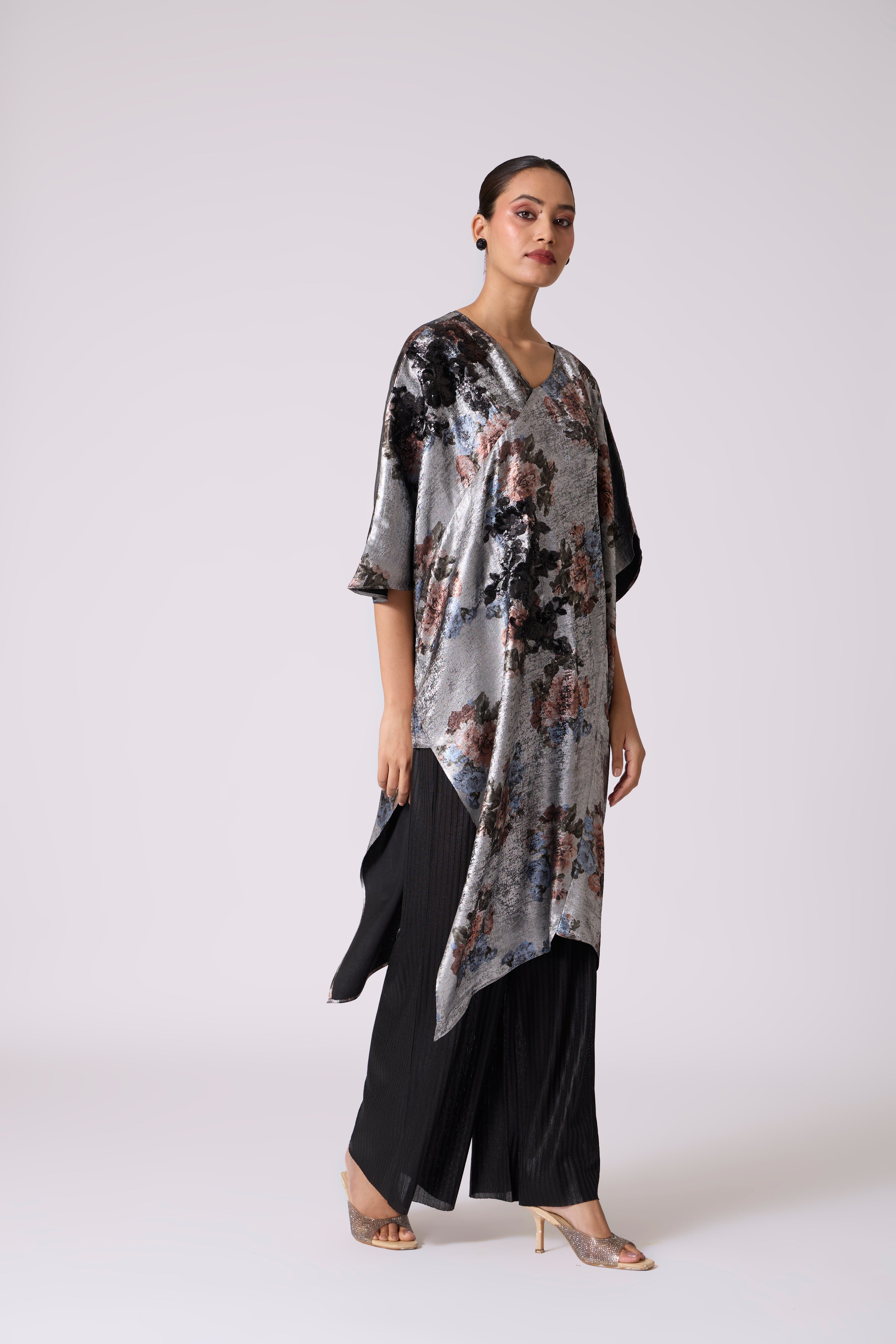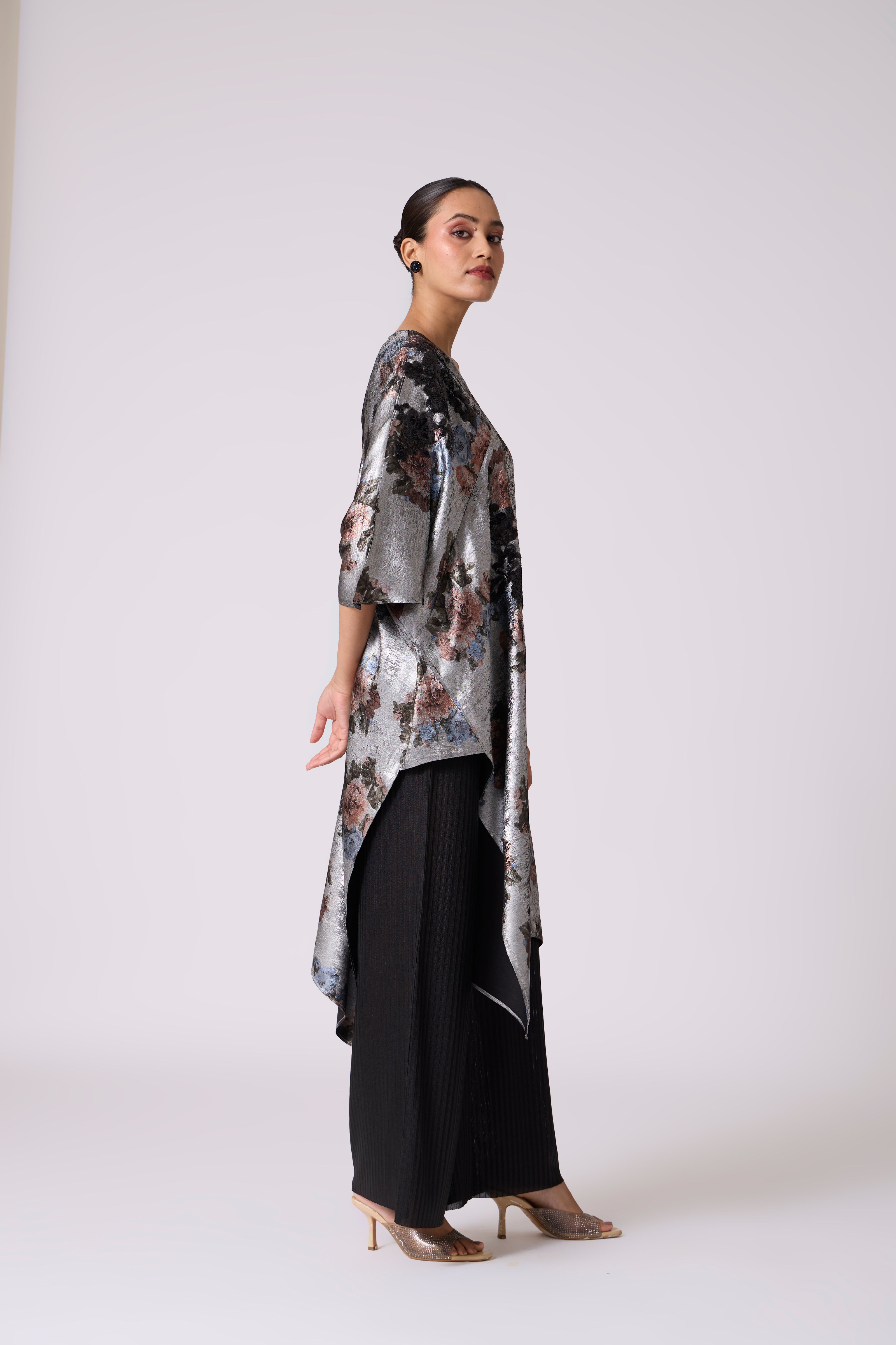 An elegant asymmetric paneled tunic with dolman sleeves, short on one side, long draped cowl on the other and highlighted with sequined hand embroidery. Paired with our wide leg classic comfortable knit pants.