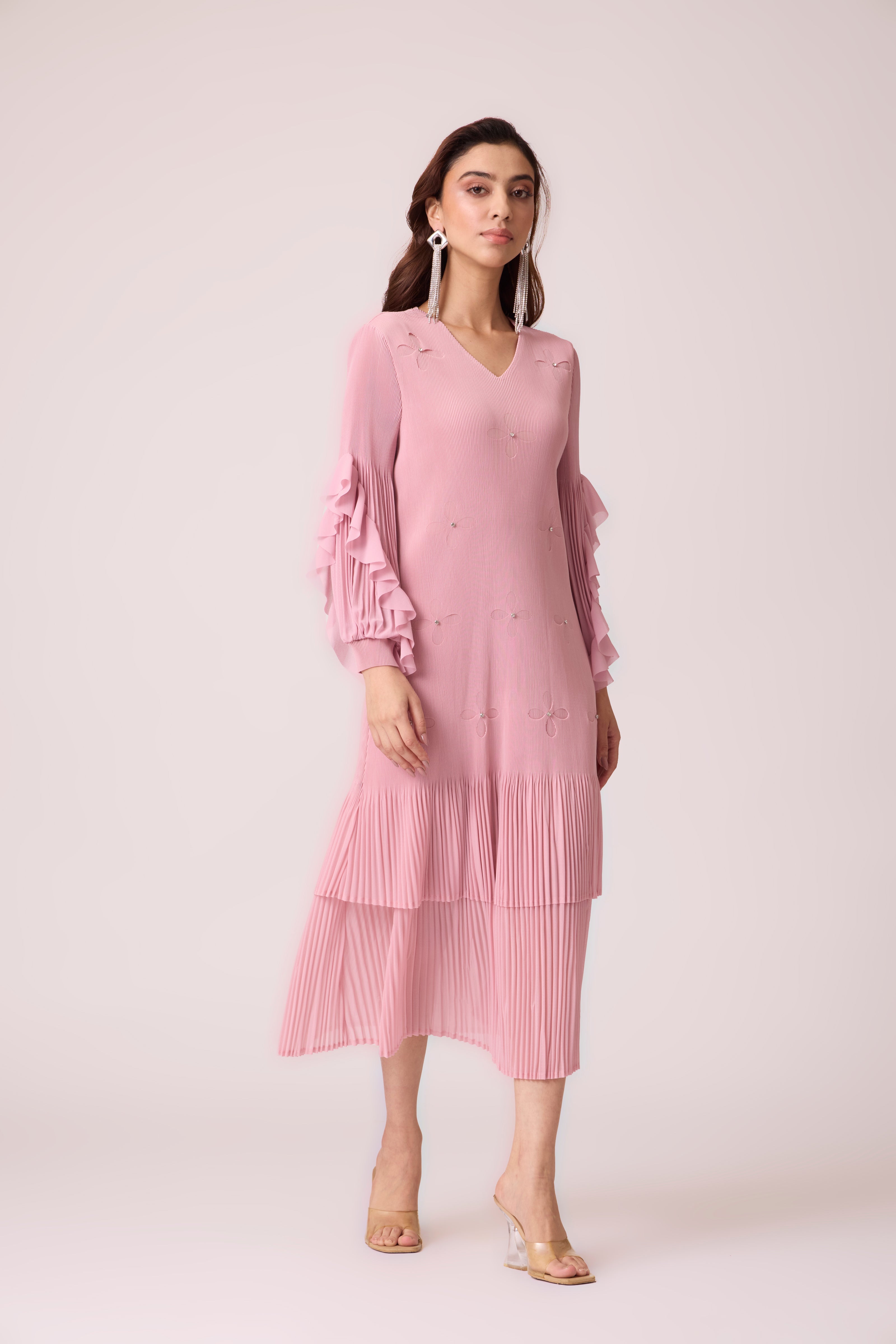 A line dress comprising of a charming waterfall ruffle sleeve, tiered hemline and laser cut self fabric flowers.