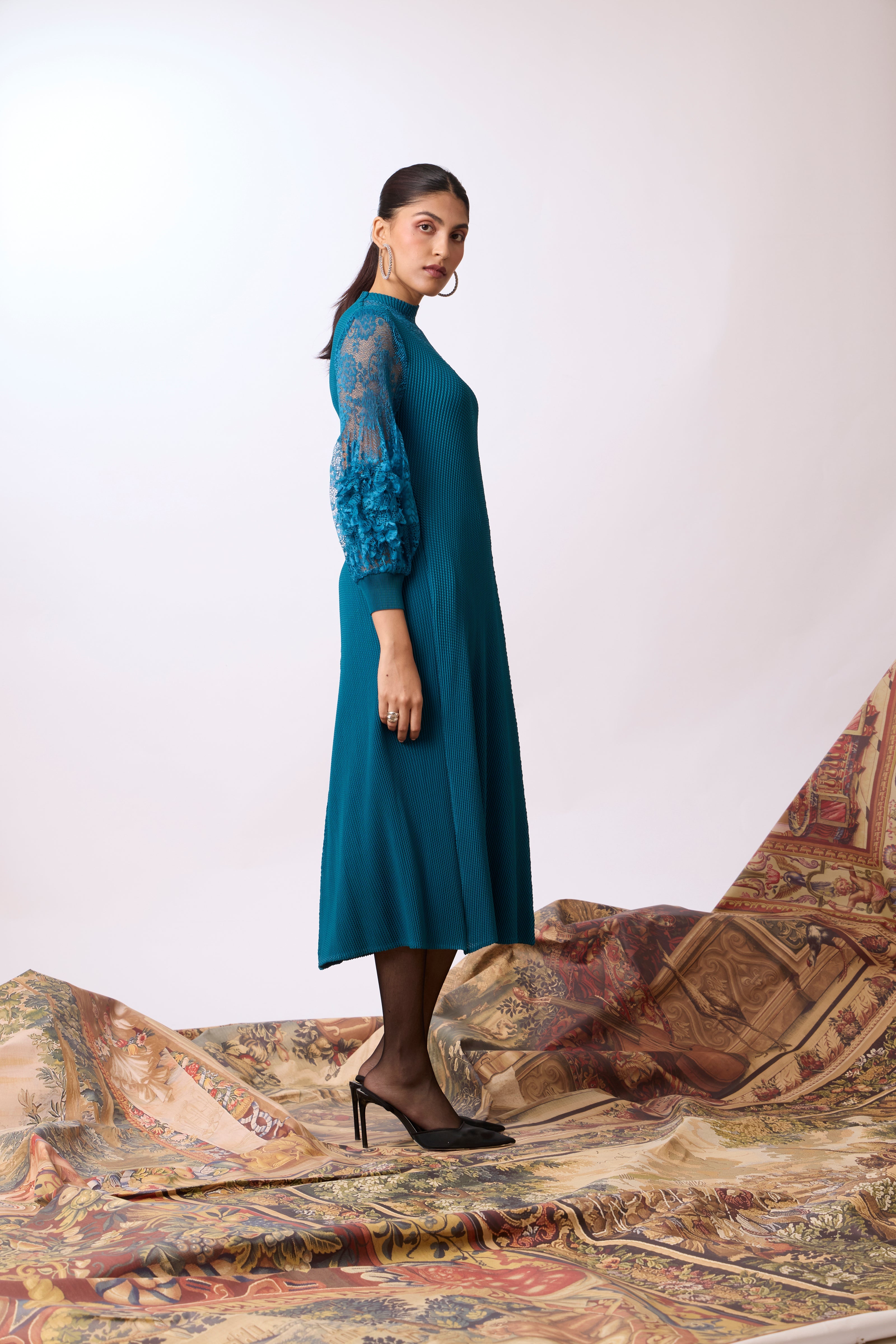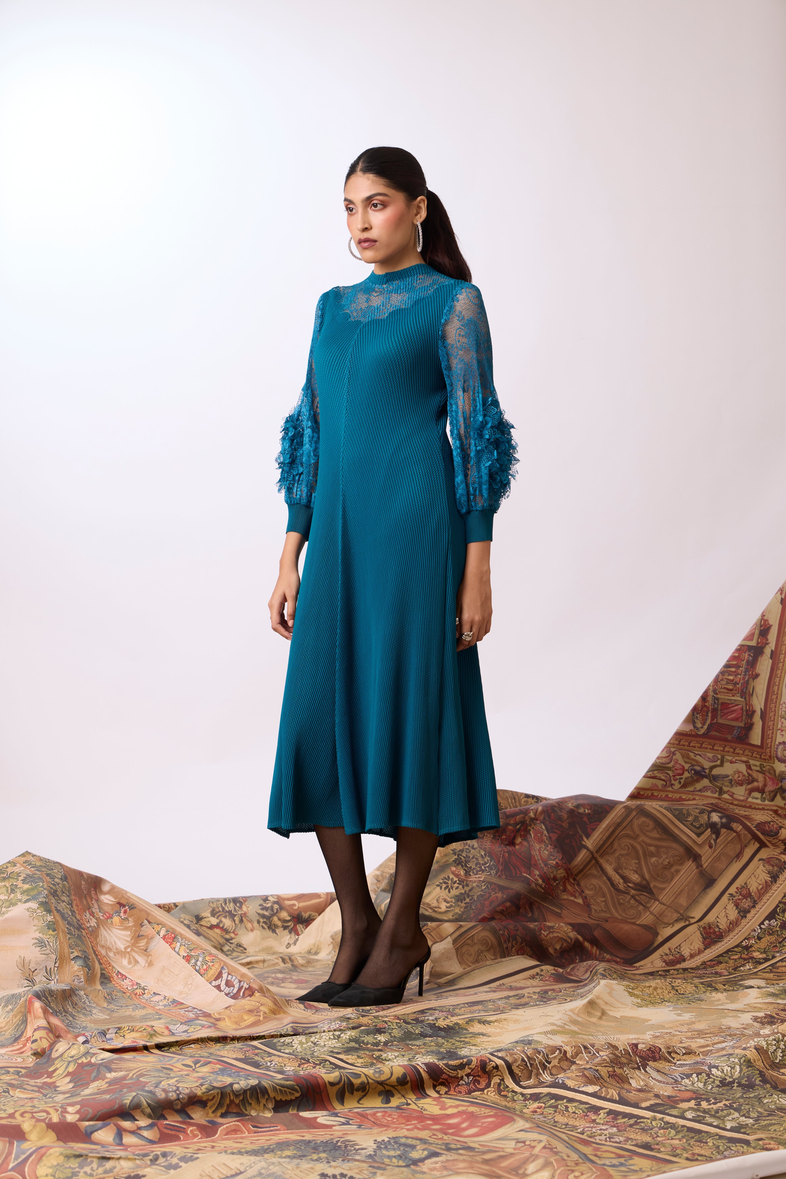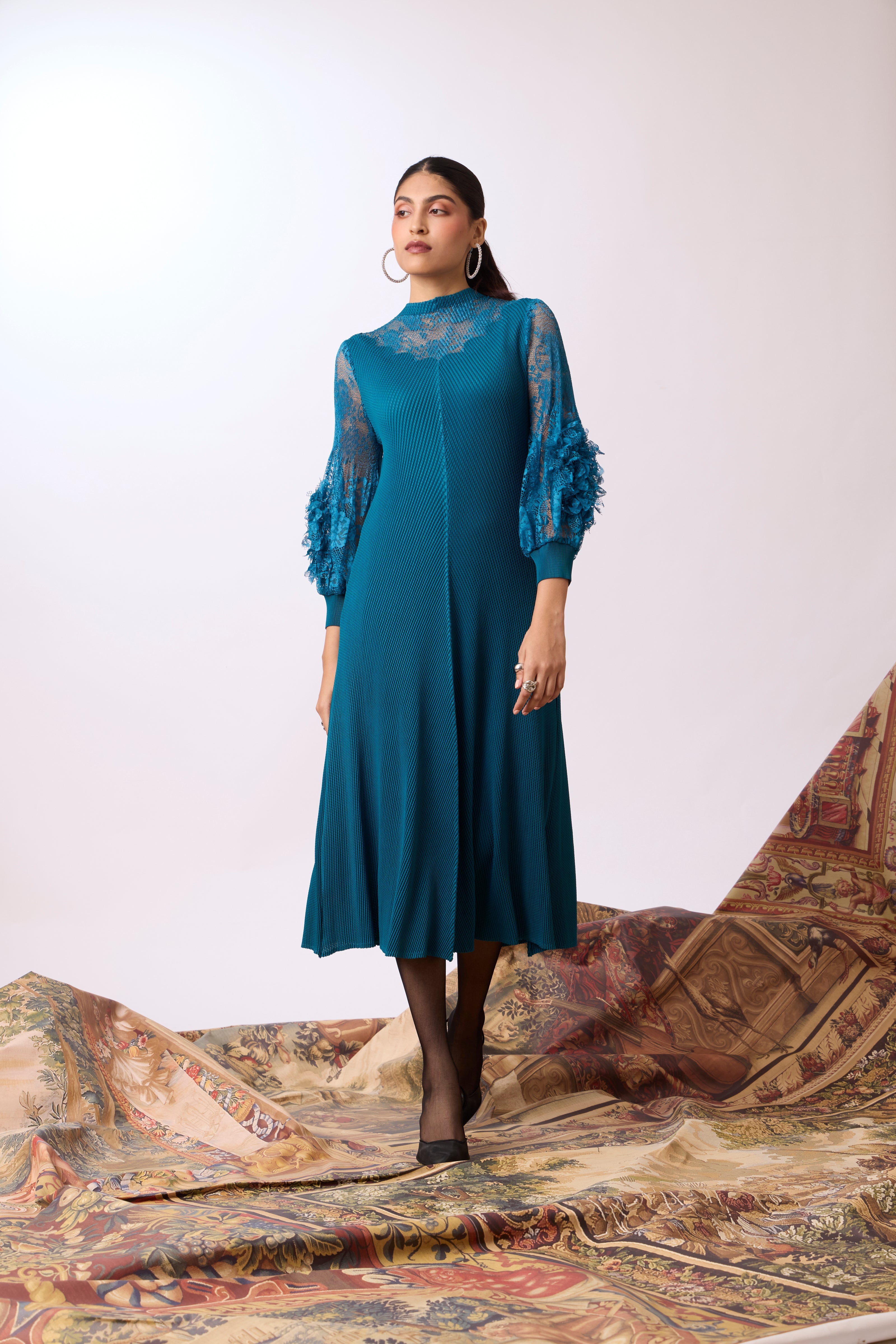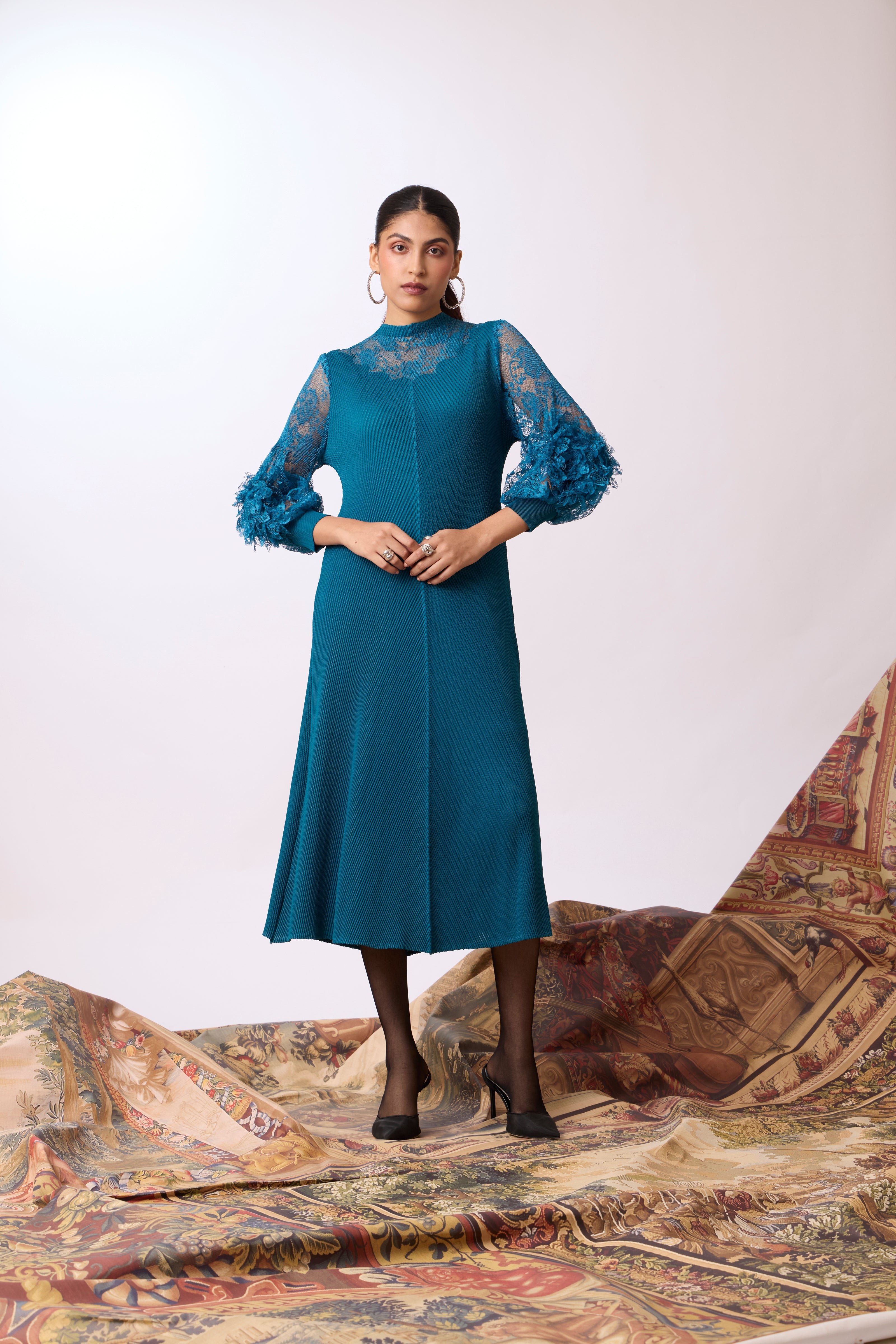 A soft scale pleated fit and flare A line dress with lace inserts for a dressy evening look.