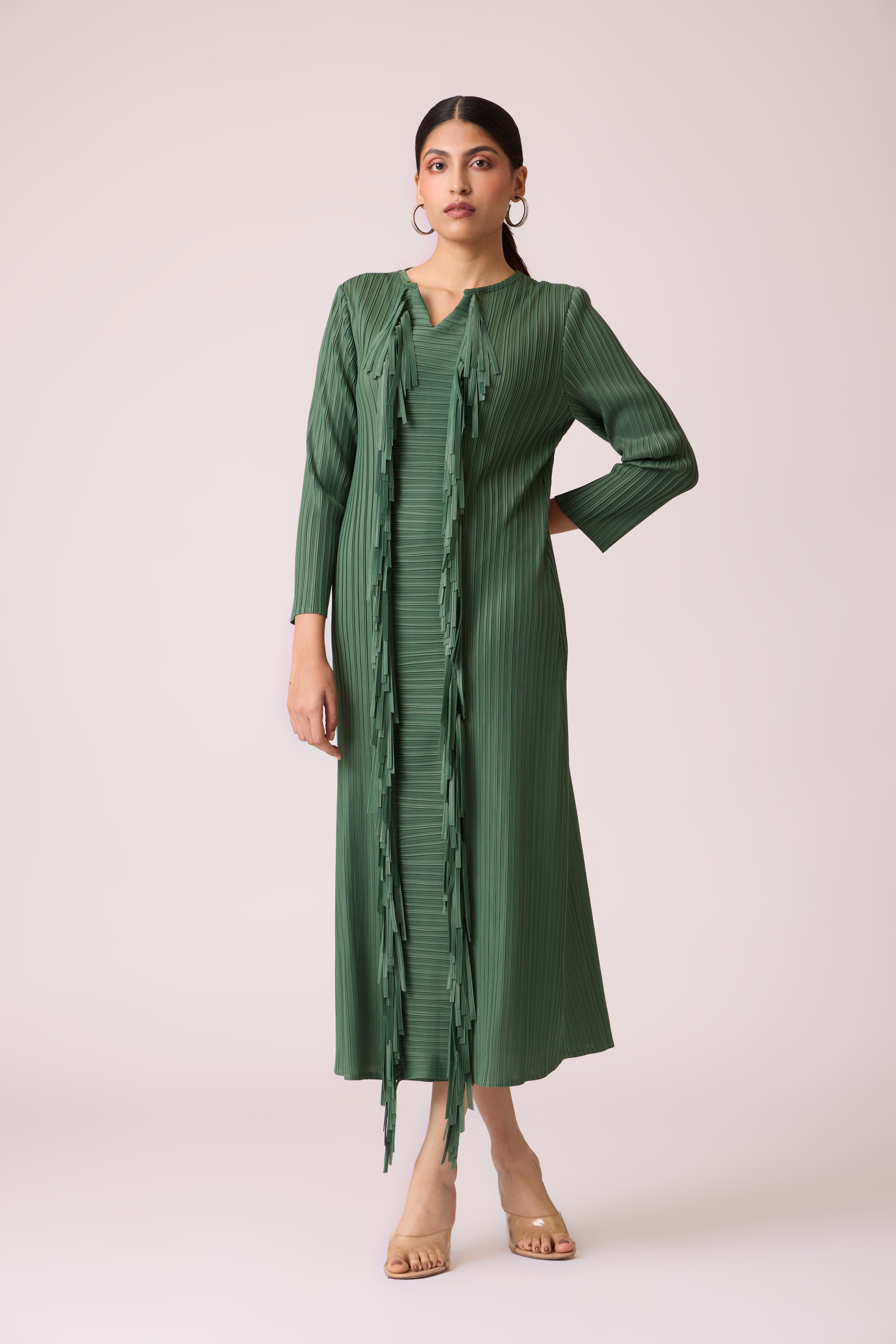 A Long sleeve fringe detail dress for relaxed formal evenings.