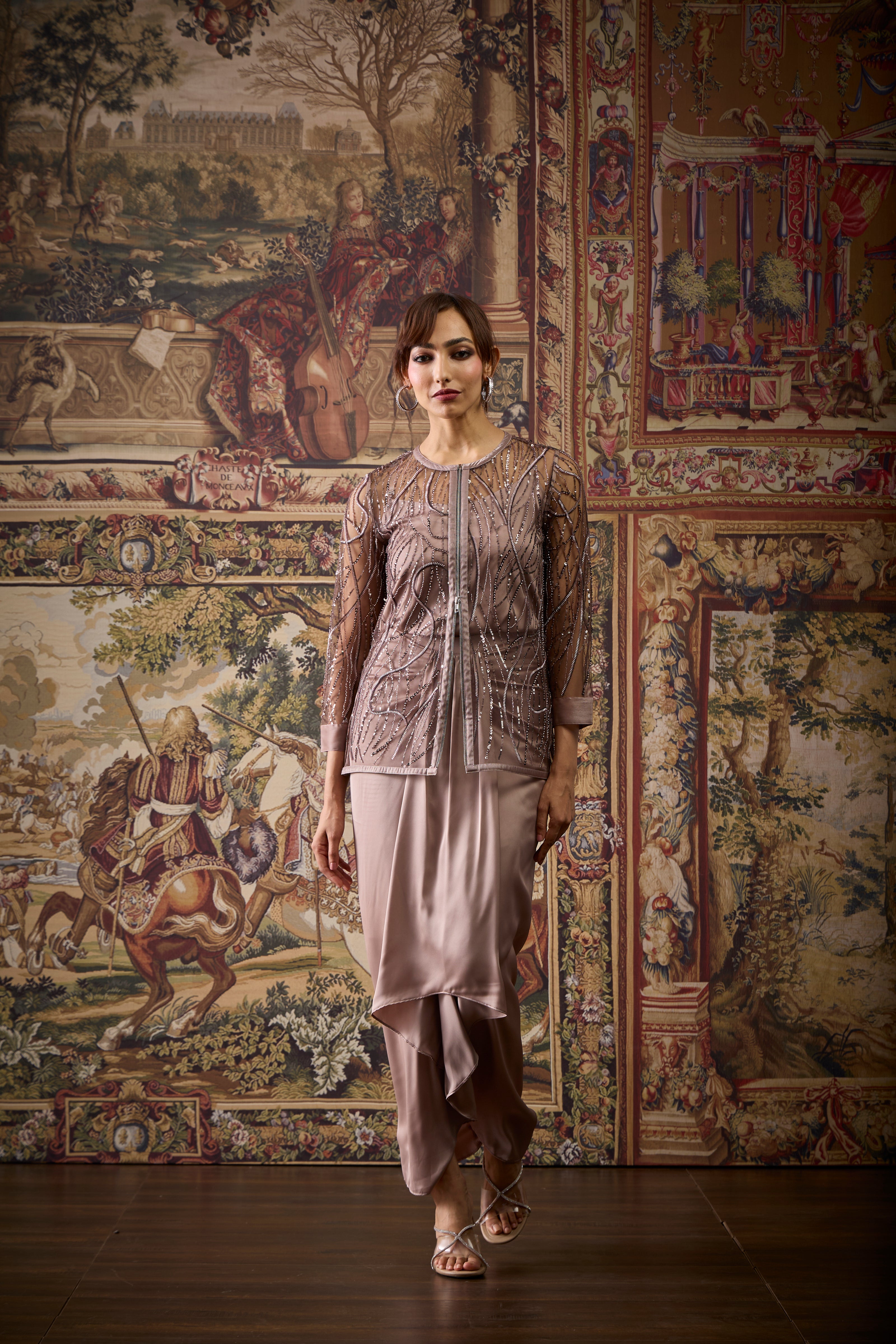 Luxe embroidered jacket with sleek reverse zipper front closure. A sheer layering piece that comes with a satin slip.