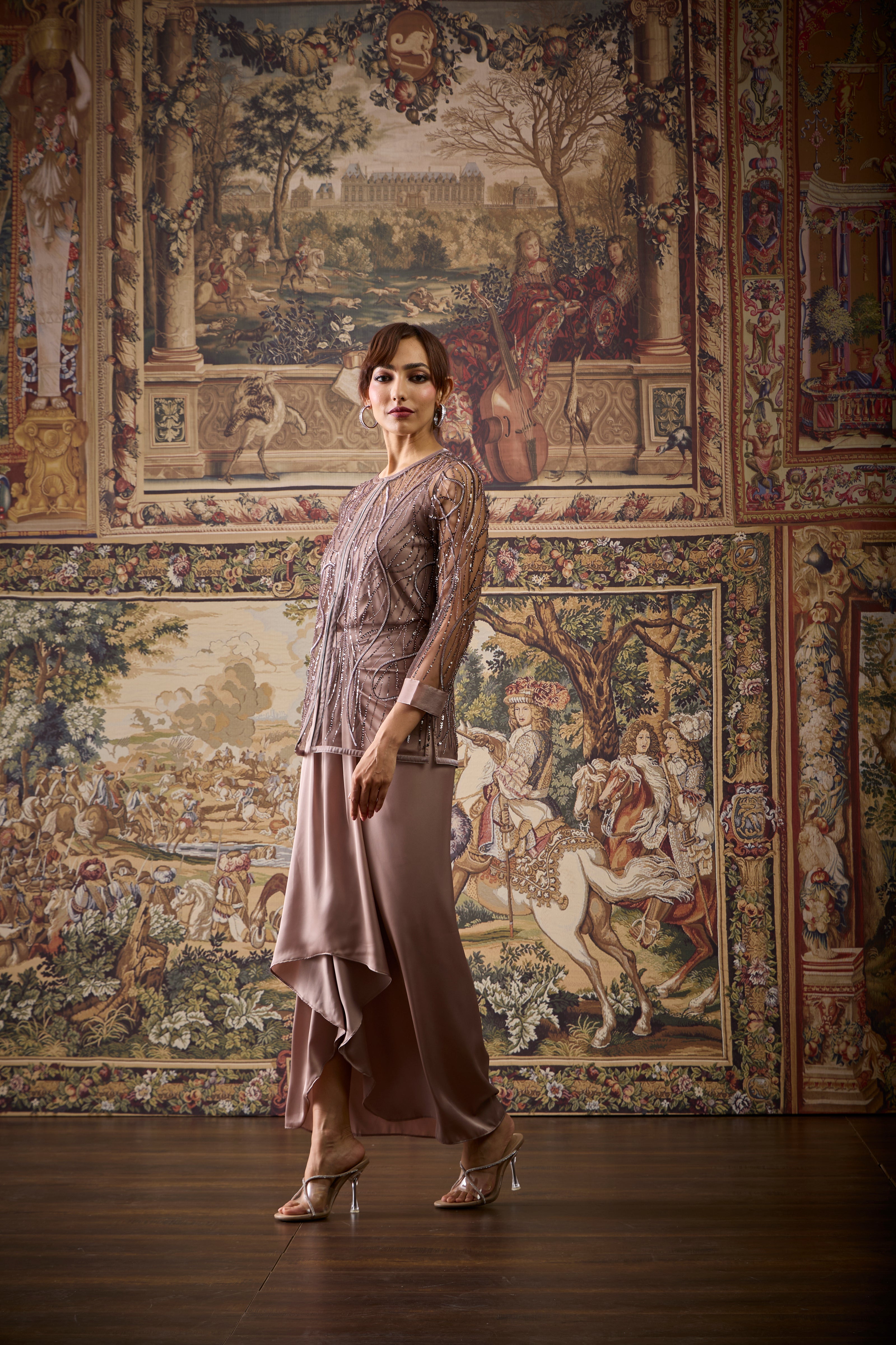 Luxe embroidered jacket with front zip closure, paired with drape style satin skirt. Jacket comes with satin slip.