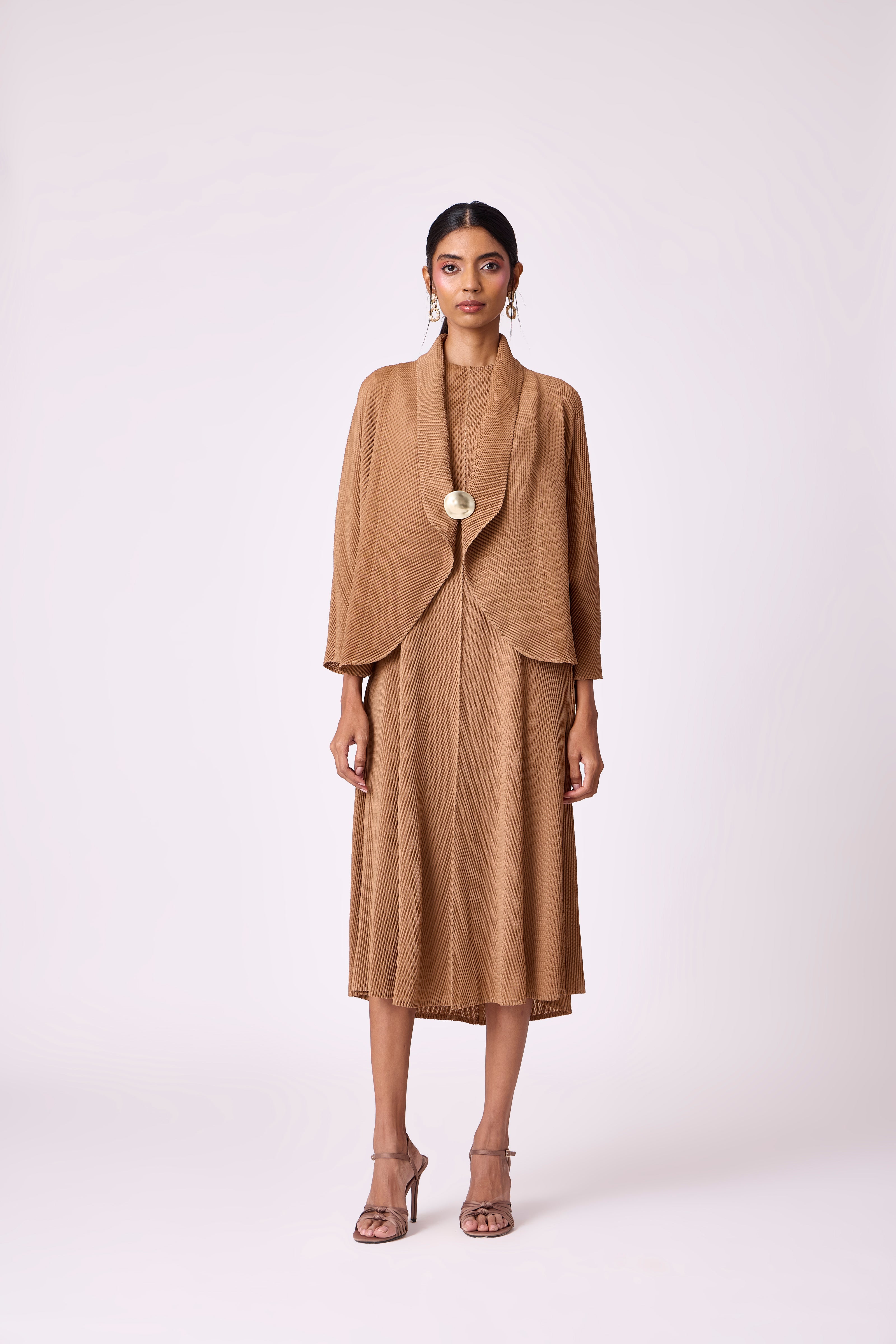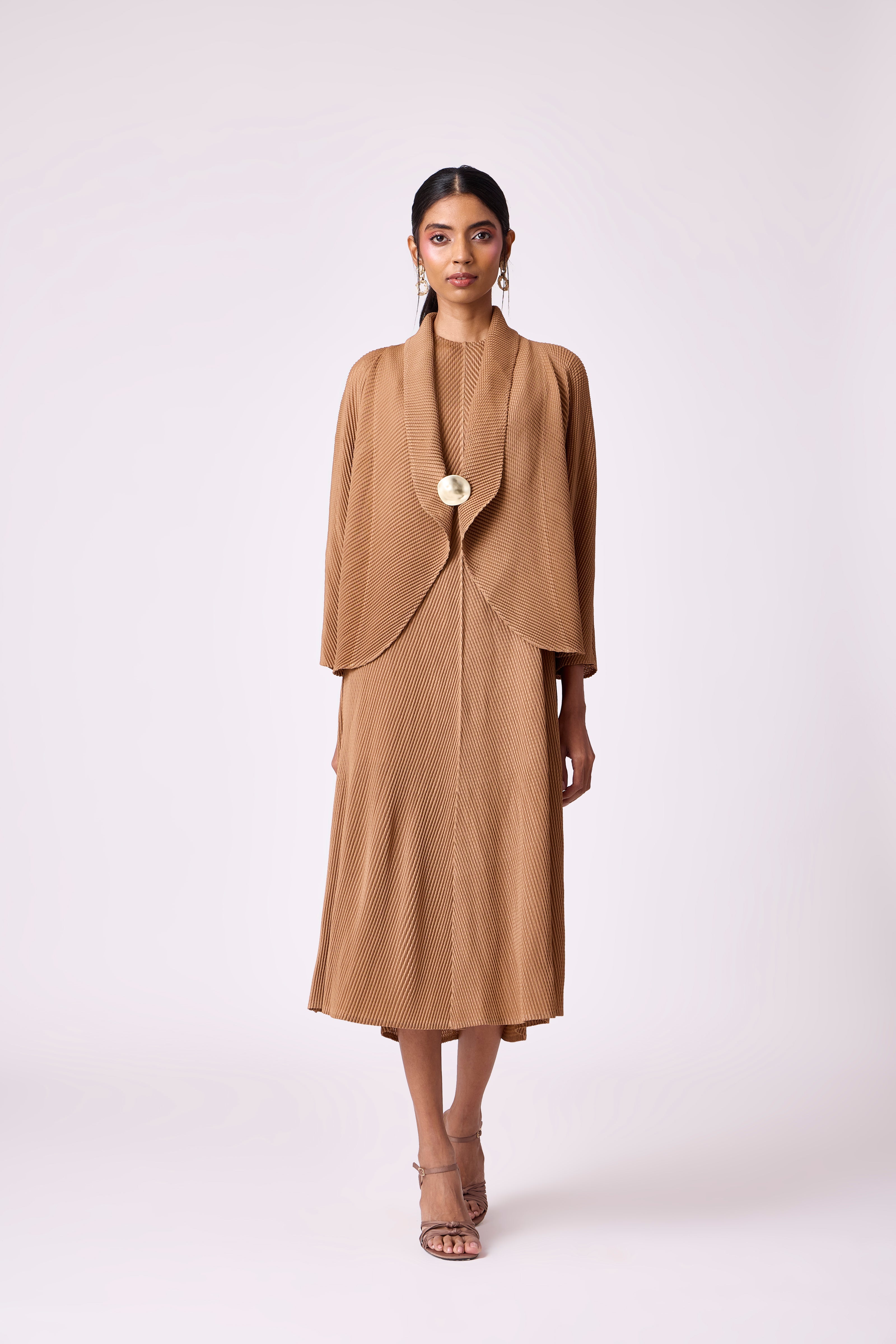 A sleeveless fit and flare dress with a matching batwing cape overlay with a striking matte gold button closure.