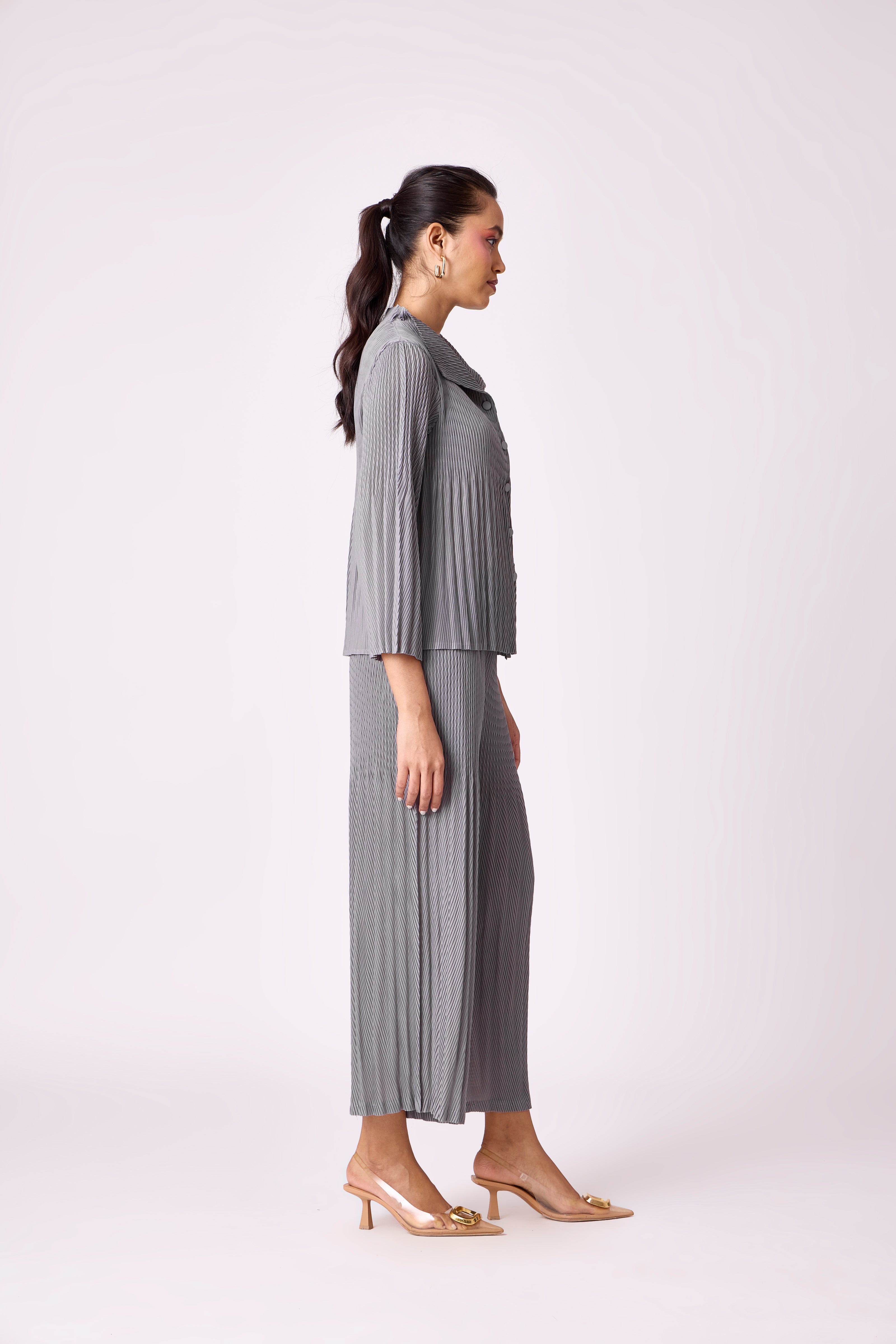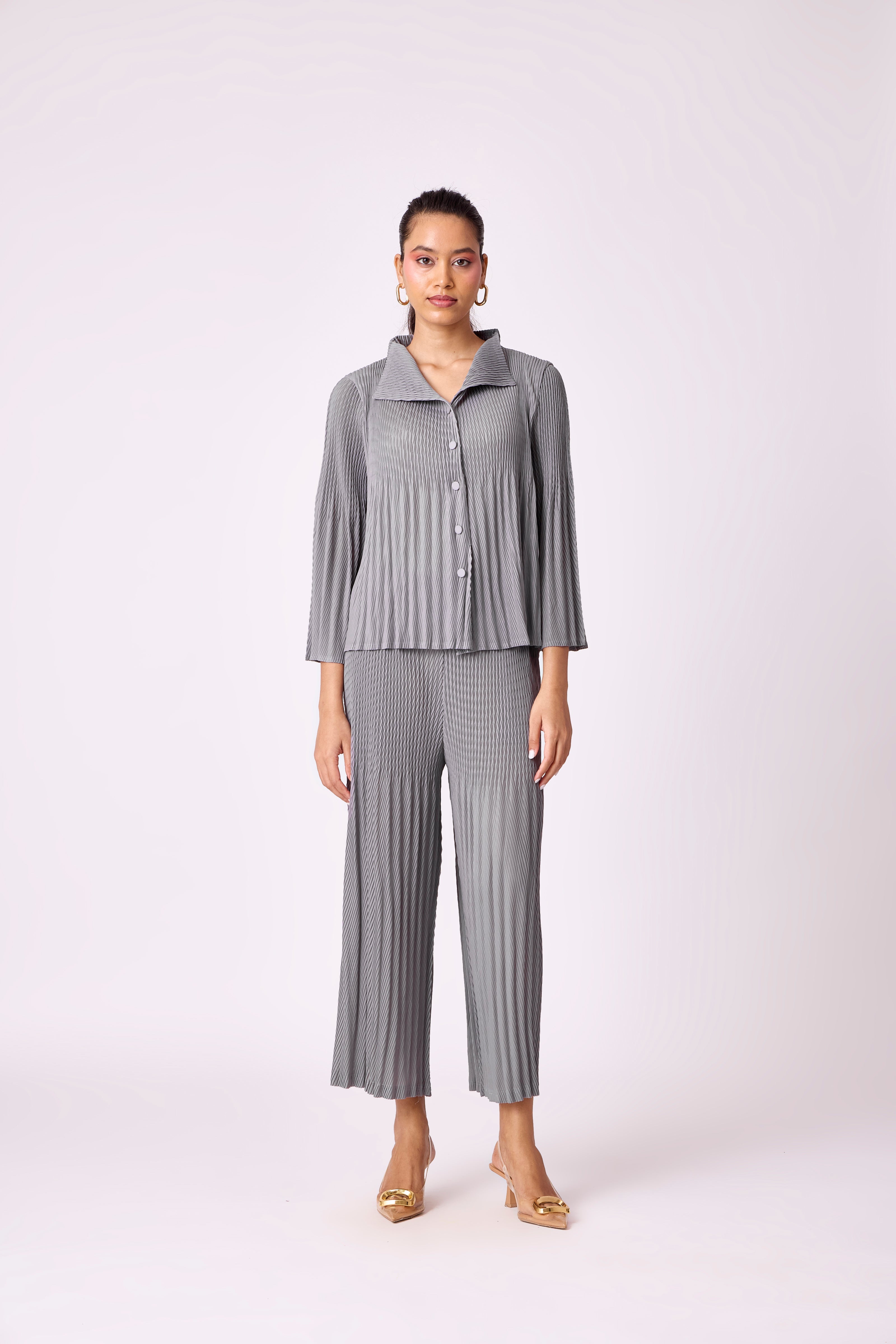 A lightweight pleated shirt and straight-leg pant set with a fluid, easy fit.