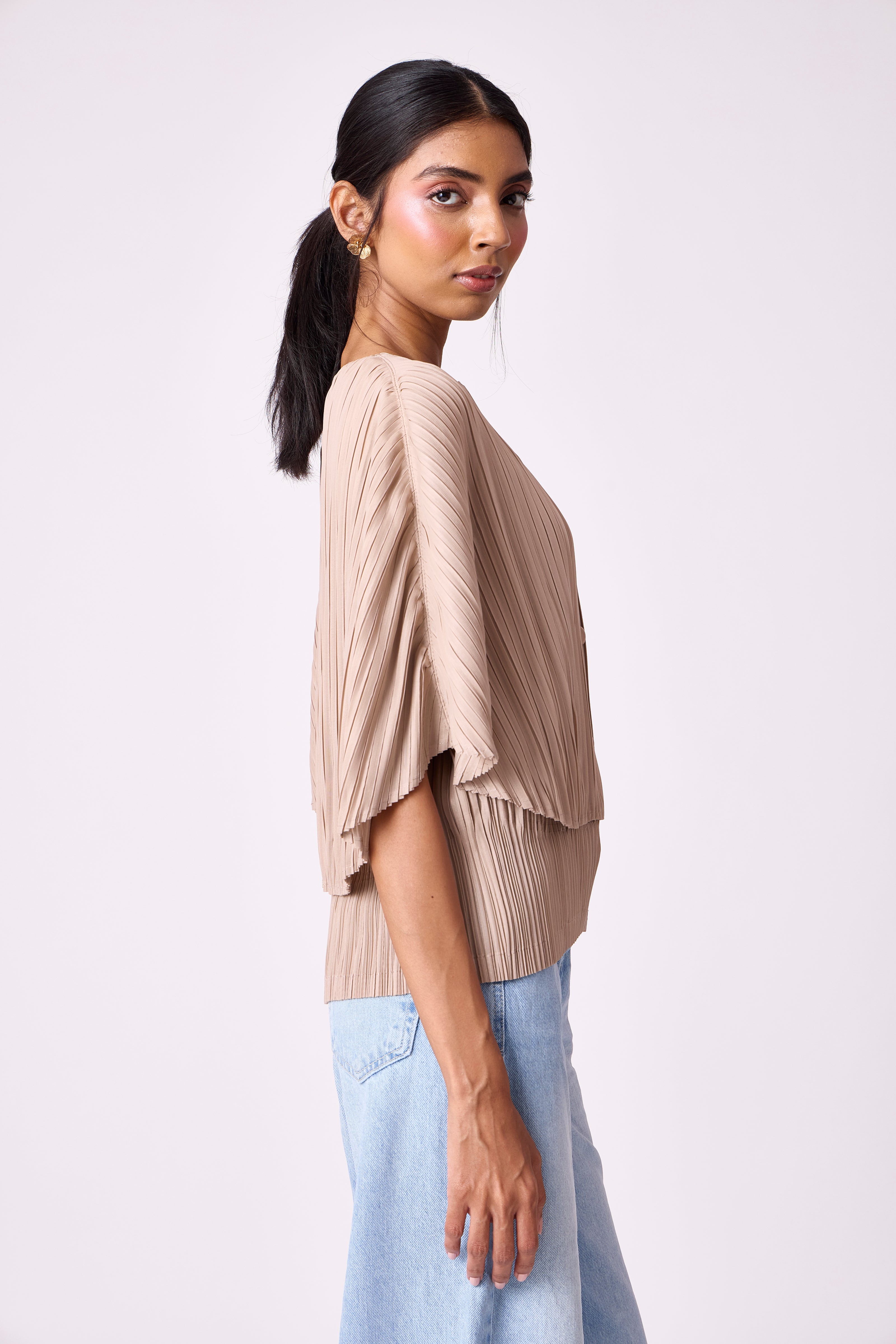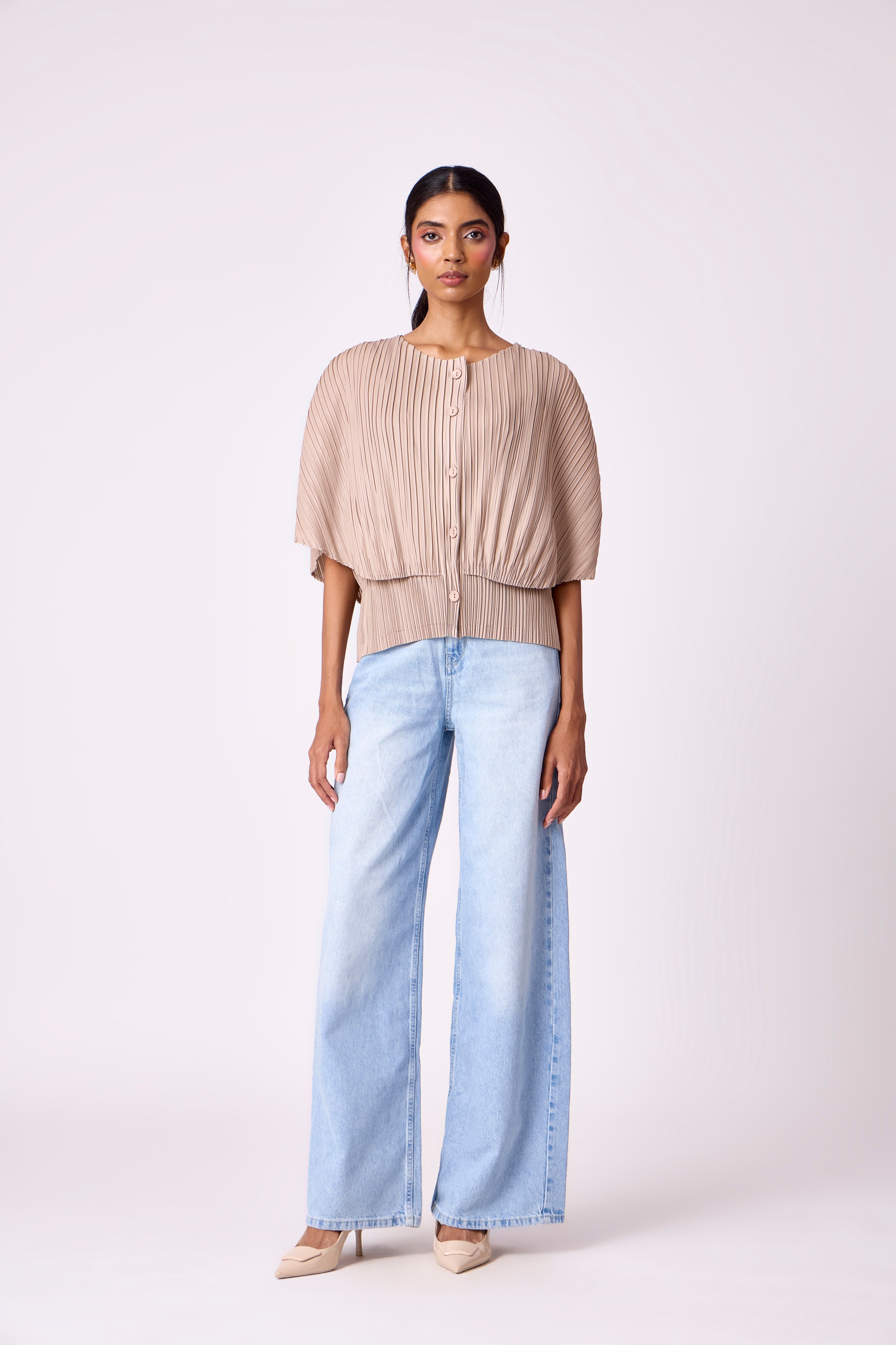 A relaxed pleated top with a front button closure, rounded neckline, and fluid sleeves.
